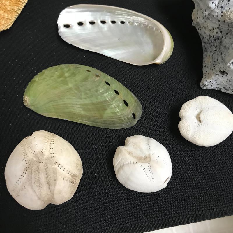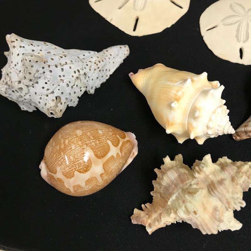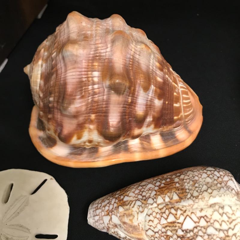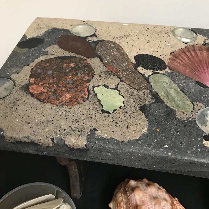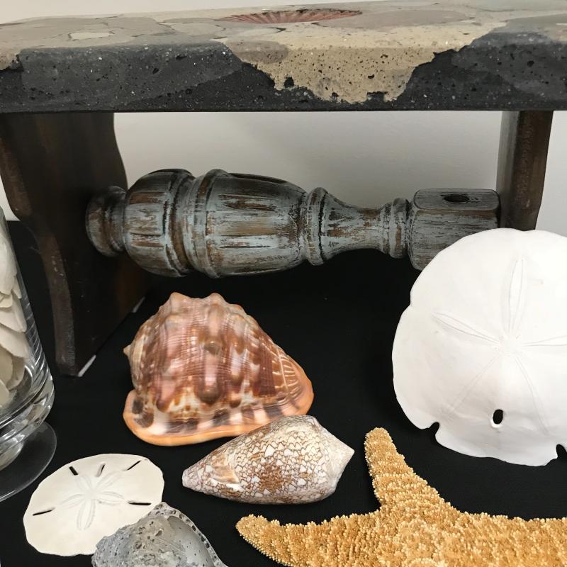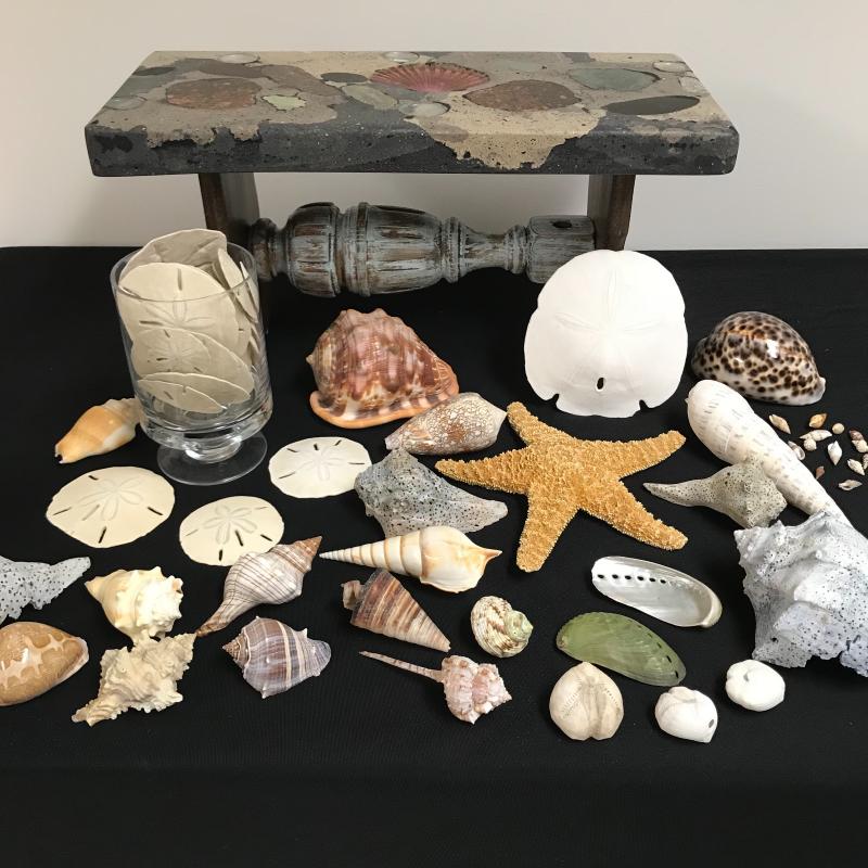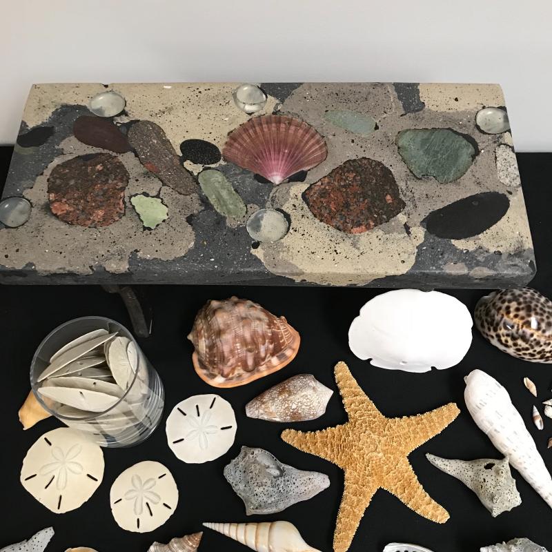 Lot includes dozens of gorgeous sea shells in great condition. Also includes shell stool/display shelf made by an artist who encased shells in concrete to make the top. Very unique piece. Heavy top rests on top of a wooden base. See pics. No shipping available. Local pickup only in Arden, NC.