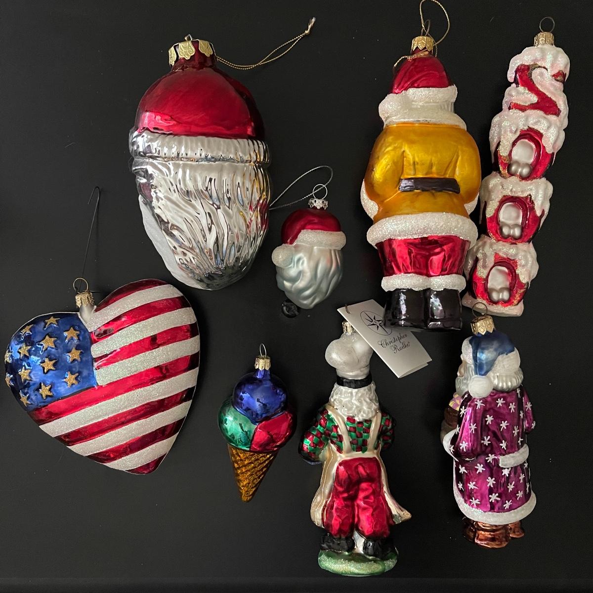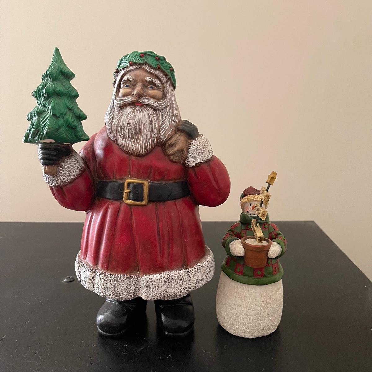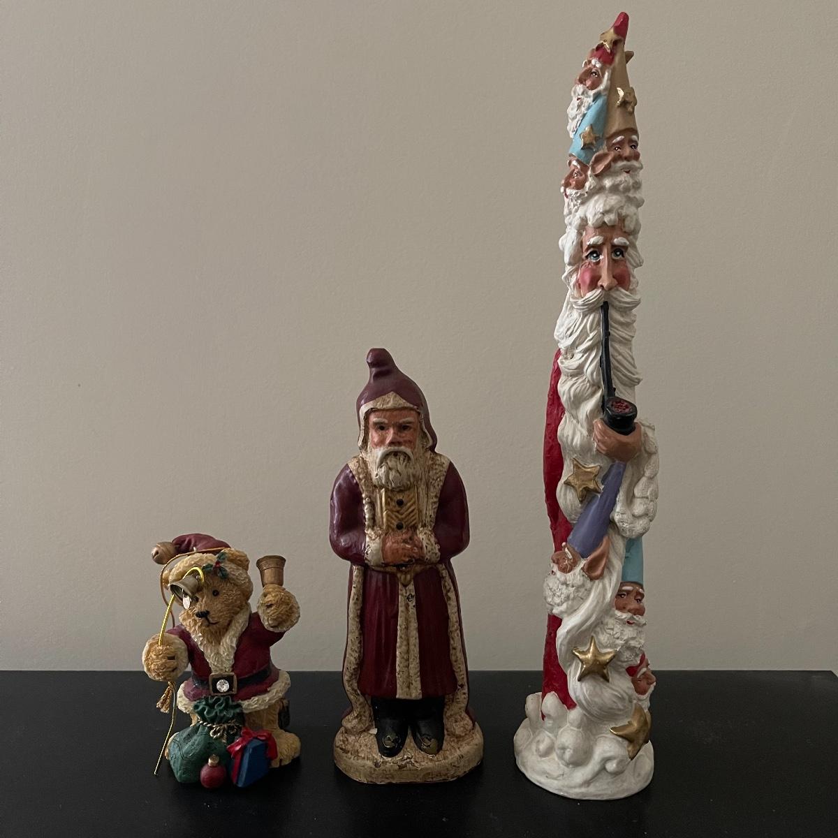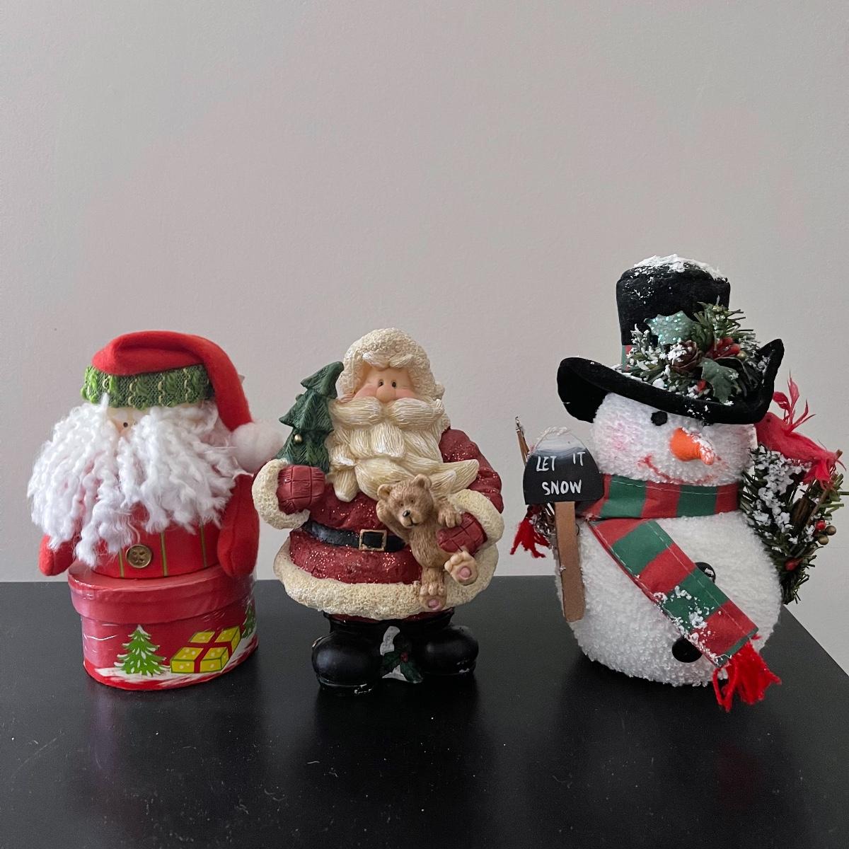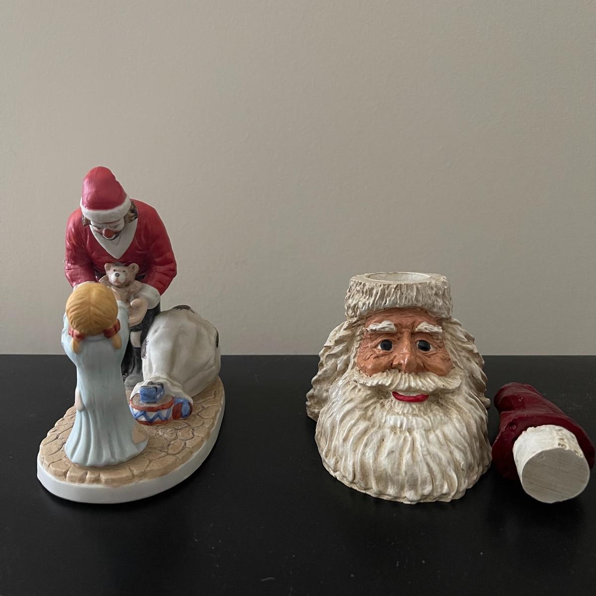 Christmas is coming early this year! This large Christmas lot includes a variety of Christmas decor, ornaments, table linens, candles, craft and baking books, stocking hangers, small baskets, and other items. The decorative ornaments of Santa Claus and more are lightweight and have glitter; the rest of the ornaments are an assortment of colored and clear spheres. There are three small tables that are 20” tall and have 8” x 8” tops. Each table displays different winter scenery. Five small decorative houses that state they are hand-painted and are from 1995 Santa’s Best, three glass hummingbird ornaments, “Angel of the Kitchen” Willow Tree figurine, and a selection of Santa figurines are all examples of the goodies in this lot.