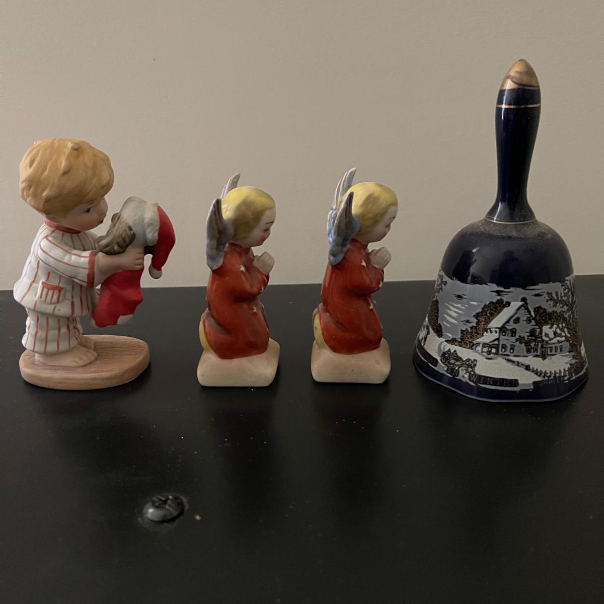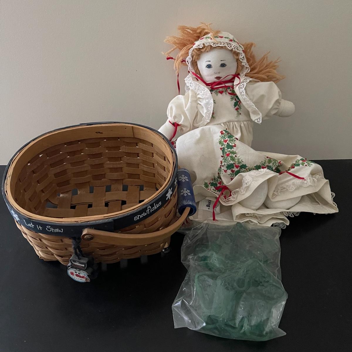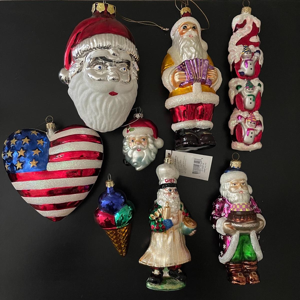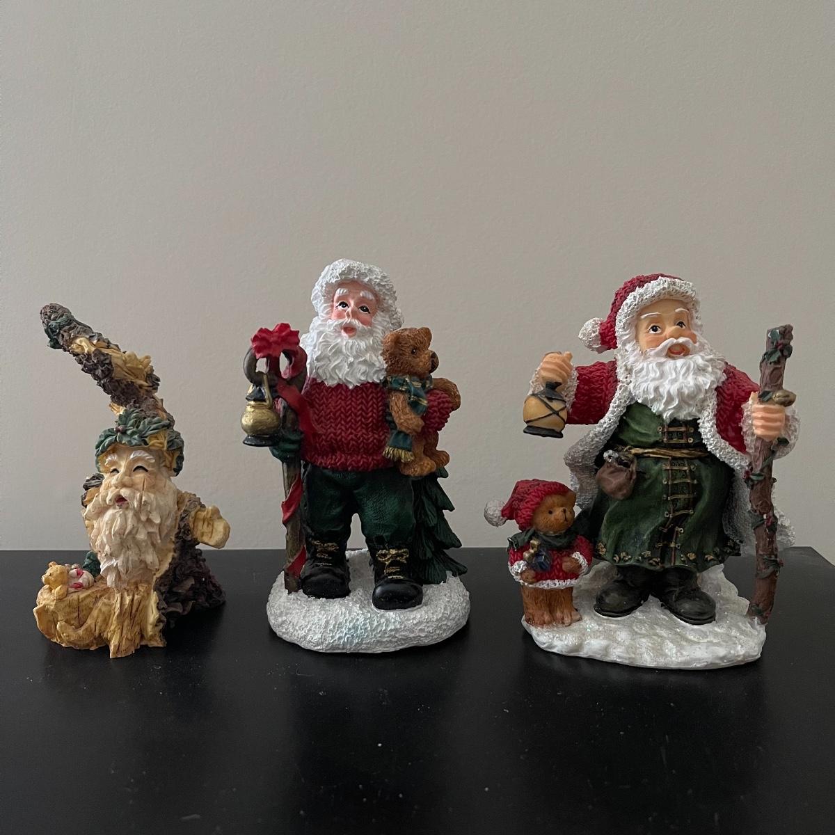 Christmas is coming early this year! This large Christmas lot includes a variety of Christmas decor, ornaments, table linens, candles, craft and baking books, stocking hangers, small baskets, and other items. The decorative ornaments of Santa Claus and more are lightweight and have glitter; the rest of the ornaments are an assortment of colored and clear spheres. There are three small tables that are 20” tall and have 8” x 8” tops. Each table displays different winter scenery. Five small decorative houses that state they are hand-painted and are from 1995 Santa’s Best, three glass hummingbird ornaments, “Angel of the Kitchen” Willow Tree figurine, and a selection of Santa figurines are all examples of the goodies in this lot.