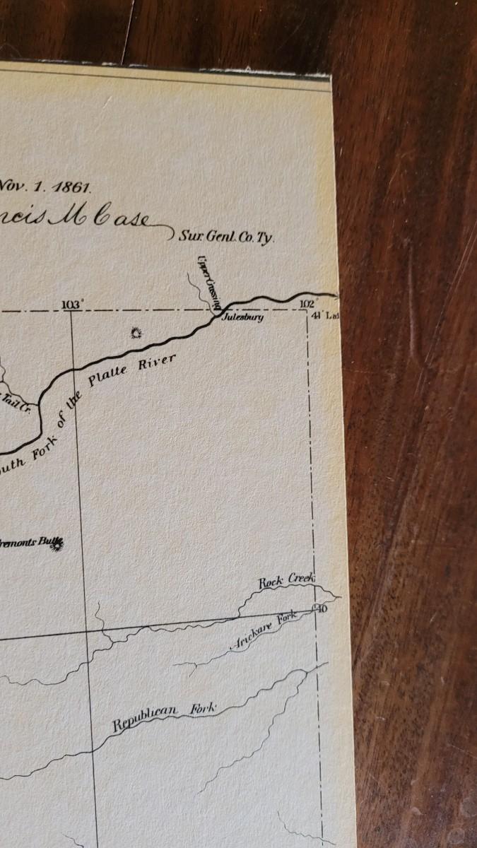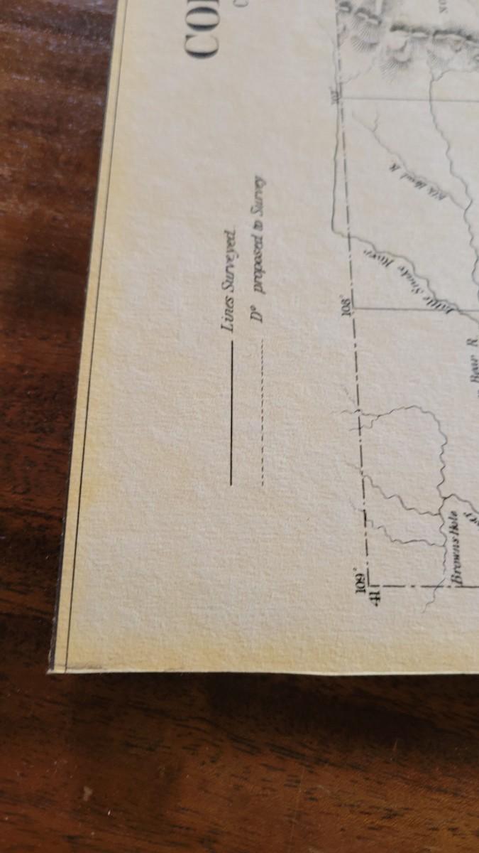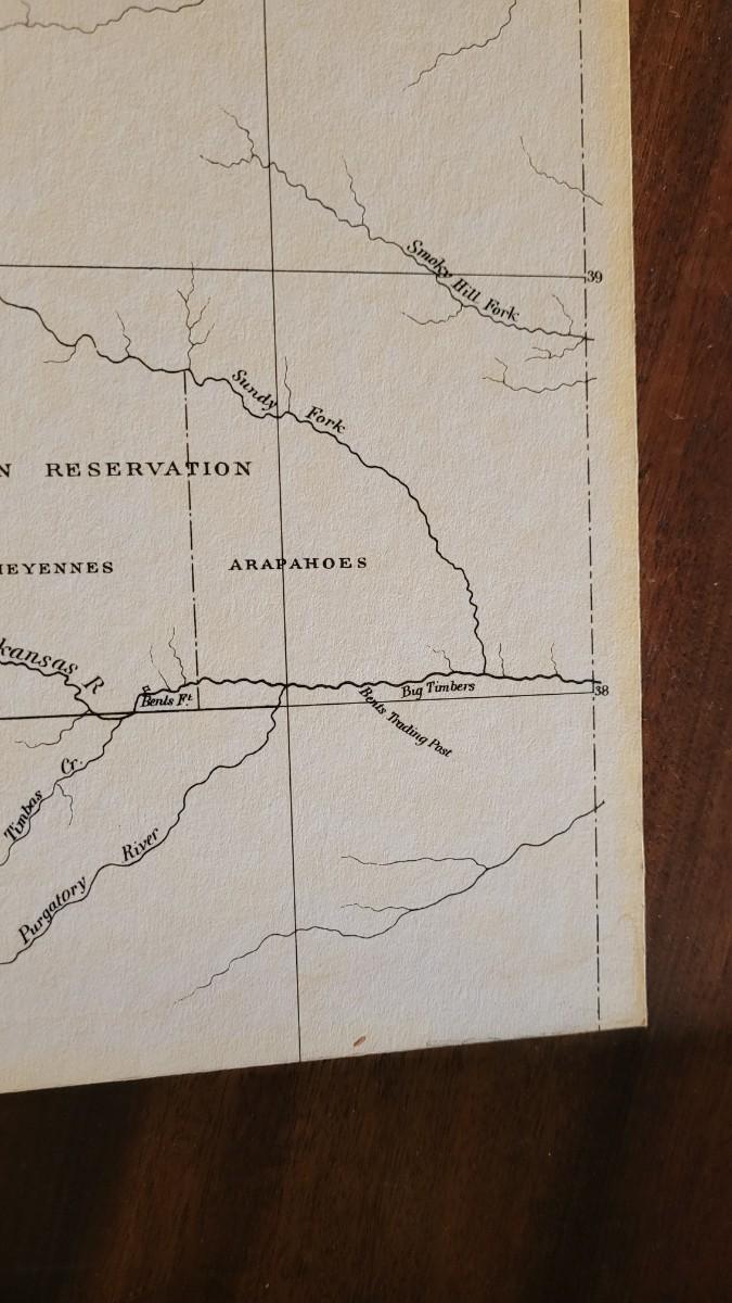 The map shows the early territorial surveys, an early regional depiction of the Rockies with some place names, as well as Rivers, the Cheyenne and Arapahoe Reservations, mountains, Bent's Fort, Colorado City, Denver, Henderson's Ranch, Ft. St. Vrain, Golden City, Central City, Bradford, Hamilton, Jefferson, Ft. Garland, Gagosa, and handful of other place names. This example has been flattened and de-acidified, with attractive modern color added, and archivally backed with Japan paper. A nice example of this notoriously fragile map.