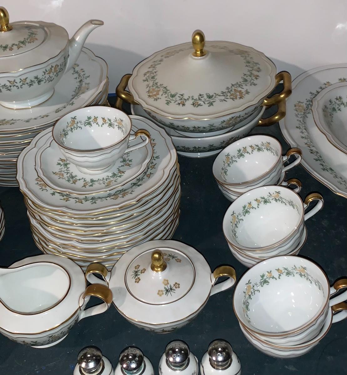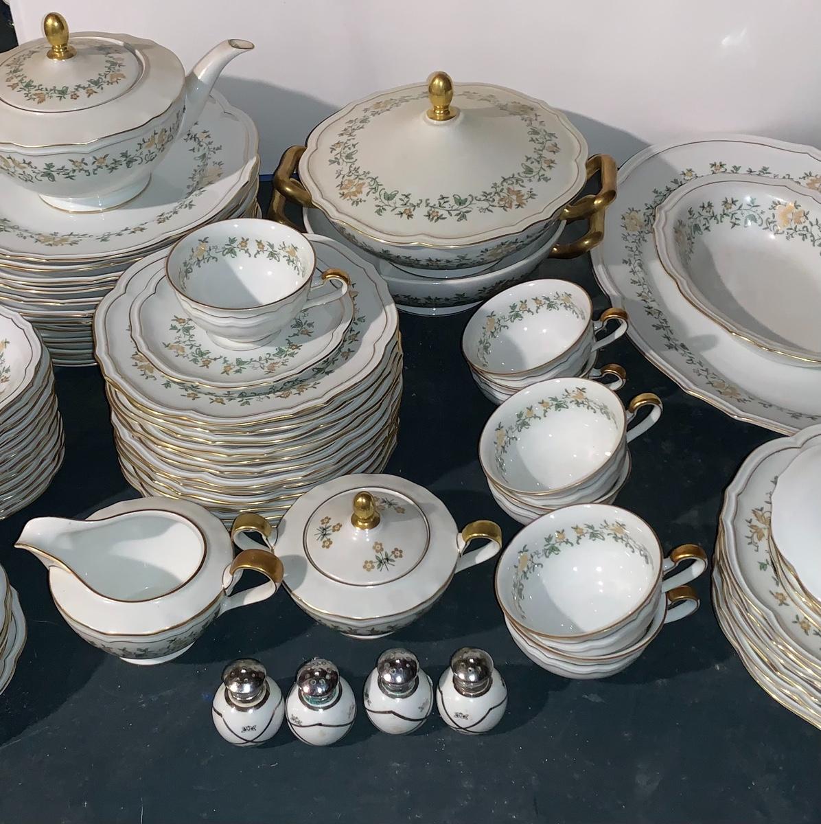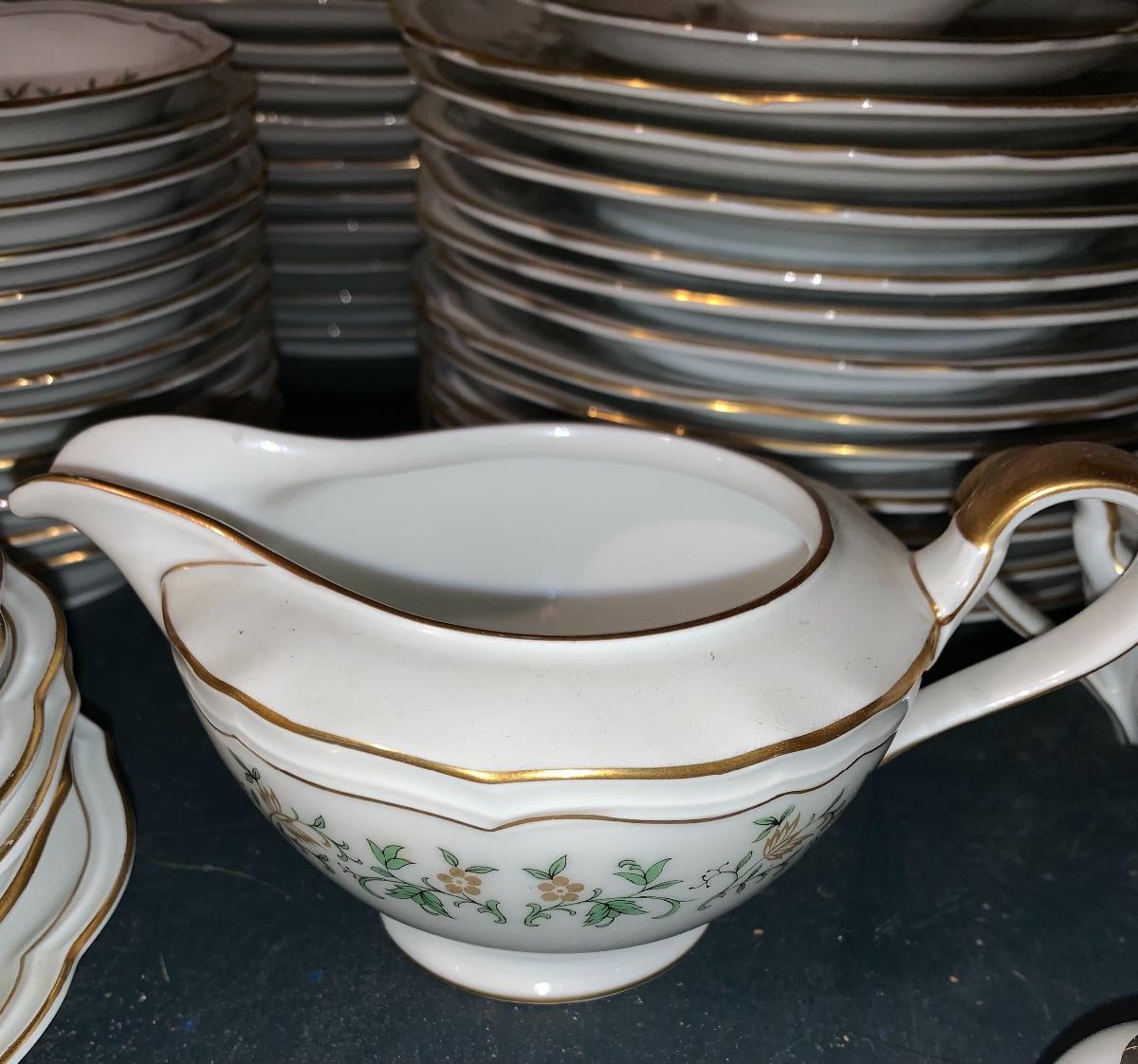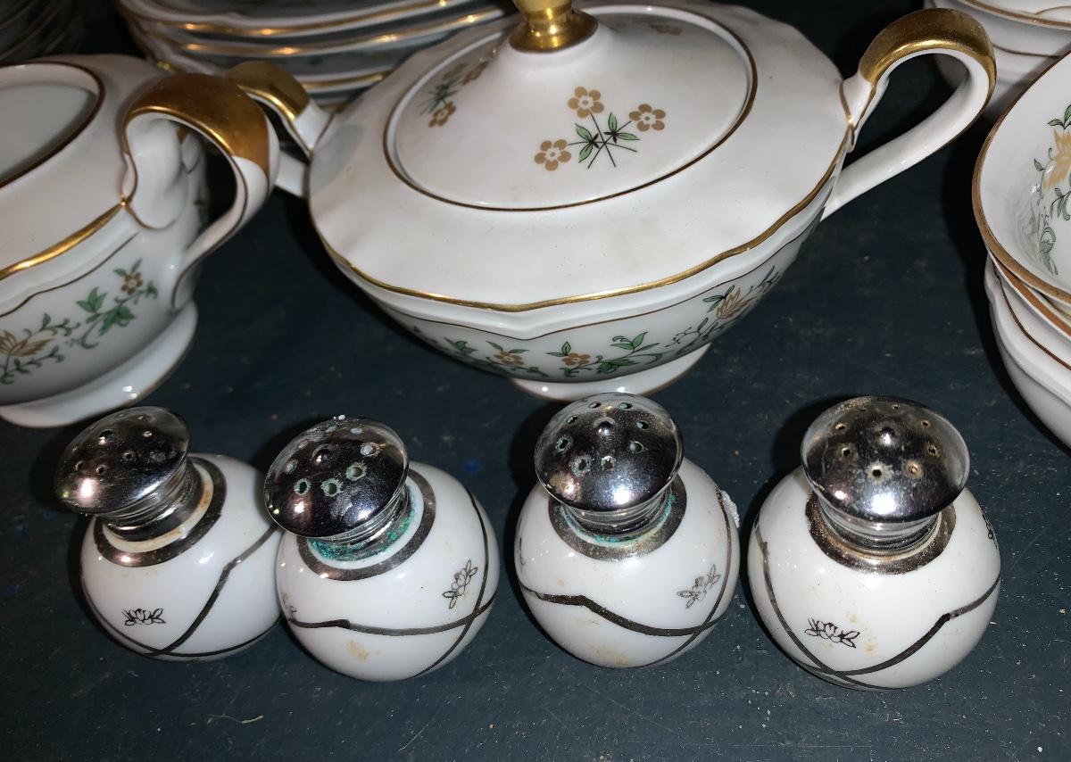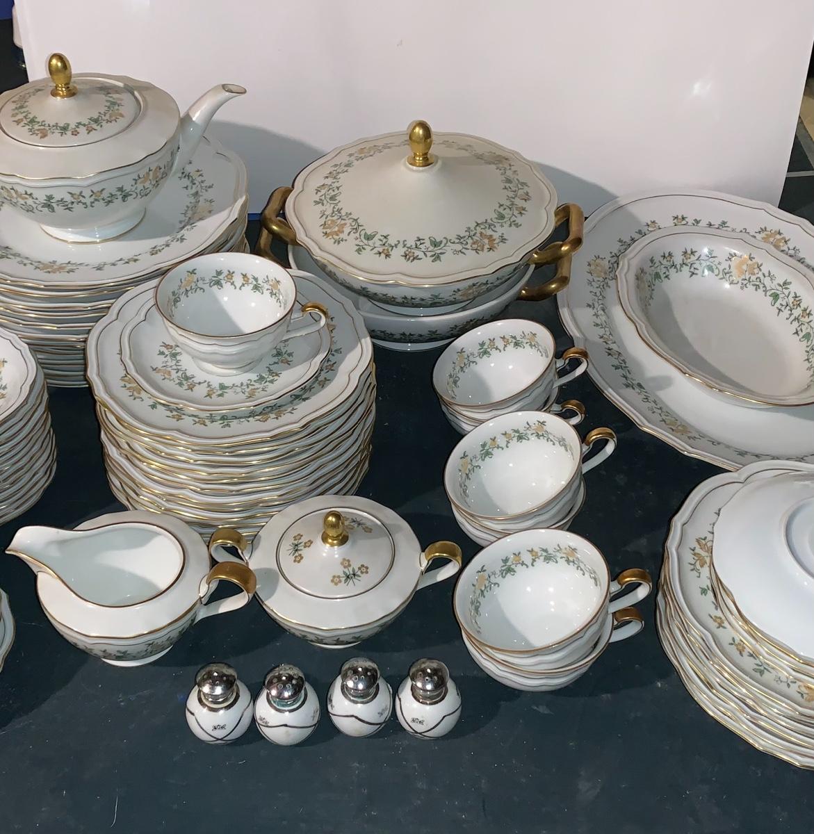 Beautiful large set of Baronet Bavaria-Germany China, 11 dinner plates,12 salad,12 small bowls, 7 tea cups, 12 saucers., 6 soup bowls, sugar & creamer, 2 sets of salt & pepper, teapot, along with serving pieces