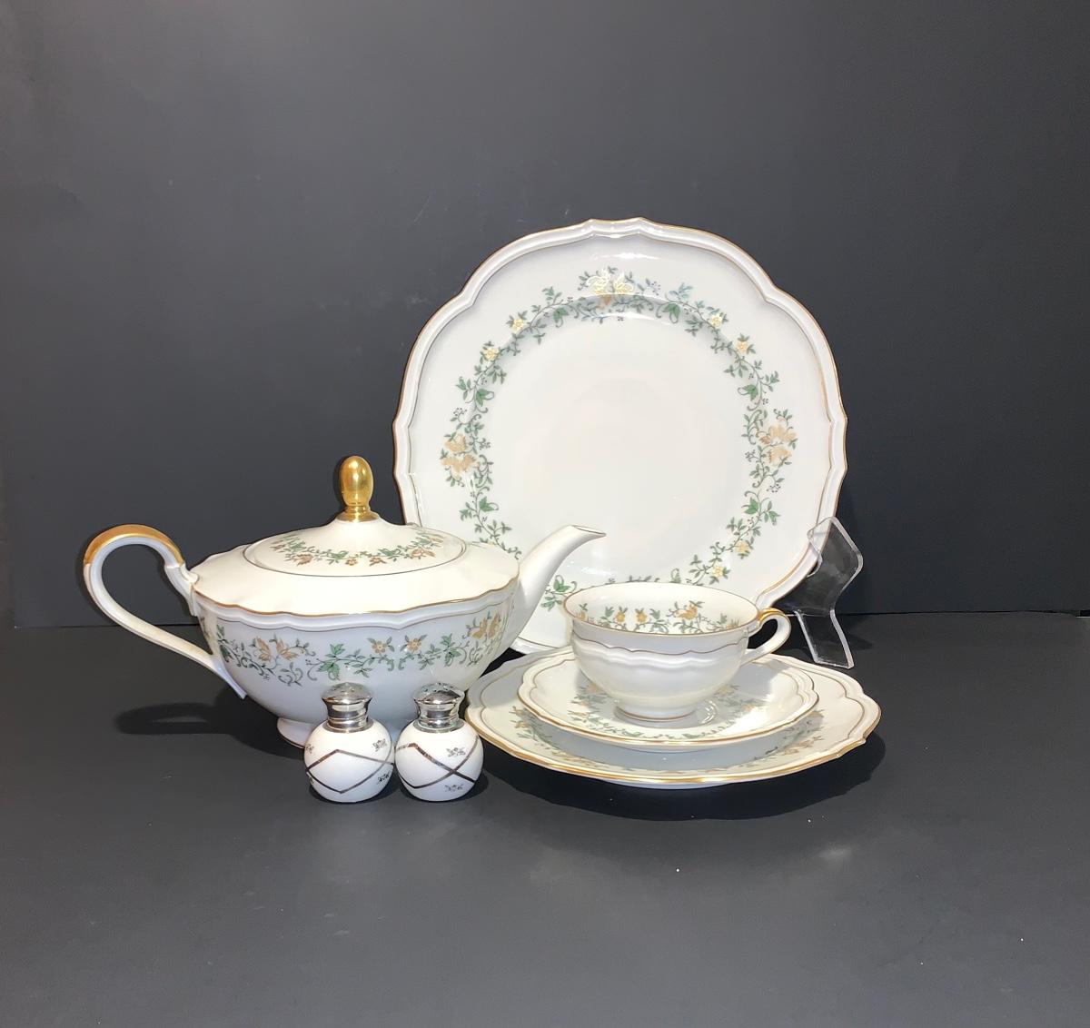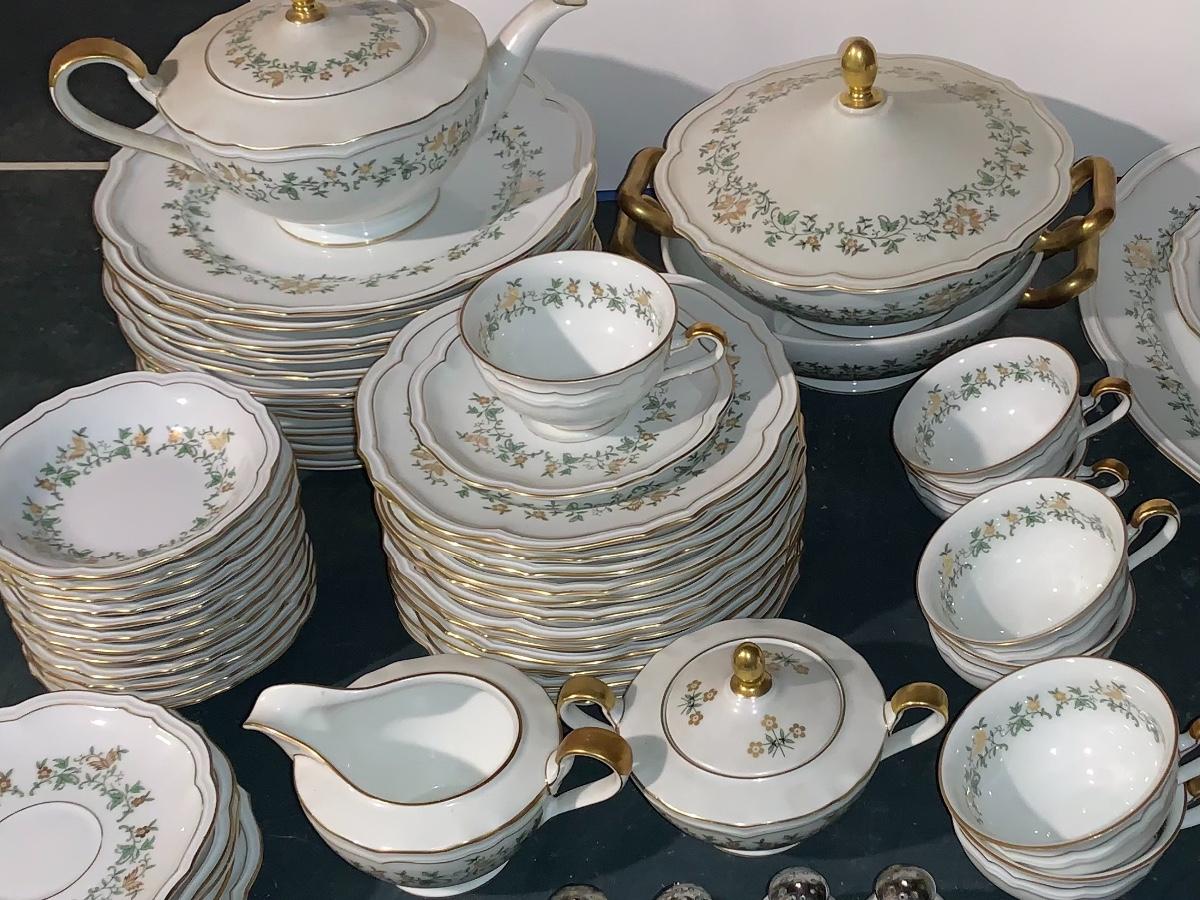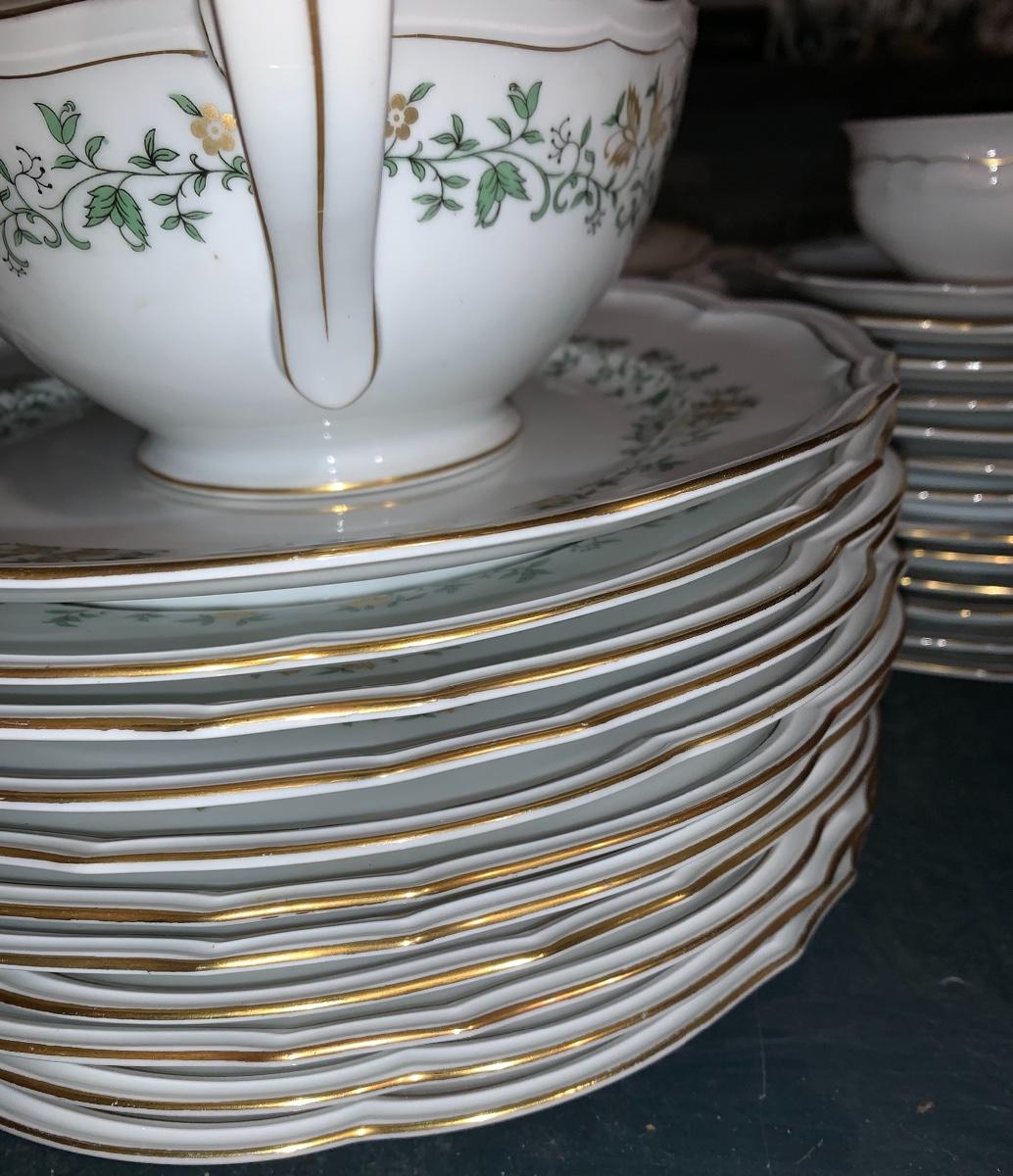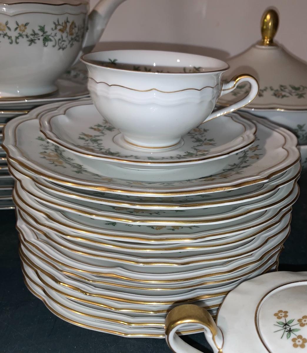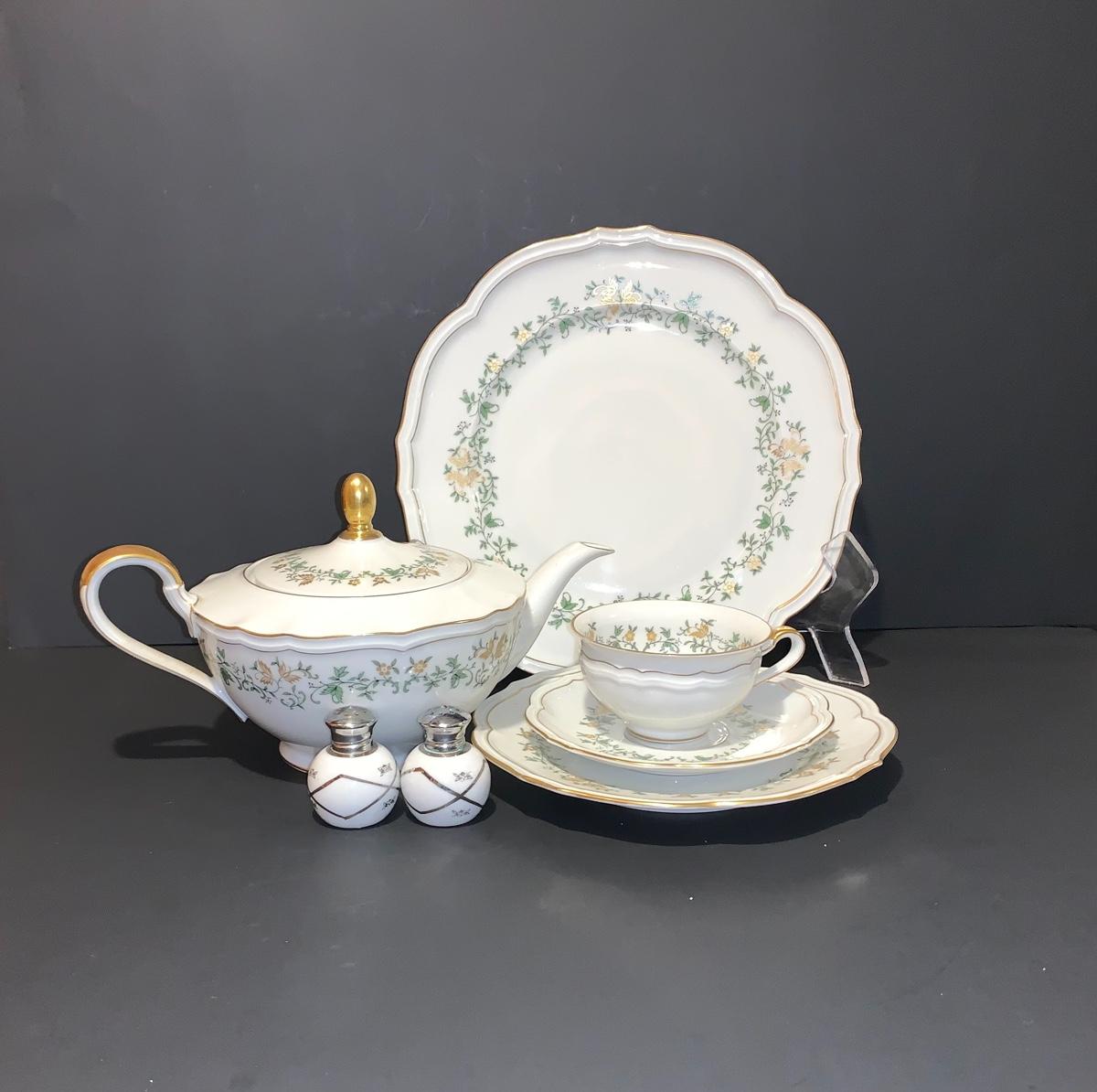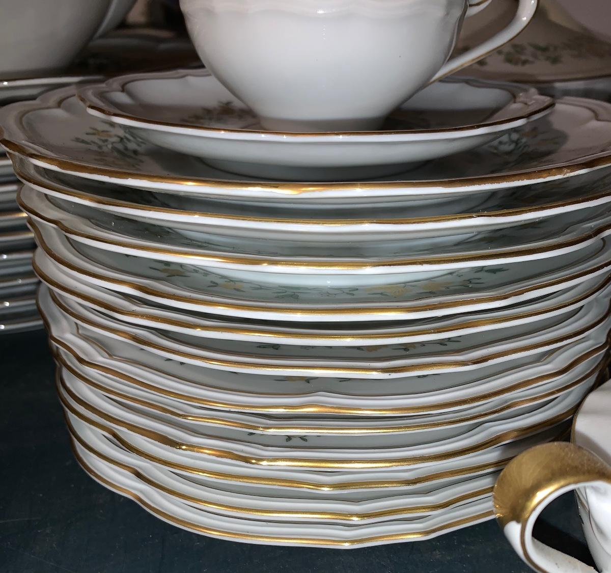 Beautiful large set of Baronet Bavaria-Germany China, 11 dinner plates,12 salad,12 small bowls, 7 tea cups, 12 saucers., 6 soup bowls, sugar & creamer, 2 sets of salt & pepper, teapot, along with serving pieces