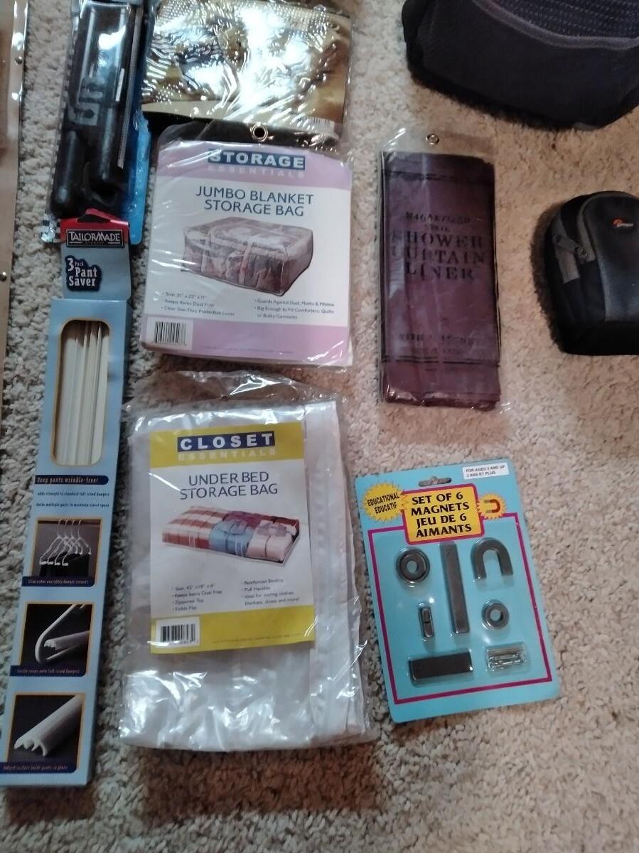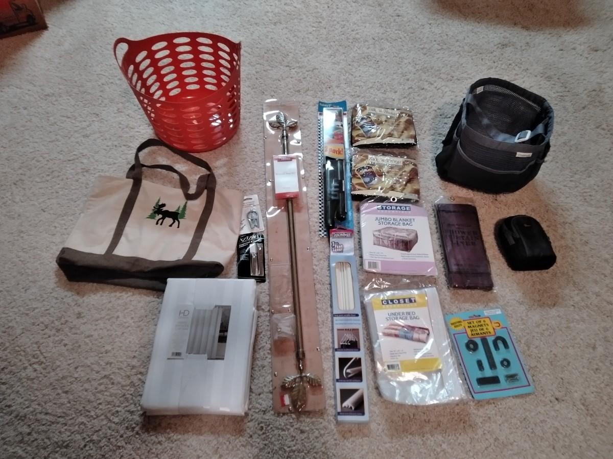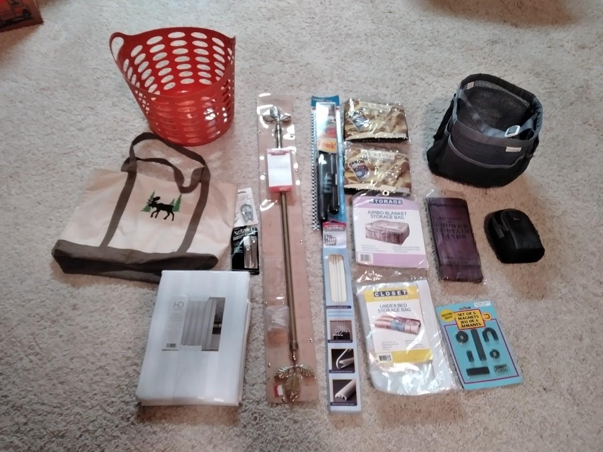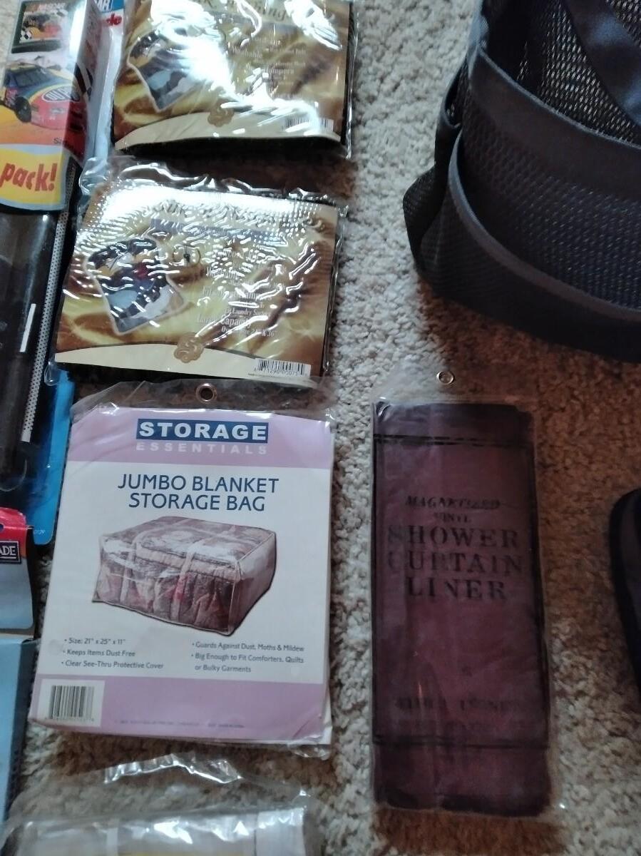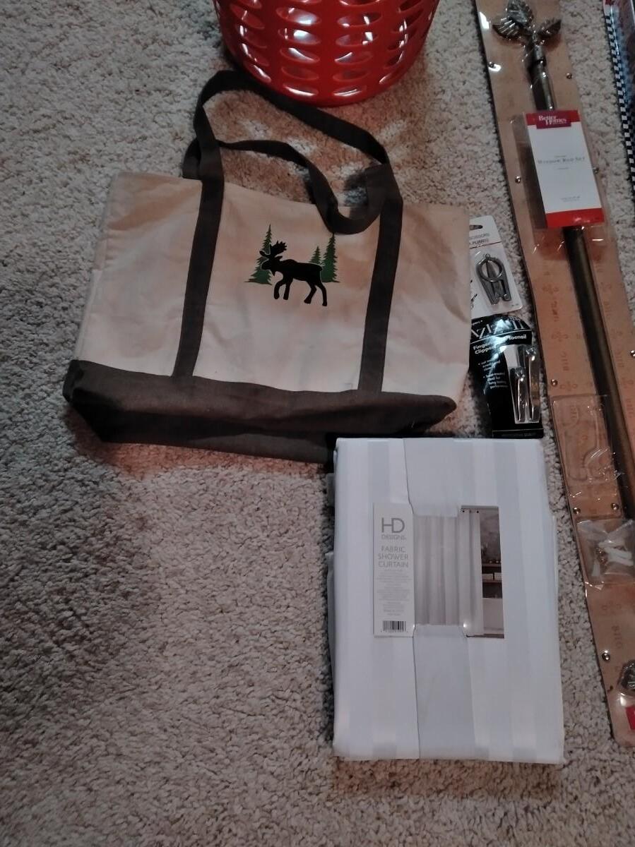 BASKETS, BAG WITH MOOSE, NEW CURTAIN ROD, SHAOWER CURTAIN, STORAGE BAGS, AND MORE