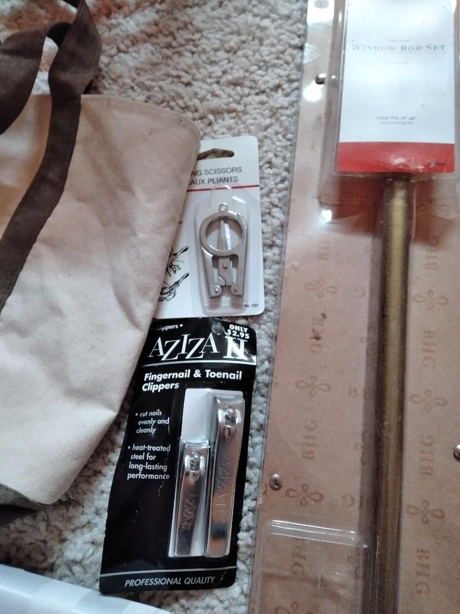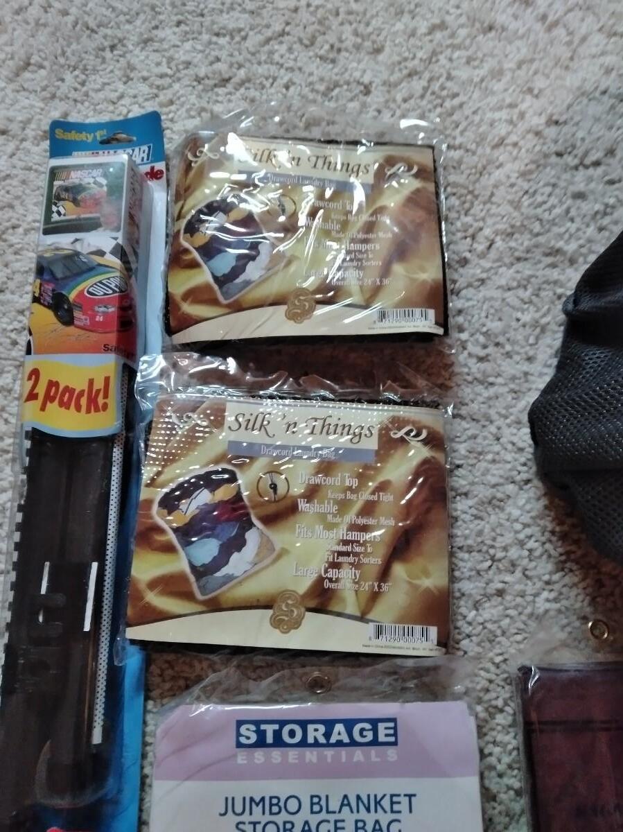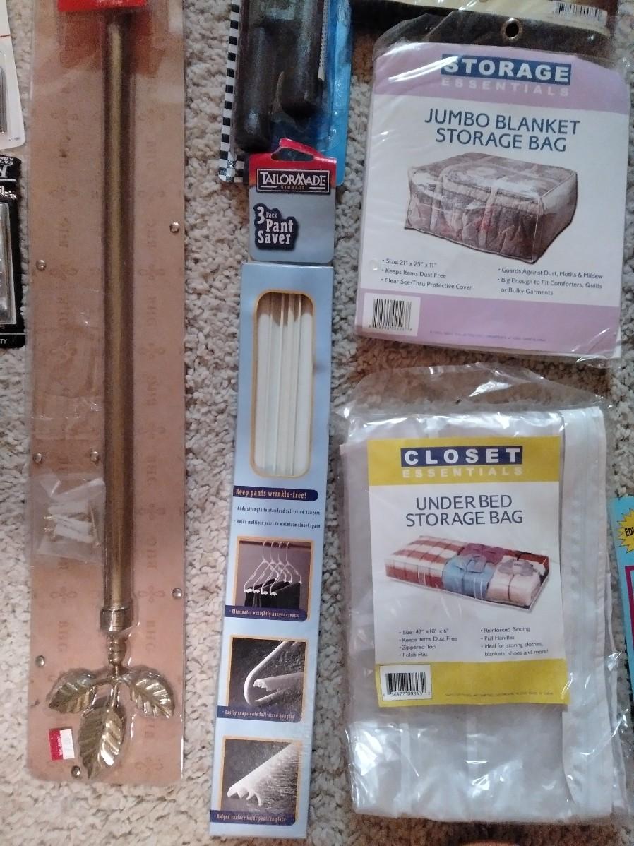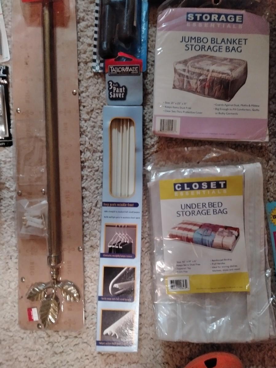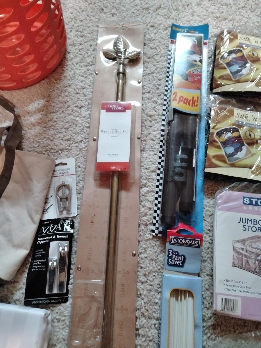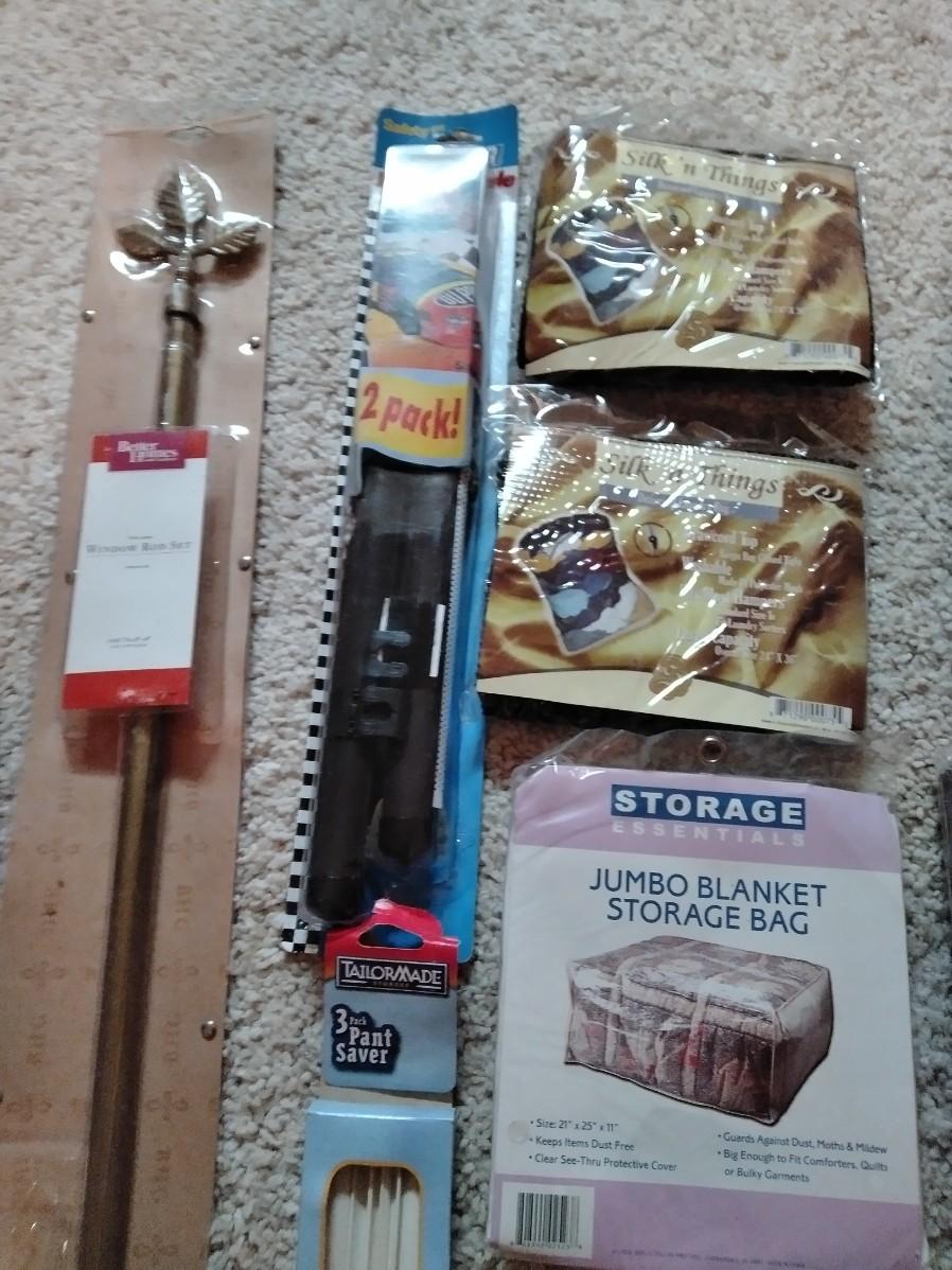 BASKETS, BAG WITH MOOSE, NEW CURTAIN ROD, SHAOWER CURTAIN, STORAGE BAGS, AND MORE