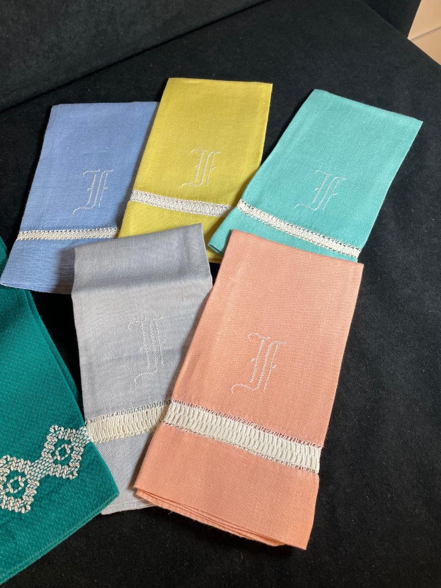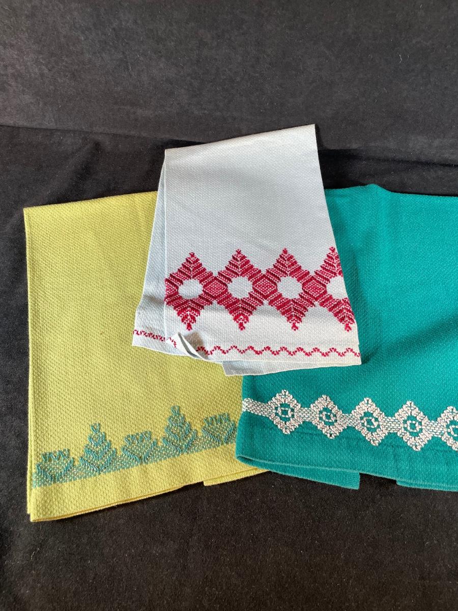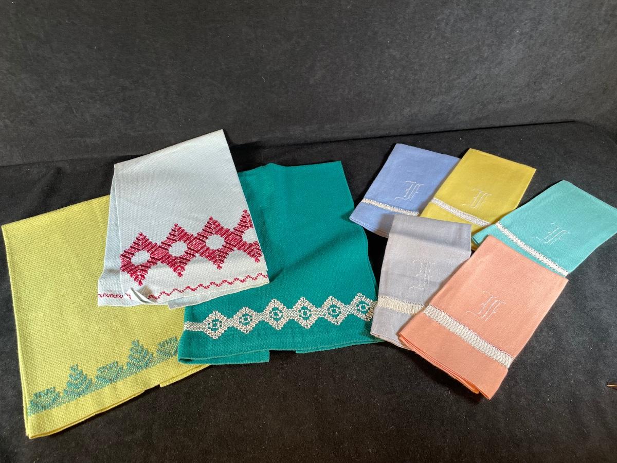 three embroidered cotton dish towels, set of five monogrammed linen tea towels. Excellent condition