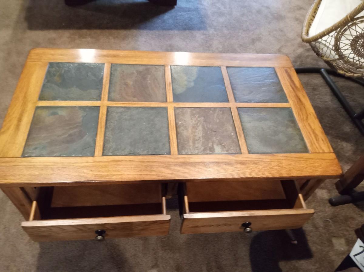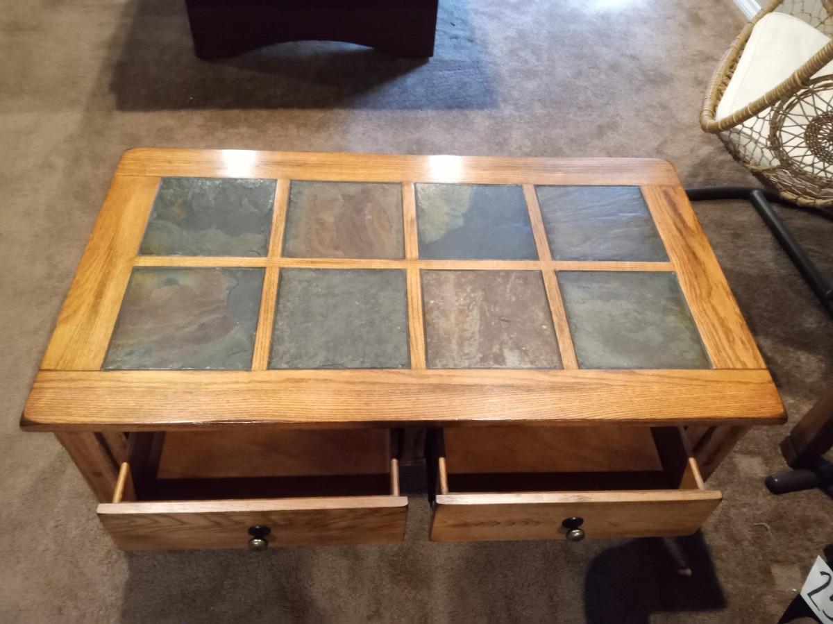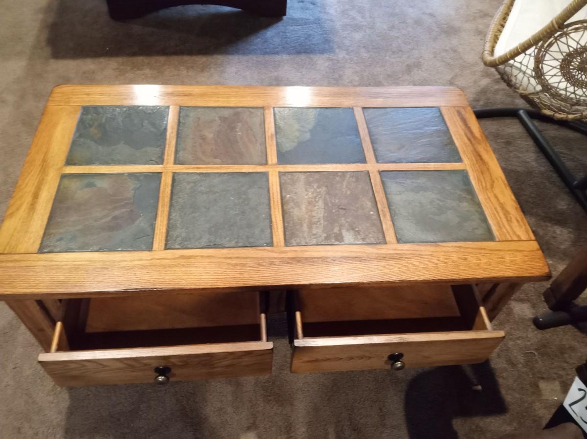 LOT 253  COFFEE TABLE WITH TRAVERTINE TOP AND 2 DRAWERS