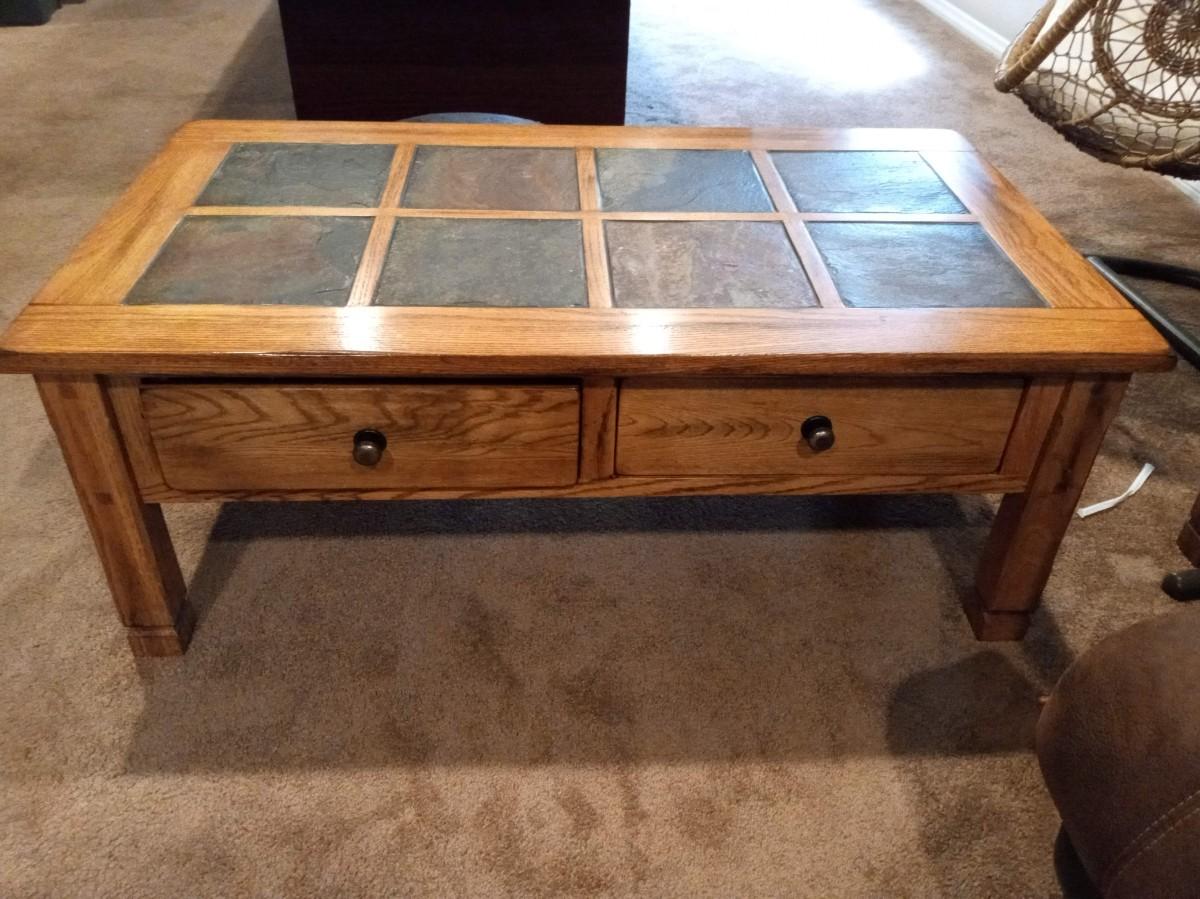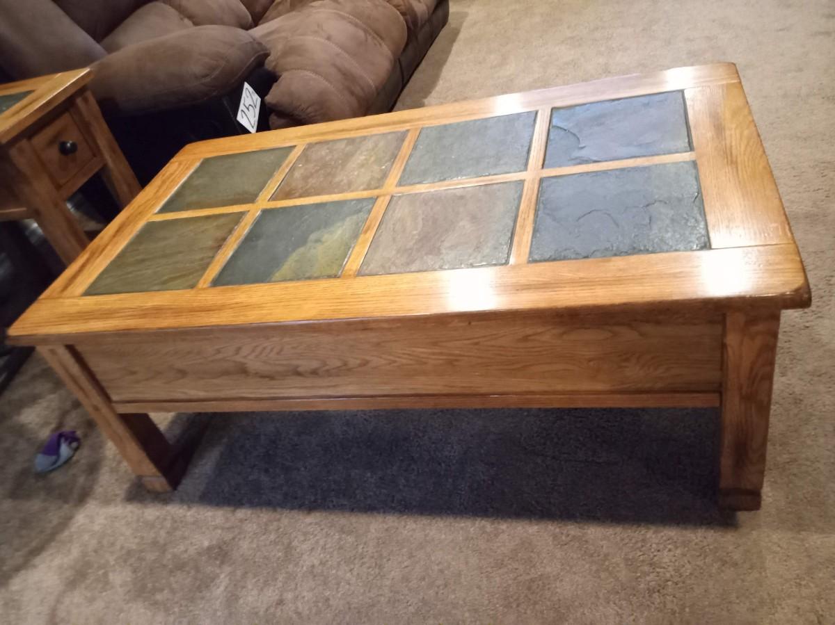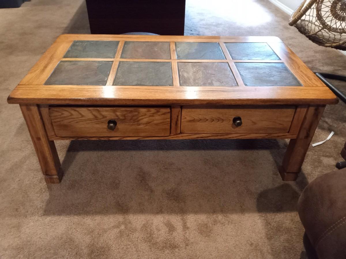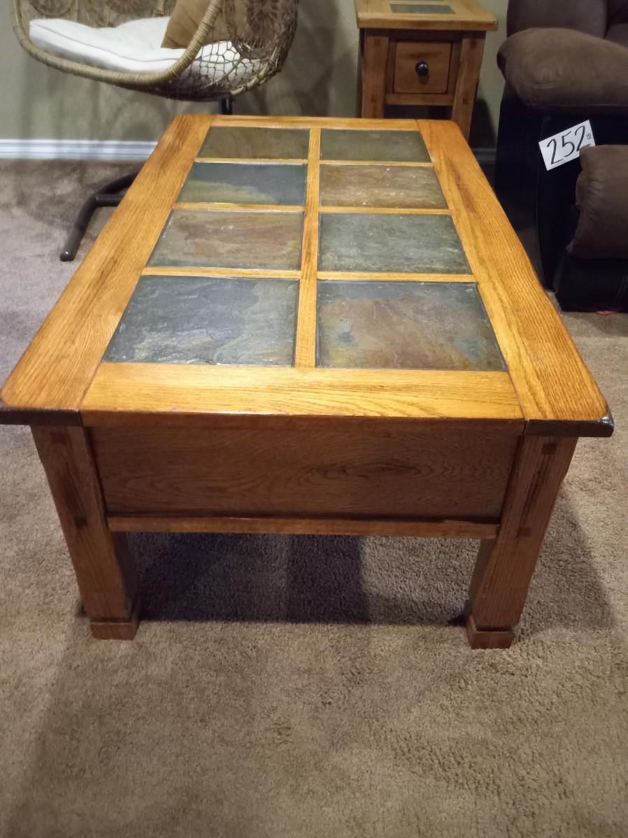 LOT 253  COFFEE TABLE WITH TRAVERTINE TOP AND 2 DRAWERS