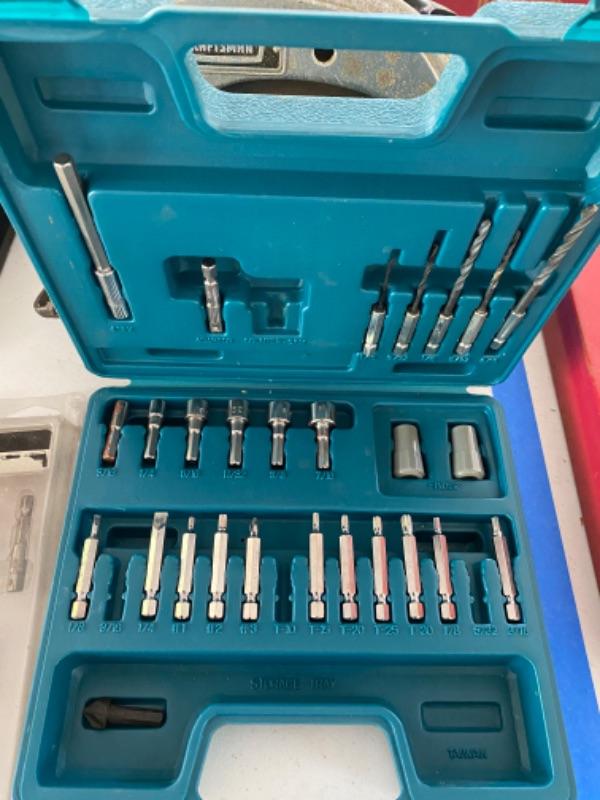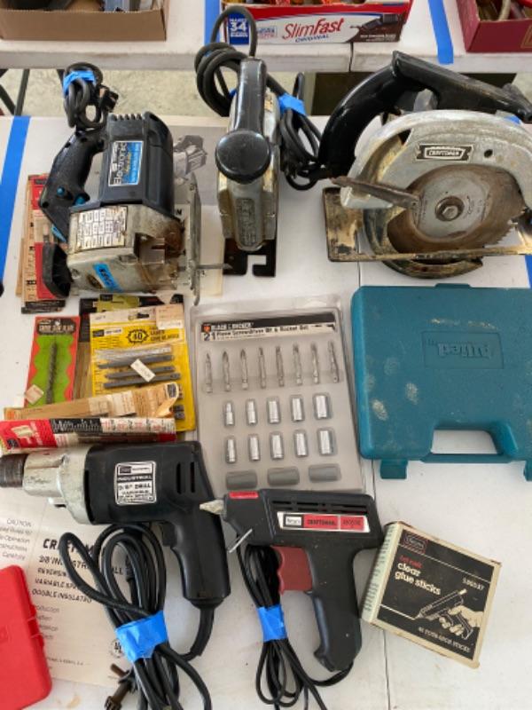 7” Circular Saw, 3 speed Sabre saw , electronic scrol saw, saw blades, craftsman variable dual speed reversible drill , high speed drill bit set, hot glue gun with glue sticks, black and decker 21pc. Screw driver bit and 27 pc. socket set