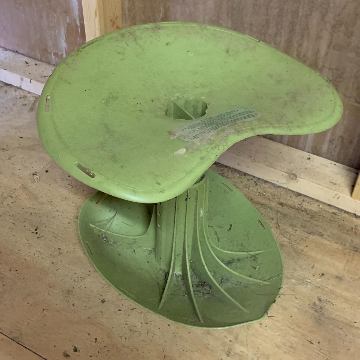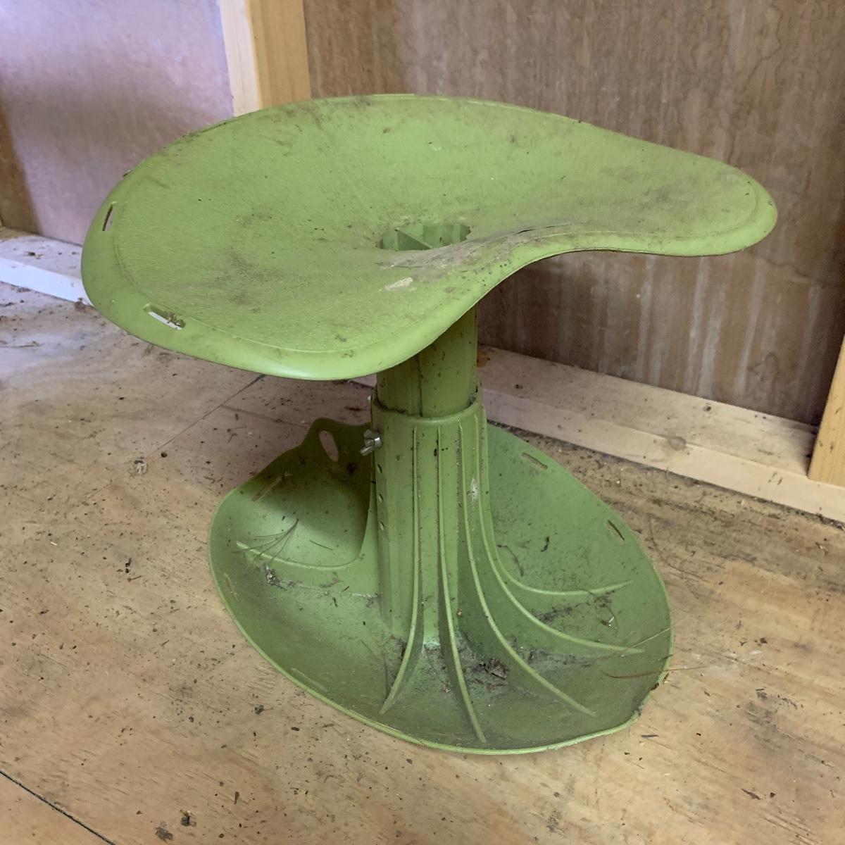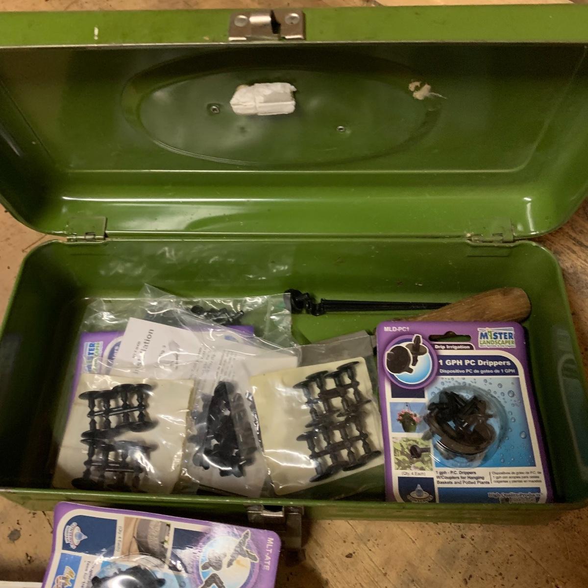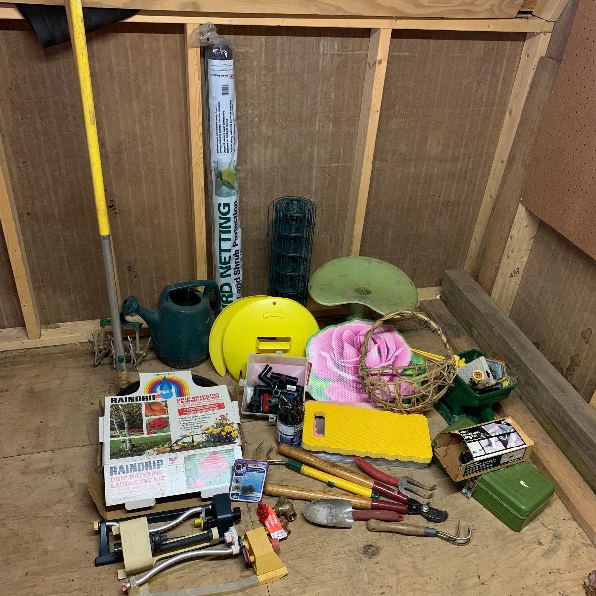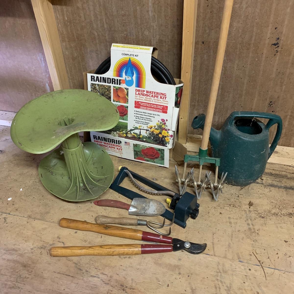 Lots of different garden items are in this lot. There is a plastic green garden stool that is adjustable in height, the height it’s at in the photo is 13.5”. Its base is curved for comfort and which makes it easier to lean to reach different spots on your garden without having to move the stool. There is a Raindrip Drip Watering Landscape Kit in its original box, as well as some other plumbing and irrigation equipment. There are three sprinklers. There are a few different hand tools, including trowels, cultivators, and loppers. There is a plastic green watering can with a crack at the top. There is a can full of metal stakes, as well as some garden fencing and an unopened package of bird netting. See photos for all items included. Local pickup only.