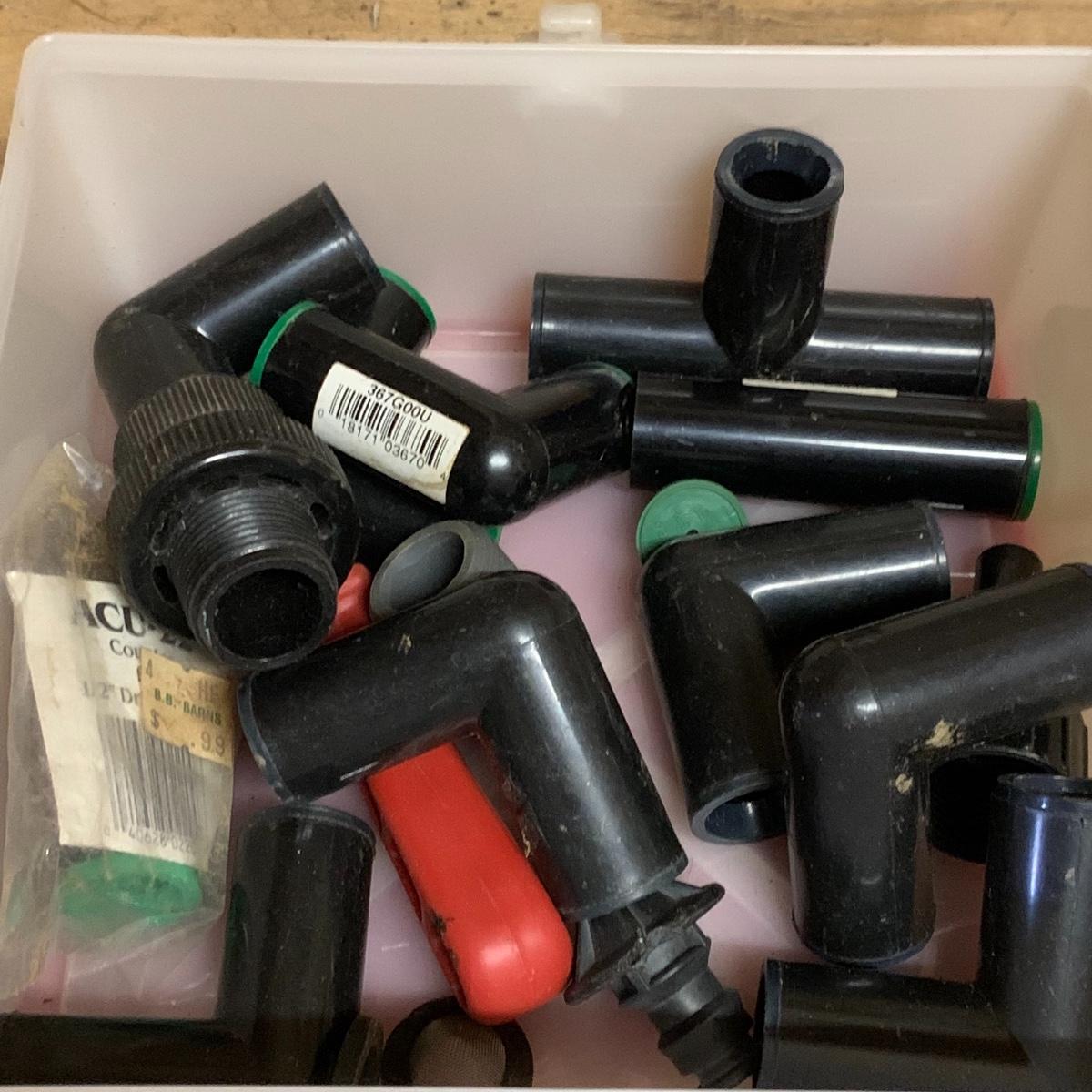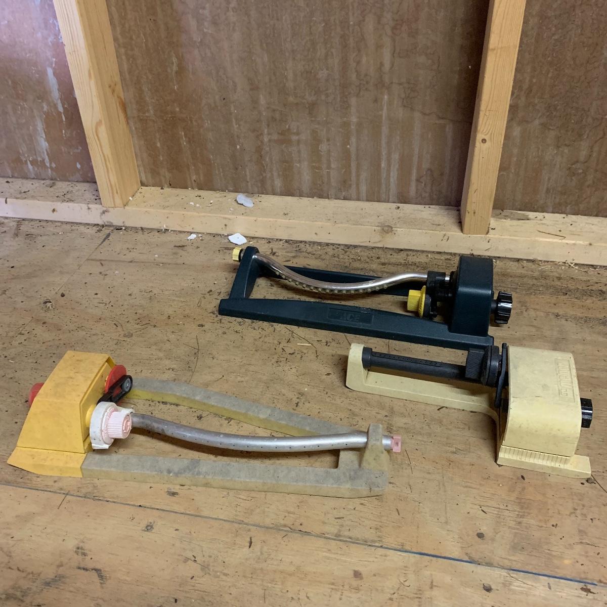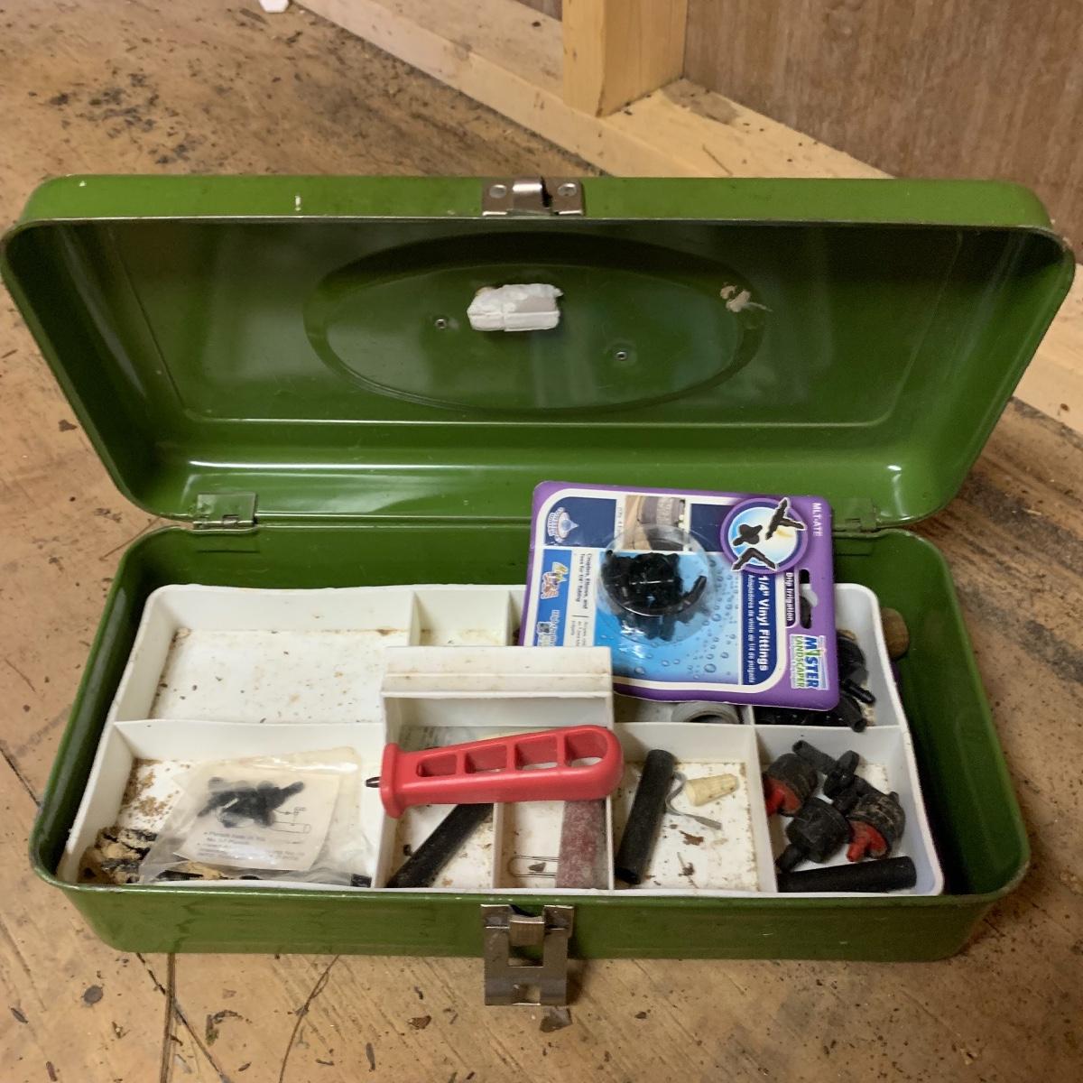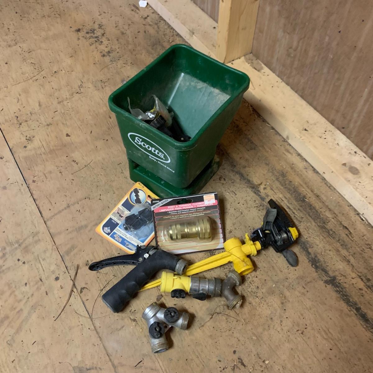Lots of different garden items are in this lot. There is a plastic green garden stool that is adjustable in height, the height it’s at in the photo is 13.5”. Its base is curved for comfort and which makes it easier to lean to reach different spots on your garden without having to move the stool. There is a Raindrip Drip Watering Landscape Kit in its original box, as well as some other plumbing and irrigation equipment. There are three sprinklers. There are a few different hand tools, including trowels, cultivators, and loppers. There is a plastic green watering can with a crack at the top. There is a can full of metal stakes, as well as some garden fencing and an unopened package of bird netting. See photos for all items included. Local pickup only.