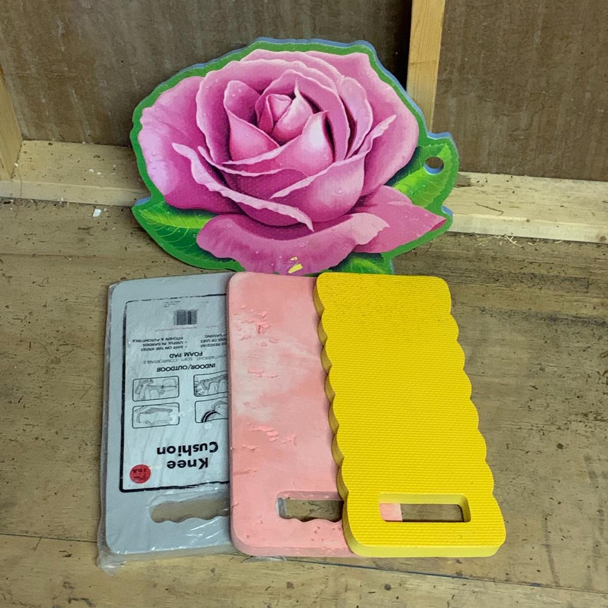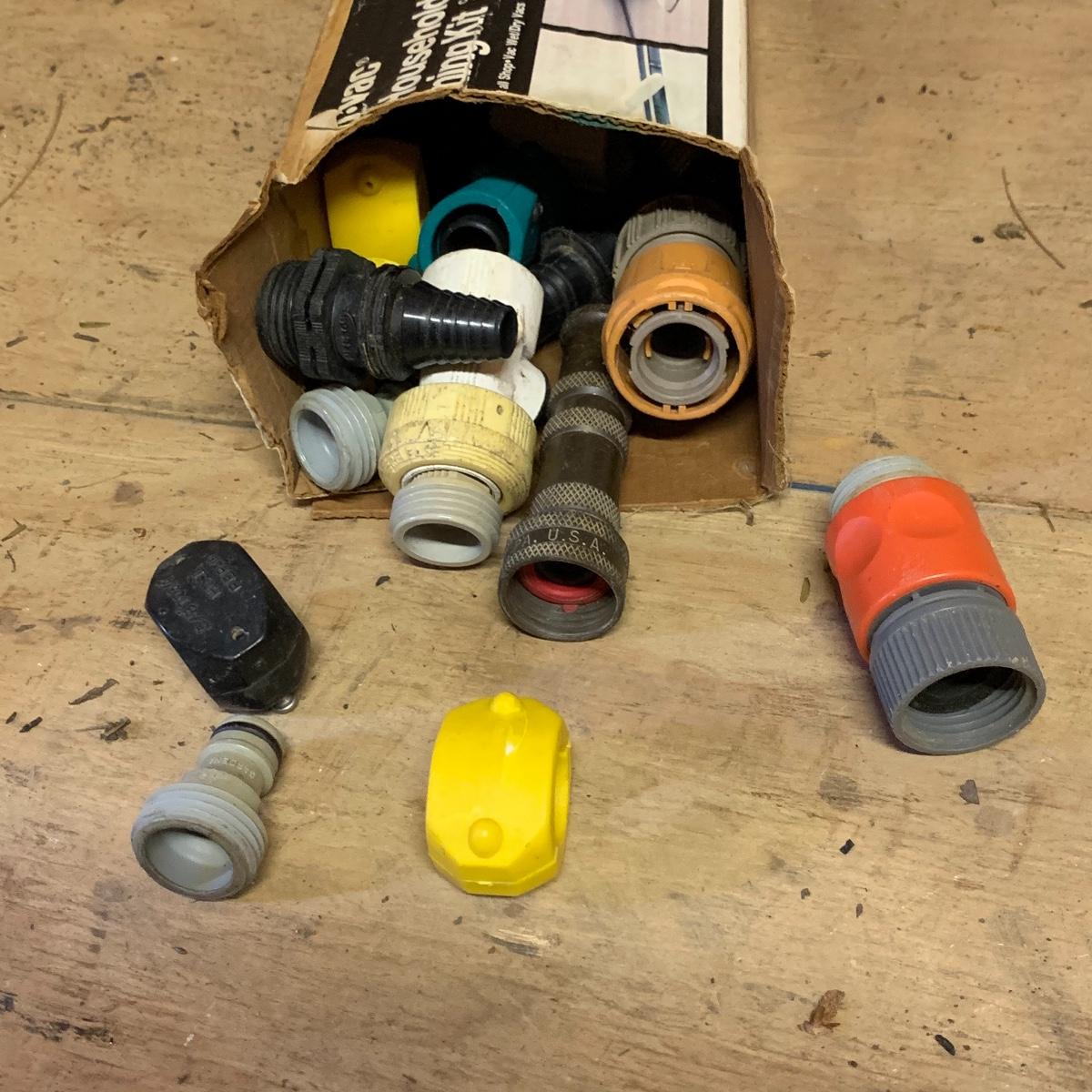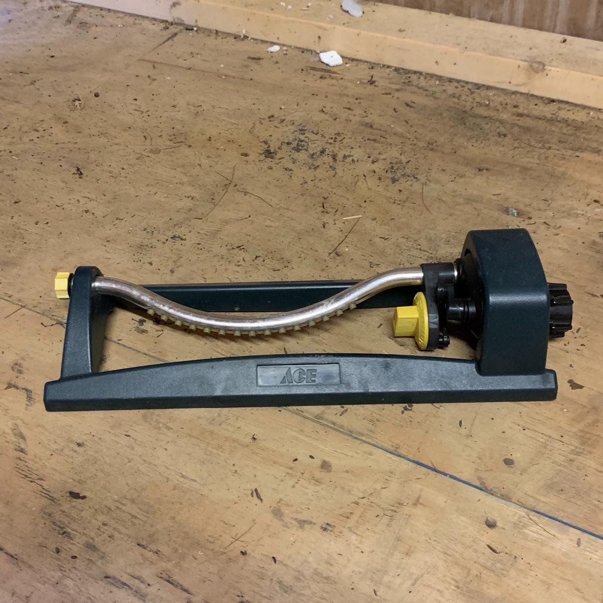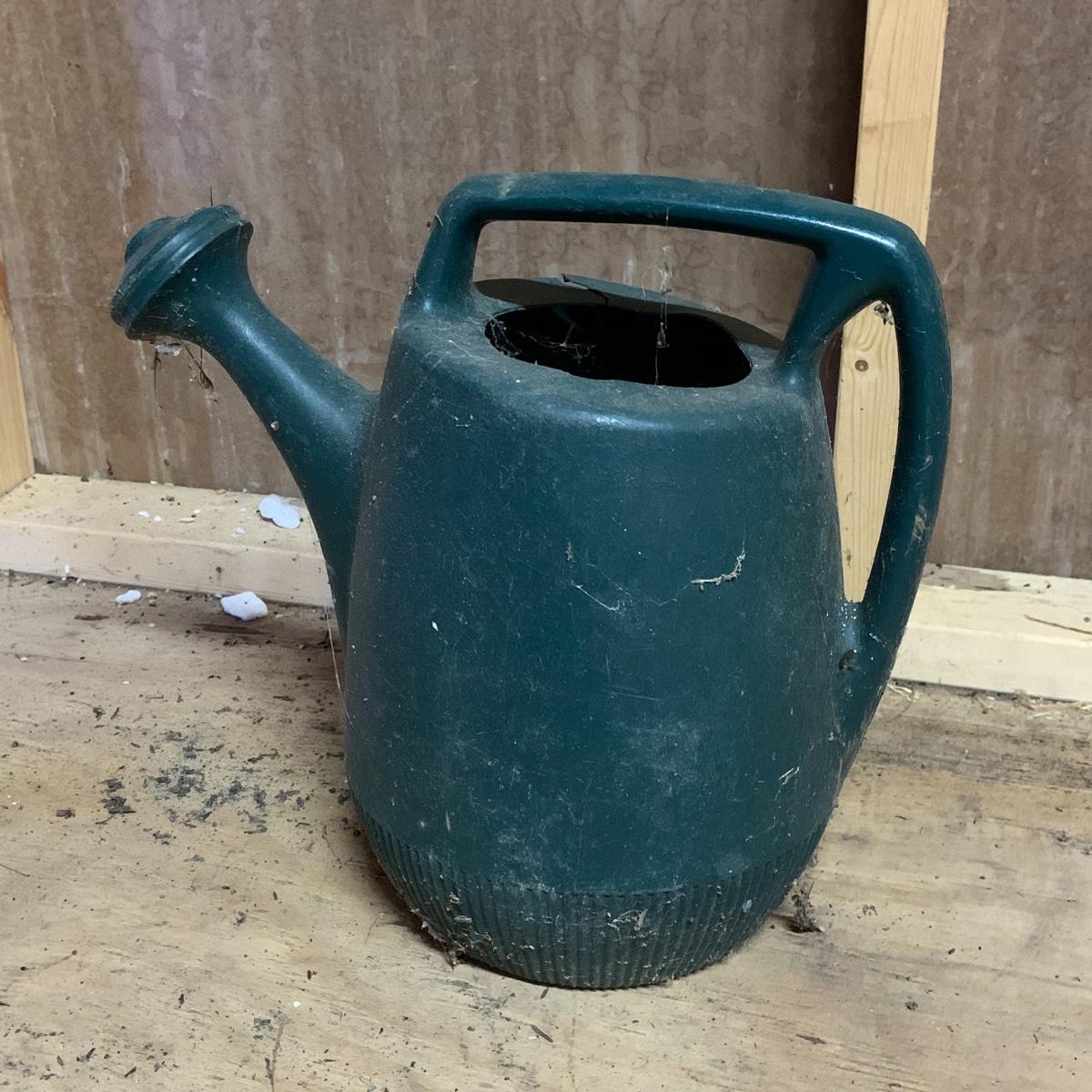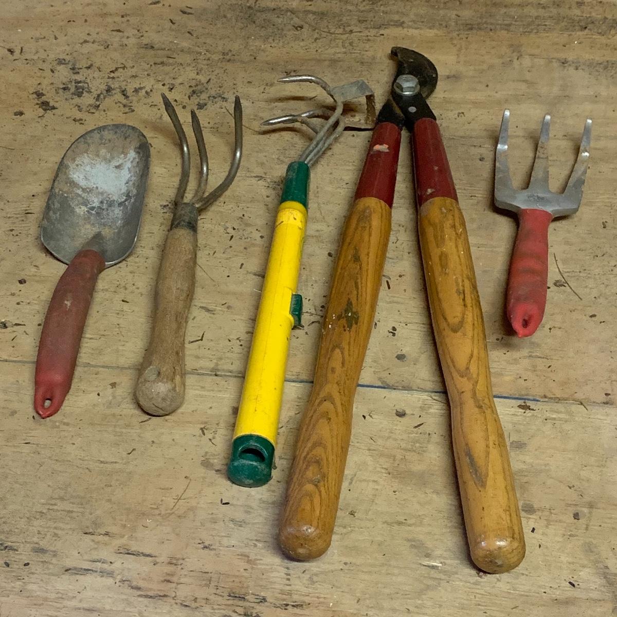 Lots of different garden items are in this lot. There is a plastic green garden stool that is adjustable in height, the height it’s at in the photo is 13.5”. Its base is curved for comfort and which makes it easier to lean to reach different spots on your garden without having to move the stool. There is a Raindrip Drip Watering Landscape Kit in its original box, as well as some other plumbing and irrigation equipment. There are three sprinklers. There are a few different hand tools, including trowels, cultivators, and loppers. There is a plastic green watering can with a crack at the top. There is a can full of metal stakes, as well as some garden fencing and an unopened package of bird netting. See photos for all items included. Local pickup only.