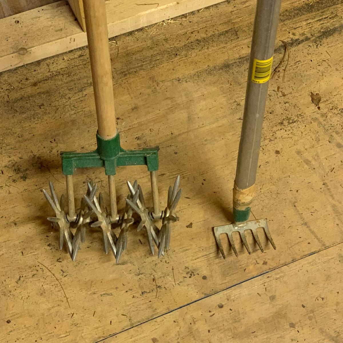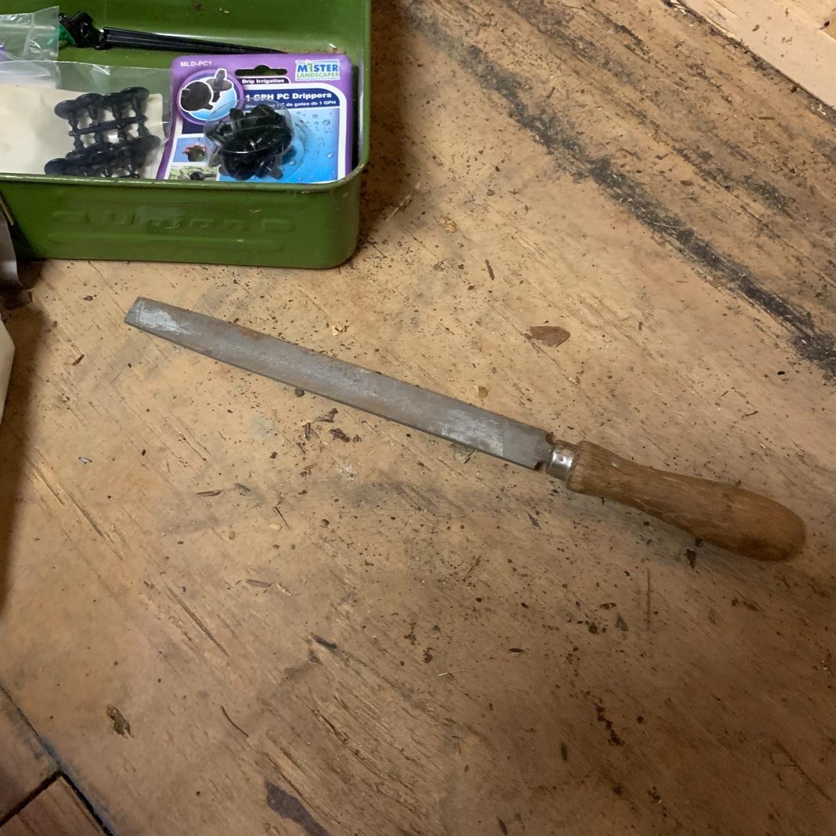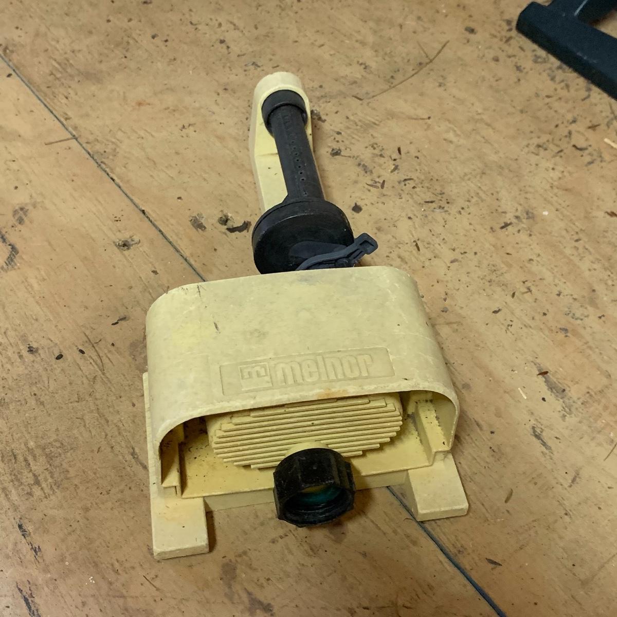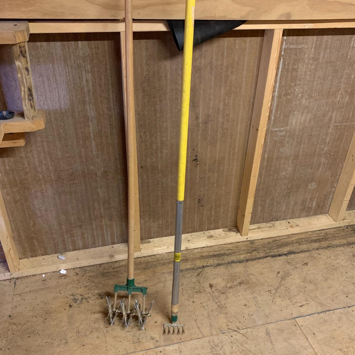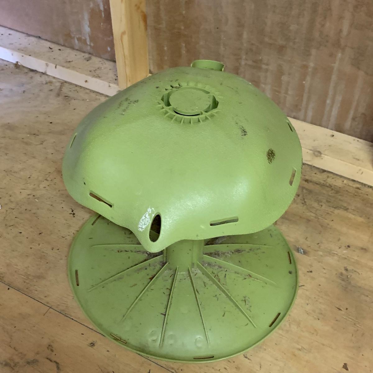 Lots of different garden items are in this lot. There is a plastic green garden stool that is adjustable in height, the height it’s at in the photo is 13.5”. Its base is curved for comfort and which makes it easier to lean to reach different spots on your garden without having to move the stool. There is a Raindrip Drip Watering Landscape Kit in its original box, as well as some other plumbing and irrigation equipment. There are three sprinklers. There are a few different hand tools, including trowels, cultivators, and loppers. There is a plastic green watering can with a crack at the top. There is a can full of metal stakes, as well as some garden fencing and an unopened package of bird netting. See photos for all items included. Local pickup only.