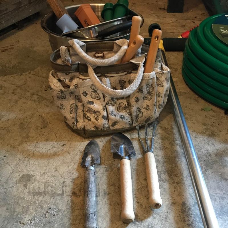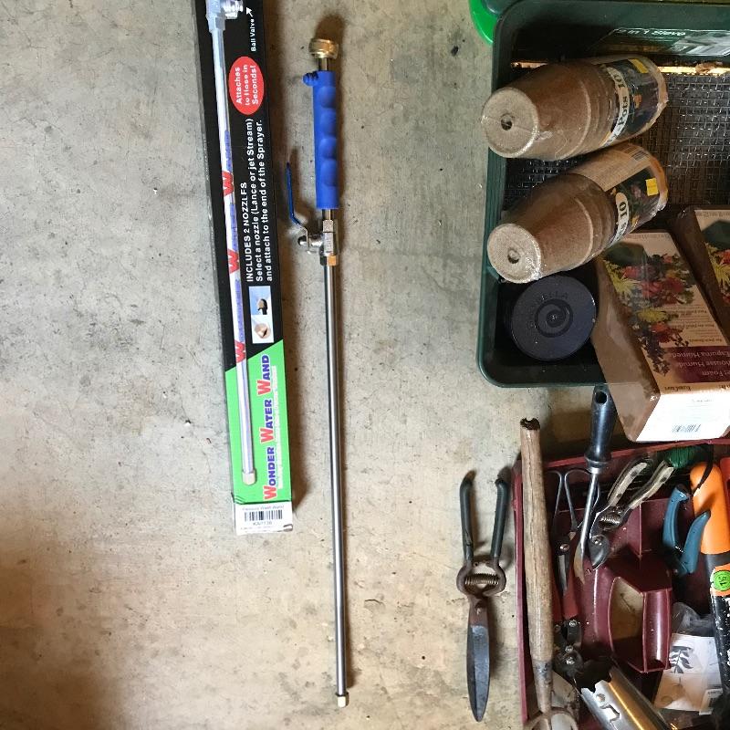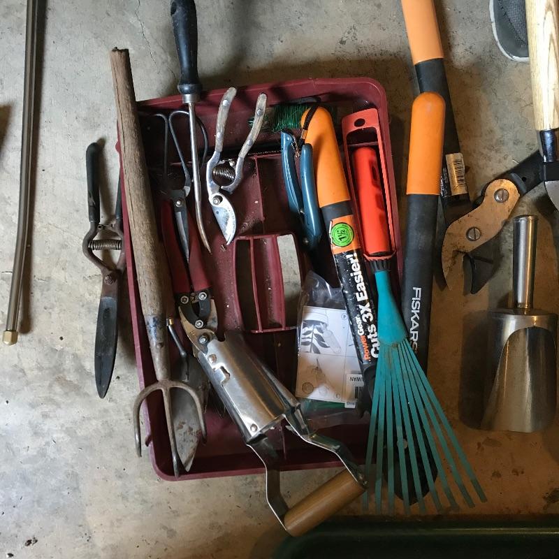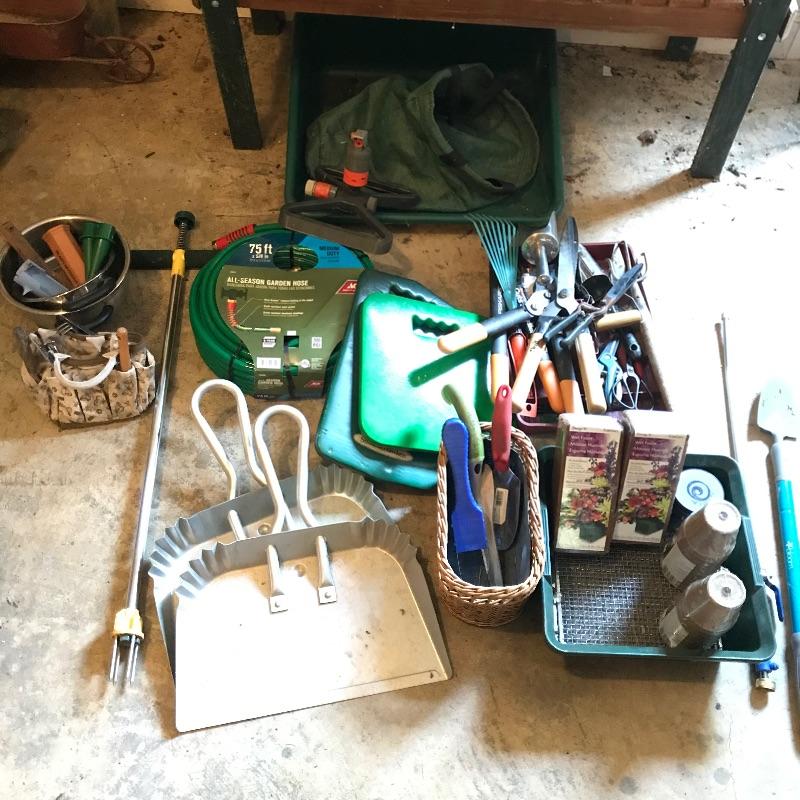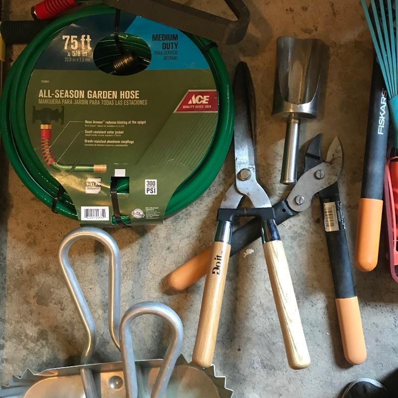 Large lot is full of useful tools to keep your yard beautiful. A new 75’ hose with a Wonder Water sprayer, small hand tools galore, brush catchers, knee pads and so much more. See photos. No shipping.