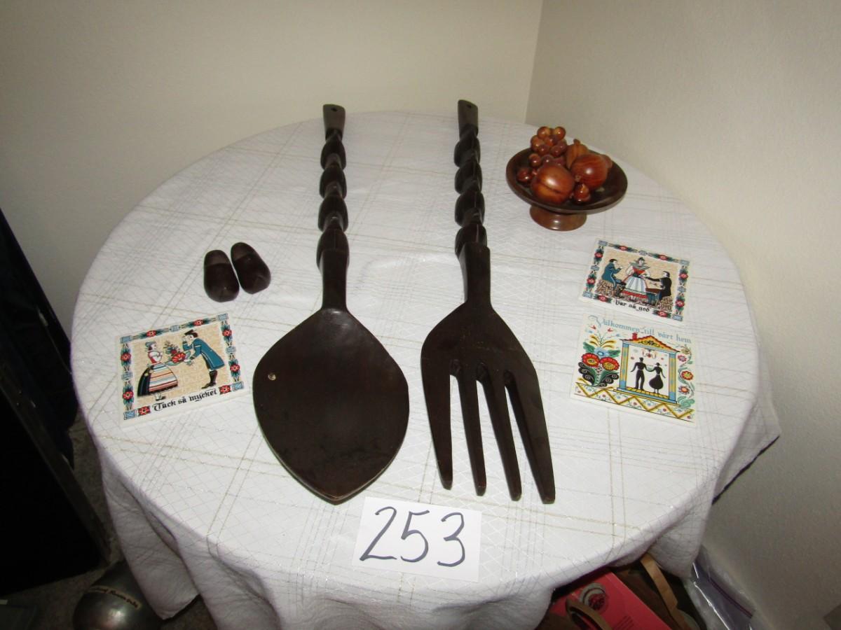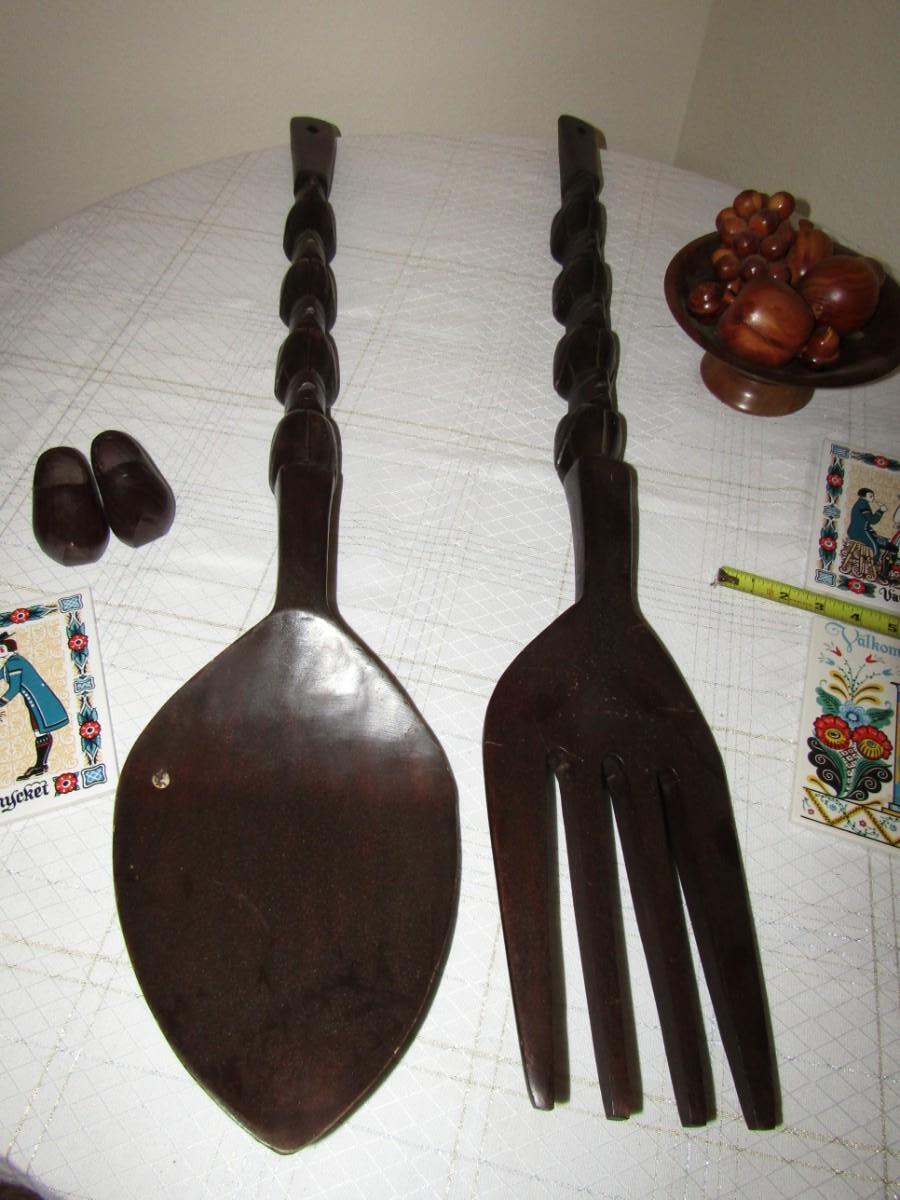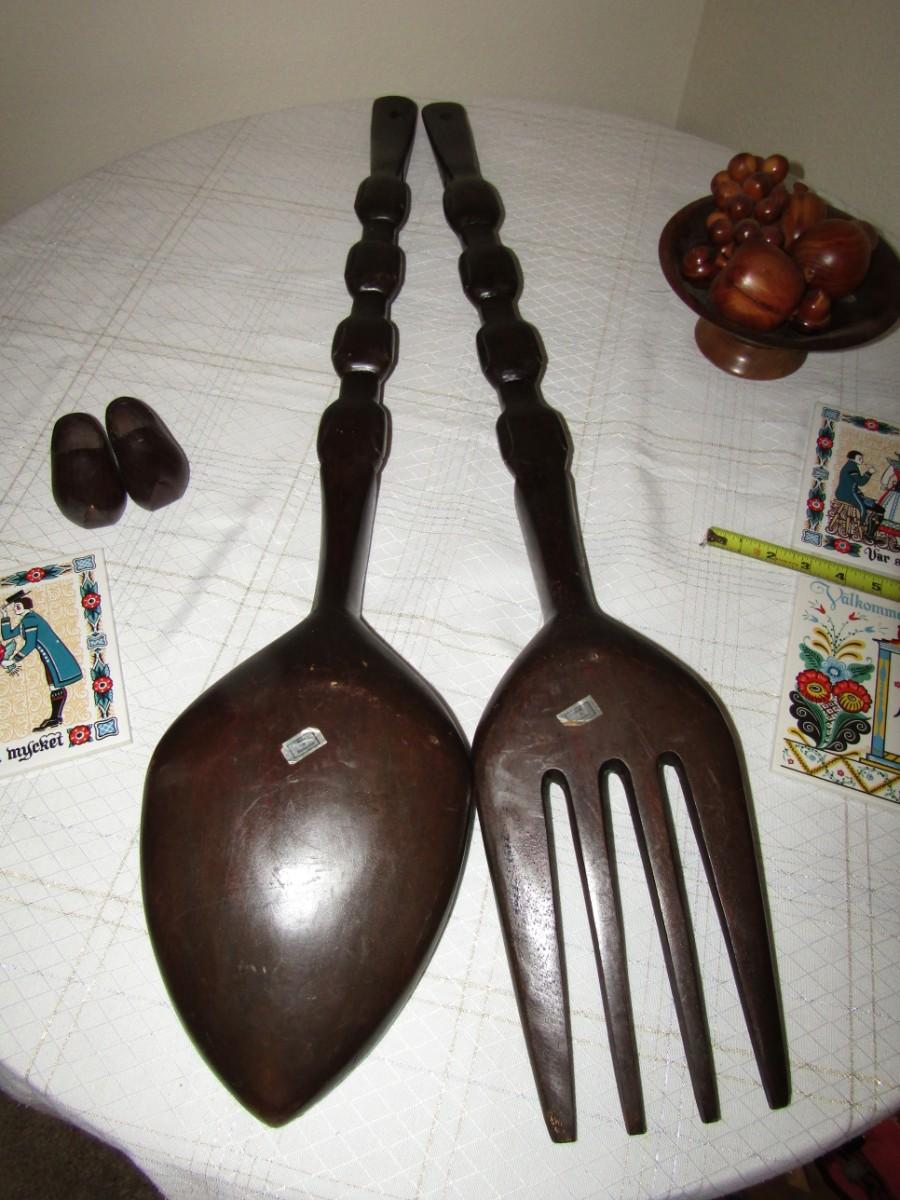 LARGE WOODEN SPOON AND FORK TO HANG, WOODEN BOWL OF FRUIT. WOODEN DANISH CLOGS, AND 3 CERAMIC DECORATIVE TILES.