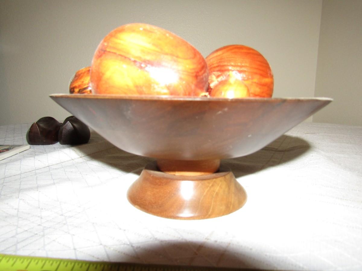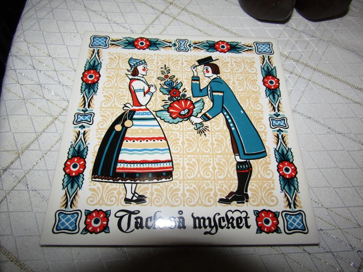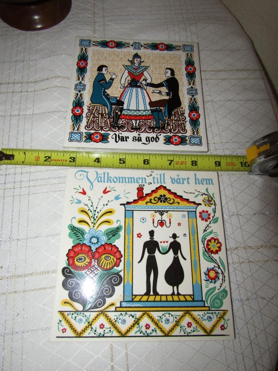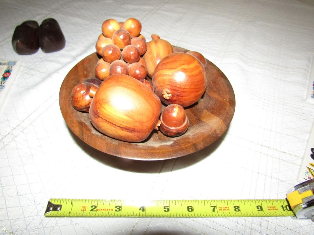 LARGE WOODEN SPOON AND FORK TO HANG, WOODEN BOWL OF FRUIT. WOODEN DANISH CLOGS, AND 3 CERAMIC DECORATIVE TILES.