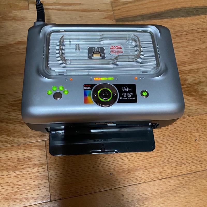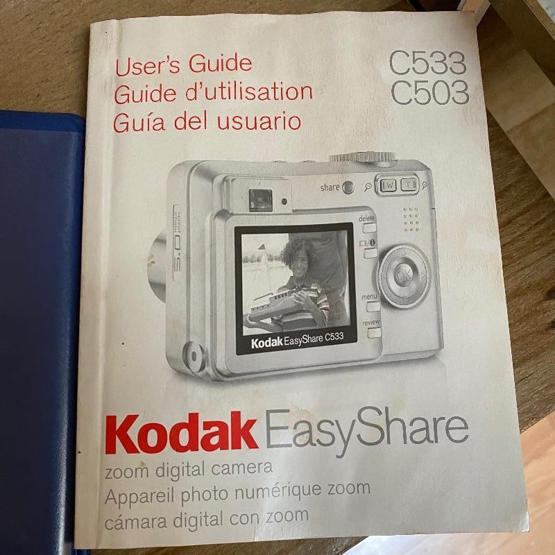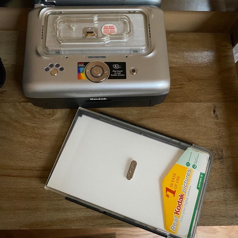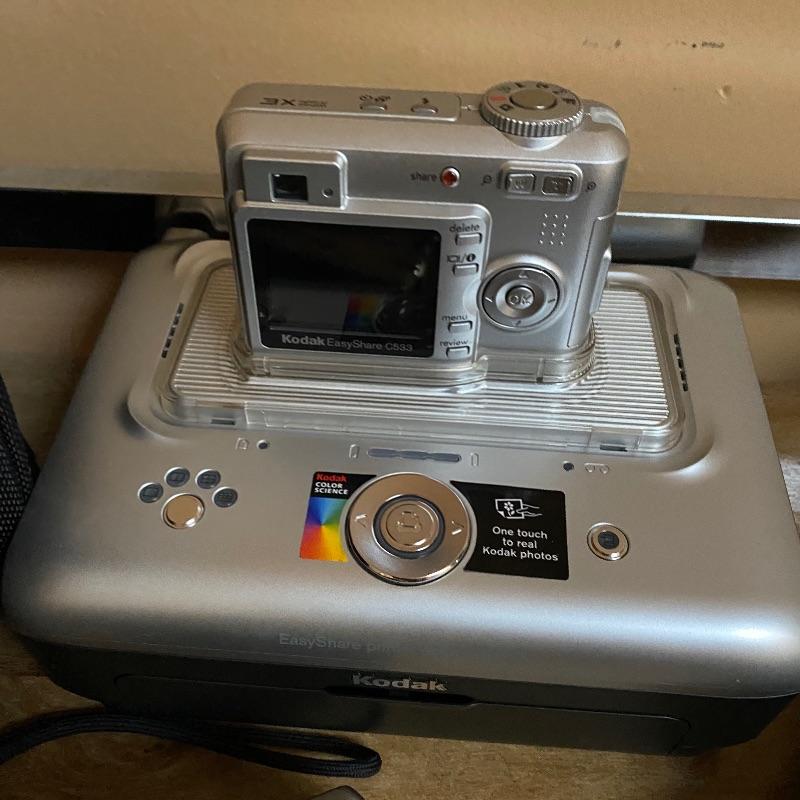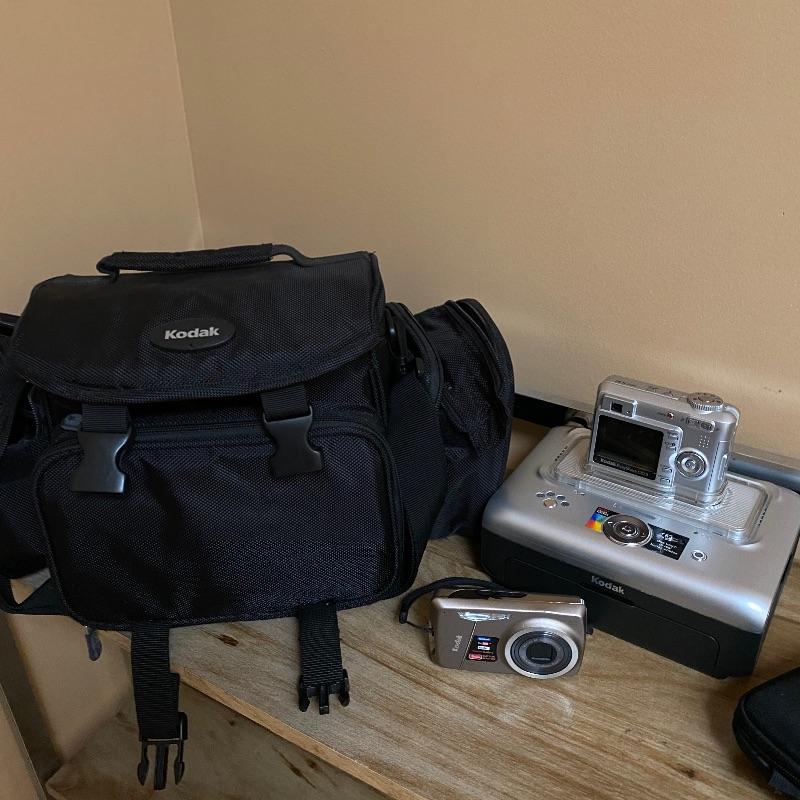 Two cameras in this lot as well as a photo printer and carrying cases. First you’ve got the Kodak Easy Share C533 digital camera. This plugs right into the top of the accompanying printer to print photos directly from the camera. Comes with a handy case, all cords and the manual. This lot also includes the Kodak Easy Share M550 with case and manual. No battery in C533 so couldn’t turn on but the printer turned on fine. The M550 did not turn on when tested but it’s likely just a dead battery. Shipping available.