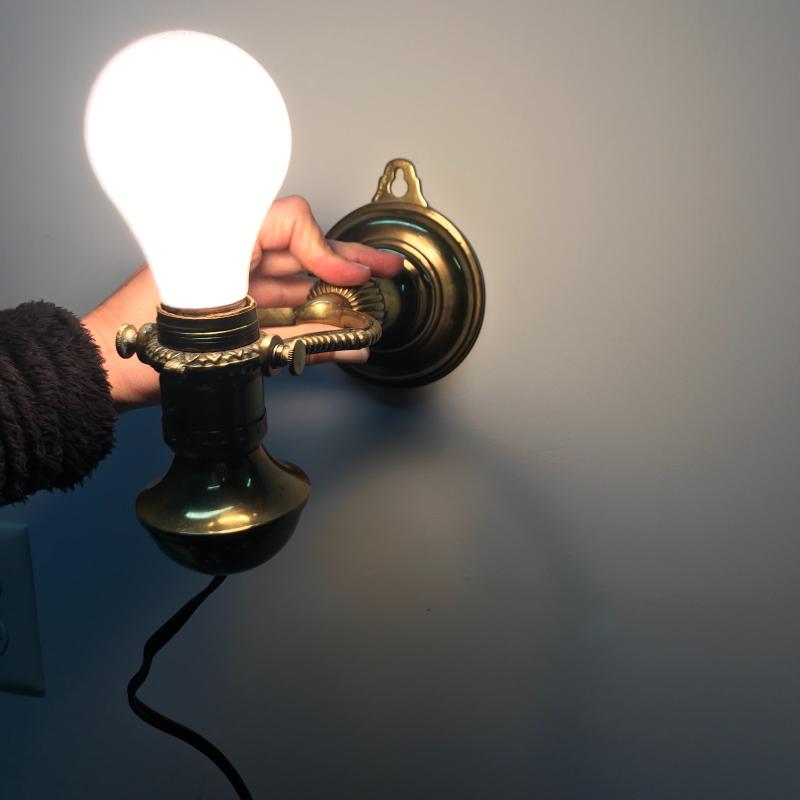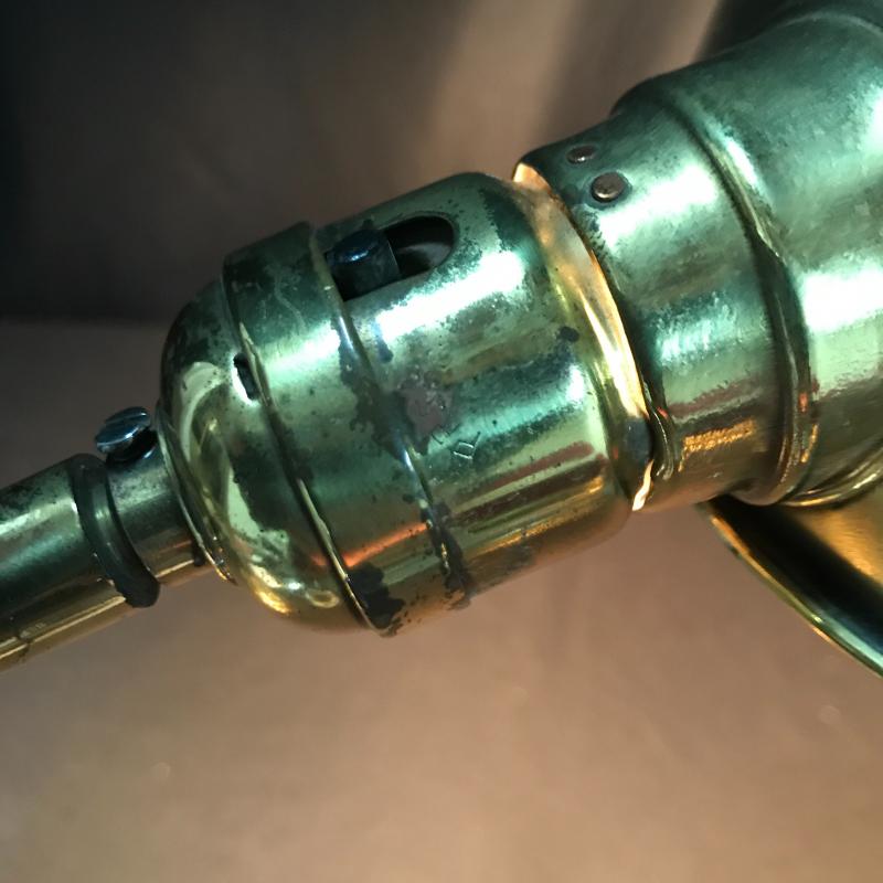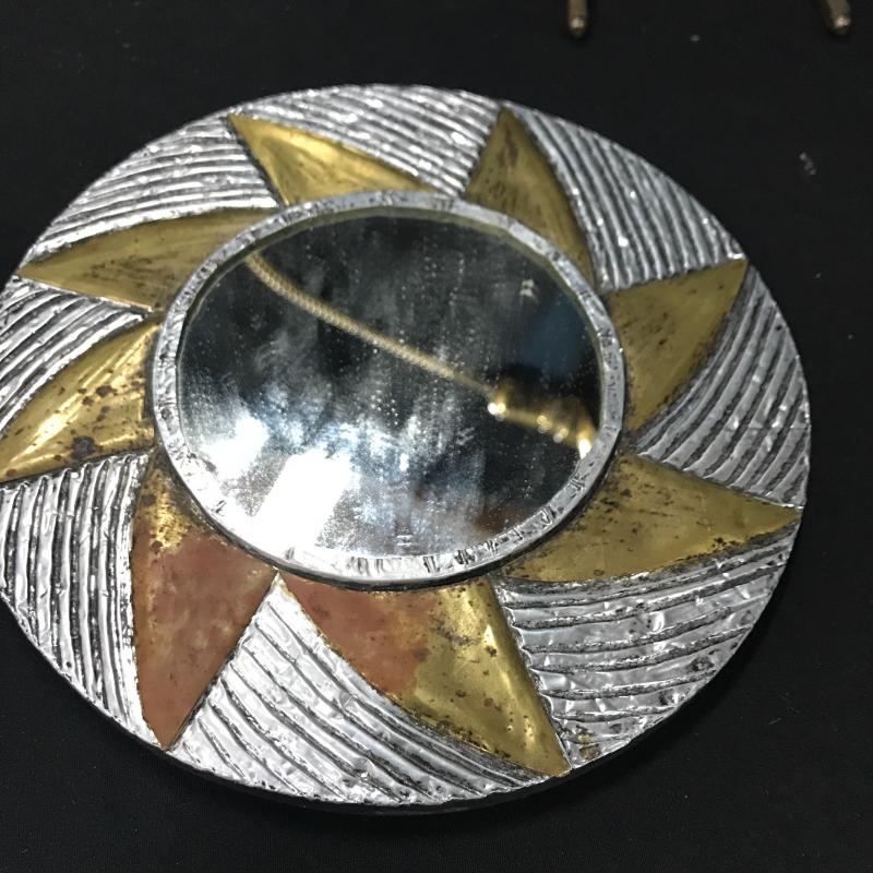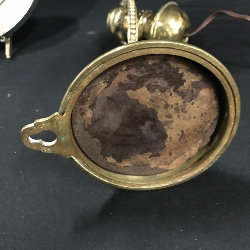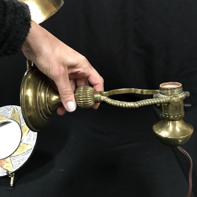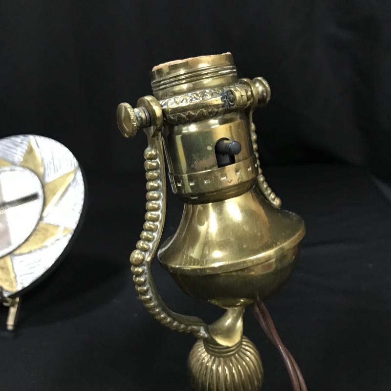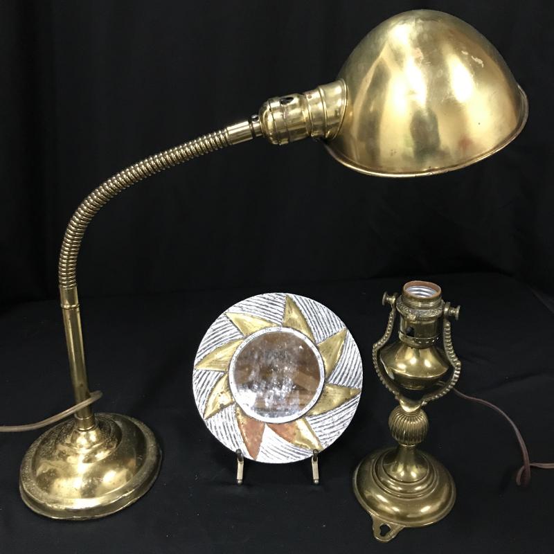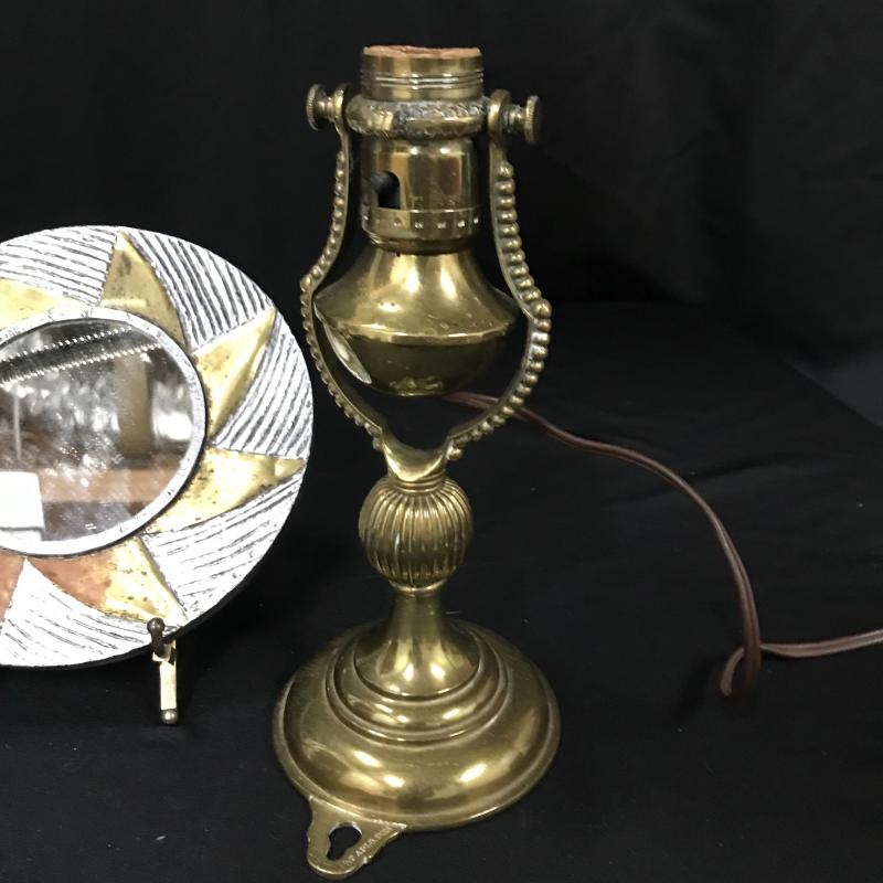 Brass lamps and cute mirror. Smaller Lamp moves so it can go on wall or table top and it is 4”d x 9”h. Small Mirror is 7”d. Adjustable table lamp works but has some dents and wear. It is 6”d at base. 26”h when stretched strait up. Both lamps work. Shipping or local pick up in Asheville