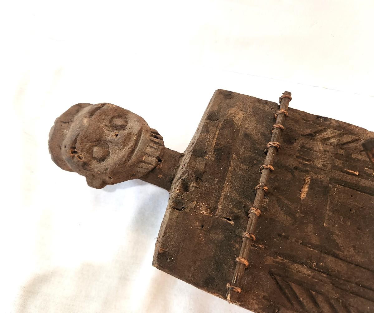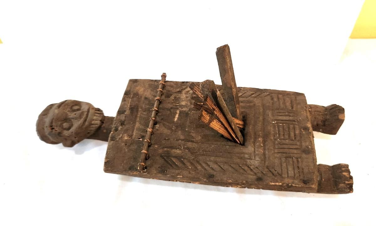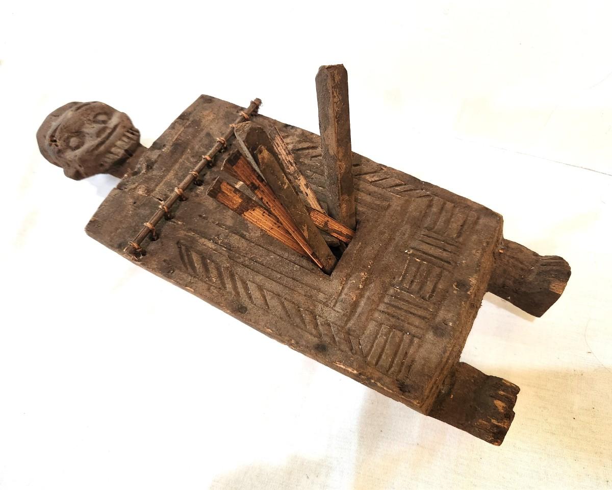 Male Figure, carved geometric figures front and back - softwood, hollowed out on the interior to create a resonance box. Wooden keys. 15" long - from the Luba Tribe.