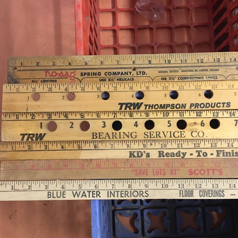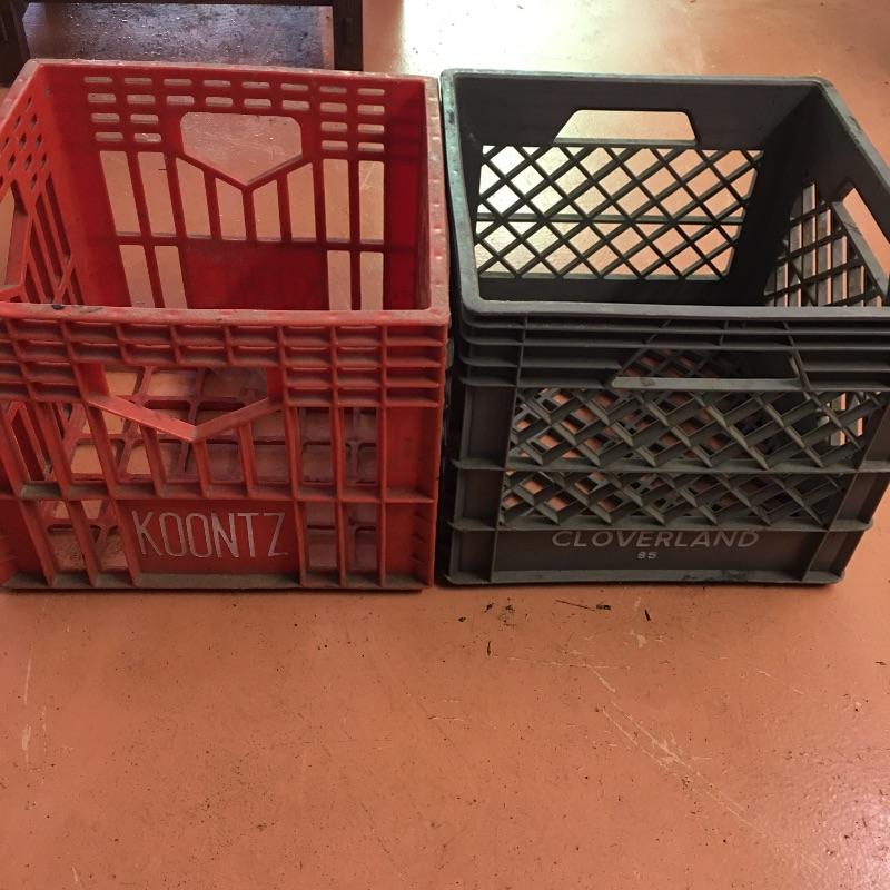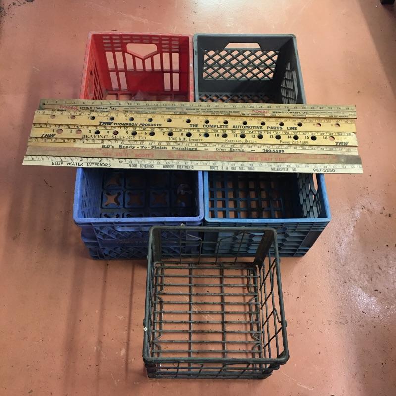 Vintage shop storage and yard sticks. Lot includes five milk crates Including four plastic and one metal crate. Lot also contains six wooden yardsticks, most appear with the sought after vintage personality