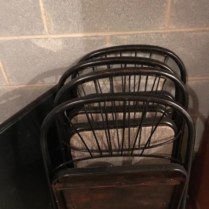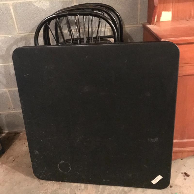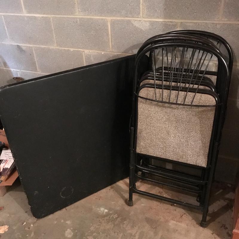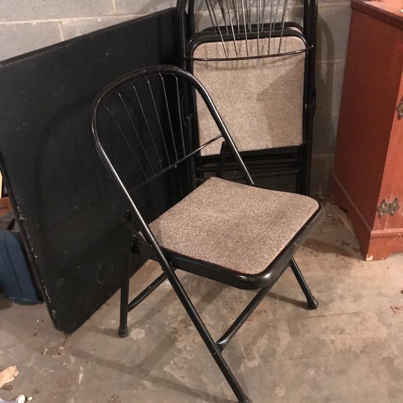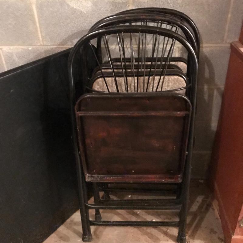 Add some personality to your next party with these fun chairs. These black chairs have brown/red hues in the metal and possibly vinyl seat covers that resemble cloth. Standard Samsonite folding card table accompanies chairs. No shipping.