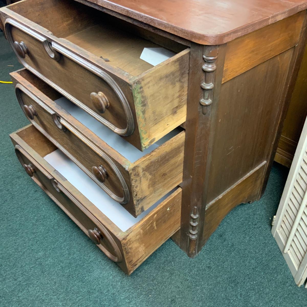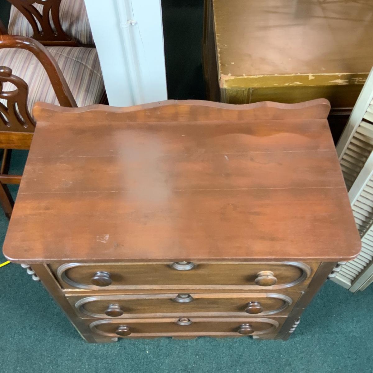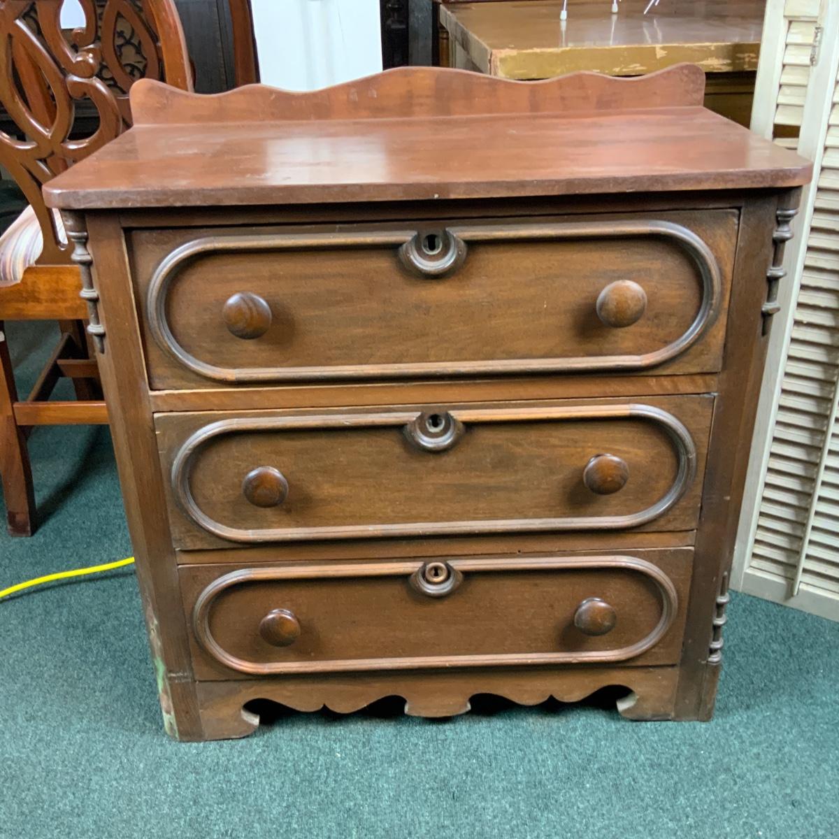 Small three drawer chest. Could be a nightstand or an accent piece in a hallway. //::\\ Please see photos for details and condition. No attempt has been made to hide any imperfections. All items listed in this auction are warehouse items, and need to be cleaned. A majority of the items need restoration as well. All items are sold AS IS and WITHOUT GUARANTEE. If you are uncertain about an item, DO NOT BID. Due to the nature of this online auction in-person inspection is HIGHLY recommended. All Sales are FINAL. Pick Up Times are FIRM. Please confirm with your own schedule that you can pick up in the scheduled times listed in the Terms and Conditions. Any questions please message the auctioneer. DO NOT Contact The Harp Gallery.