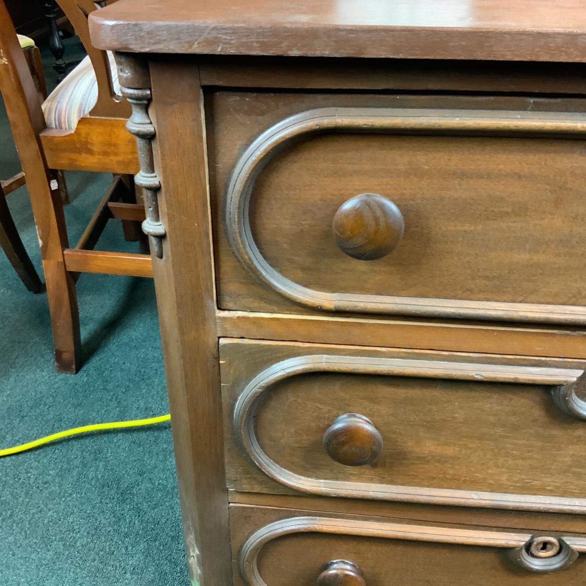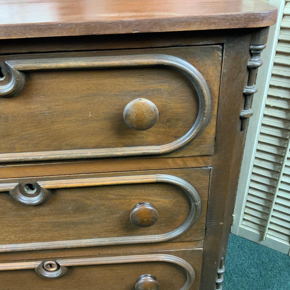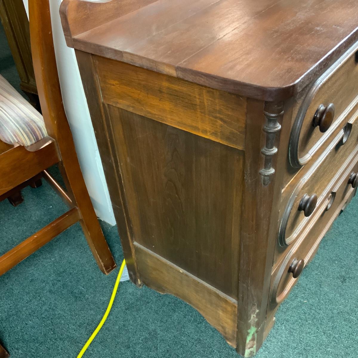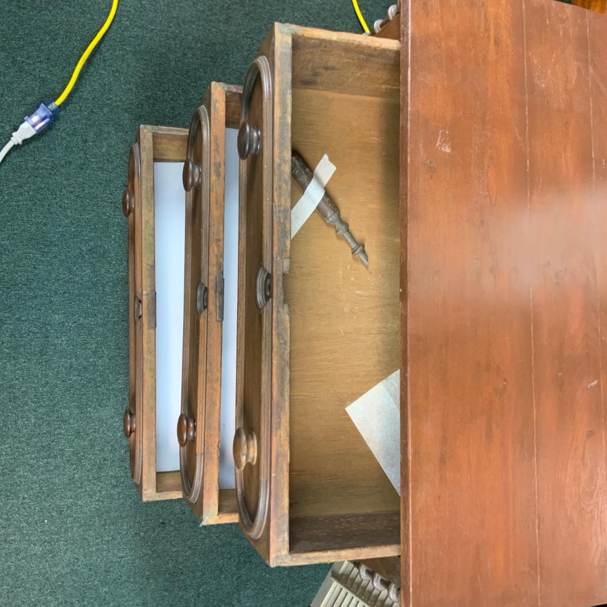 Small three drawer chest. Could be a nightstand or an accent piece in a hallway. //::\\ Please see photos for details and condition. No attempt has been made to hide any imperfections. All items listed in this auction are warehouse items, and need to be cleaned. A majority of the items need restoration as well. All items are sold AS IS and WITHOUT GUARANTEE. If you are uncertain about an item, DO NOT BID. Due to the nature of this online auction in-person inspection is HIGHLY recommended. All Sales are FINAL. Pick Up Times are FIRM. Please confirm with your own schedule that you can pick up in the scheduled times listed in the Terms and Conditions. Any questions please message the auctioneer. DO NOT Contact The Harp Gallery.