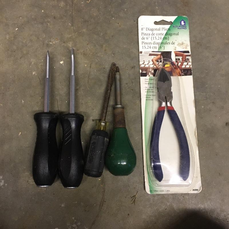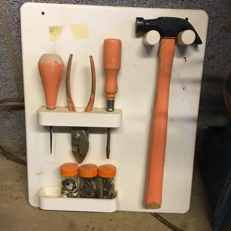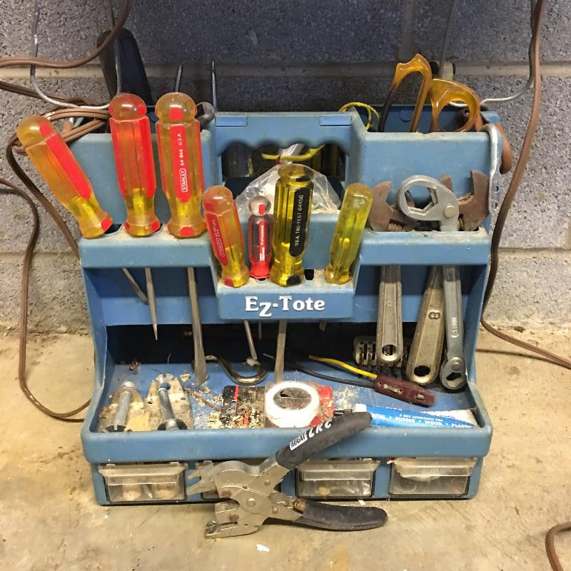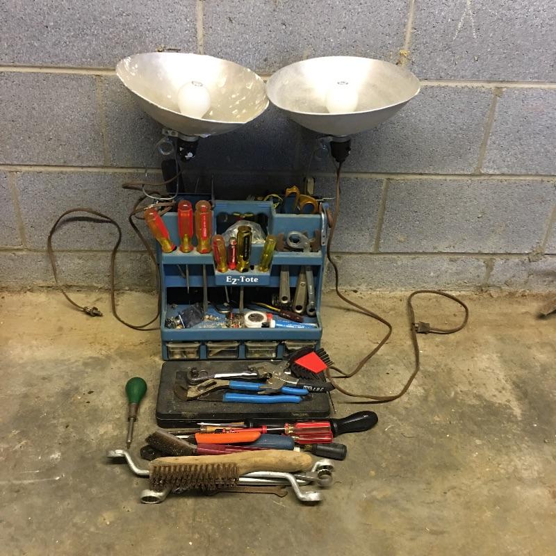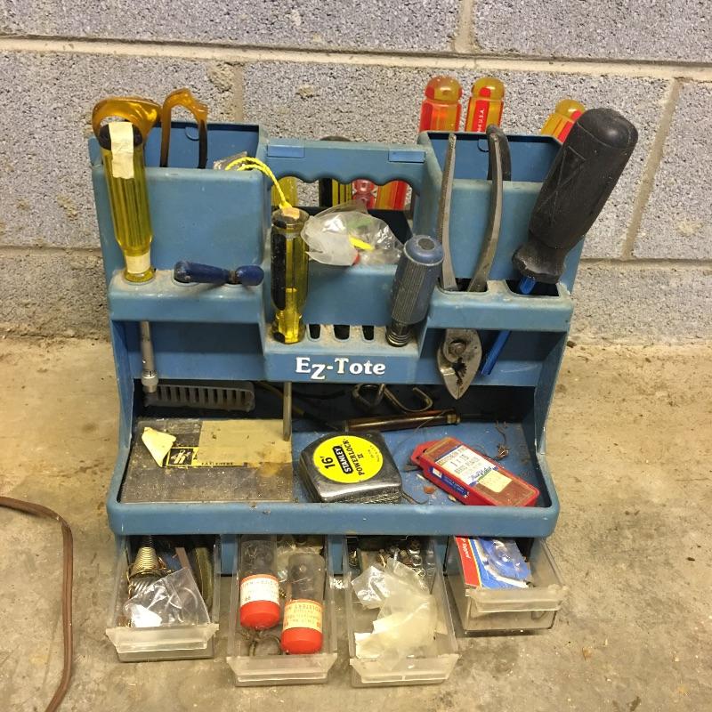 Lots of tools here to get stuff fixed! This great assortment of everyday tools includes an EZ Tote, tape measure, hammers, screwdrivers, pliers, socket set, wall mount tool holder with tools, utility knife, adjustable wrenches, hex keys, two clamp lights and more. Lights worked when tested.