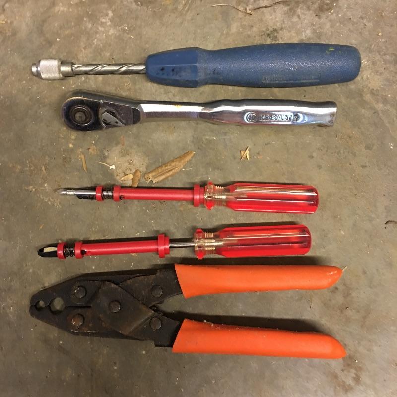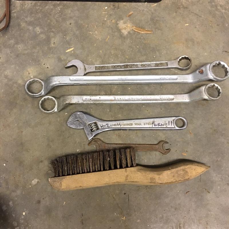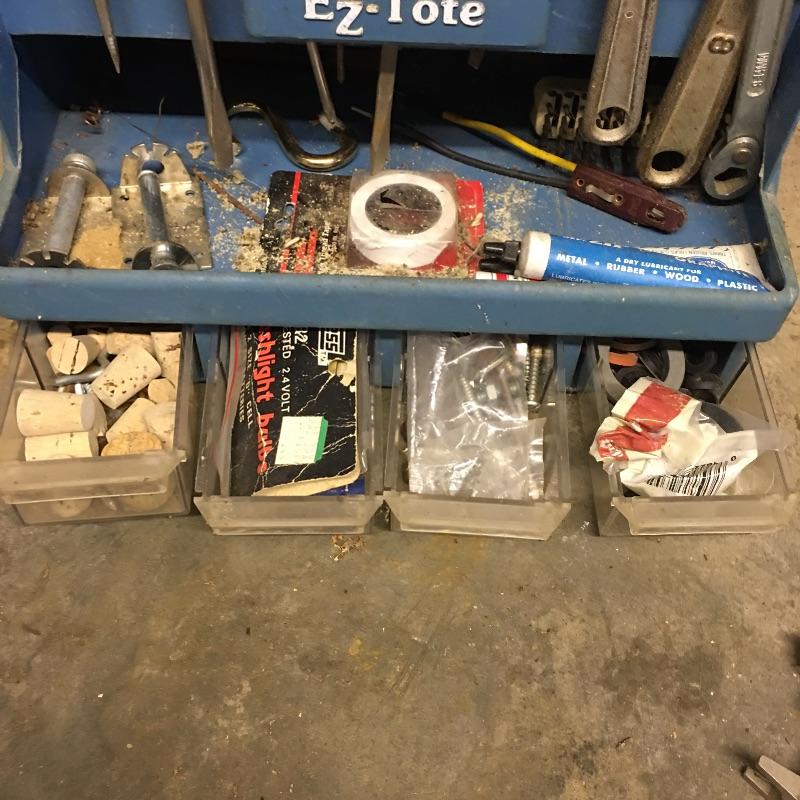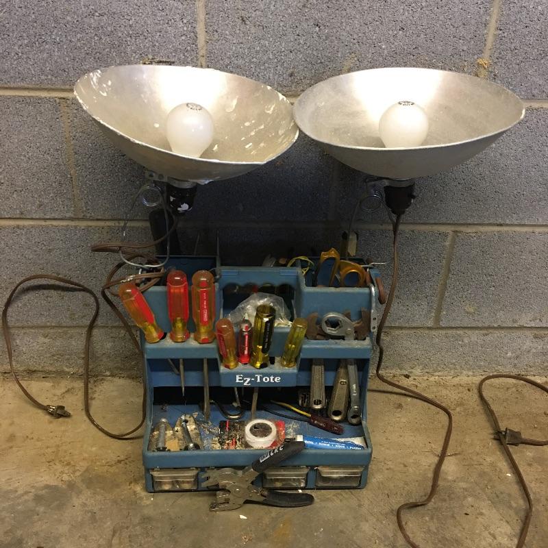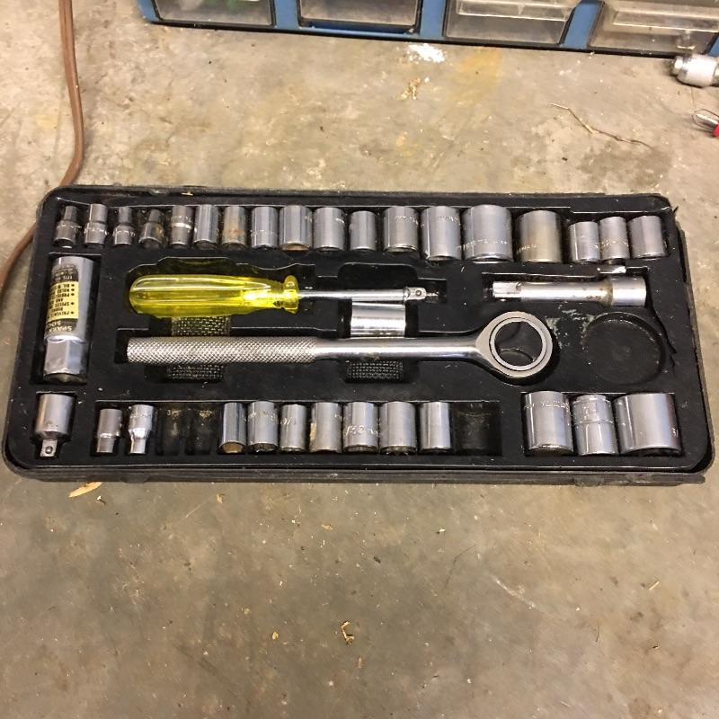 Lots of tools here to get stuff fixed! This great assortment of everyday tools includes an EZ Tote, tape measure, hammers, screwdrivers, pliers, socket set, wall mount tool holder with tools, utility knife, adjustable wrenches, hex keys, two clamp lights and more. Lights worked when tested.