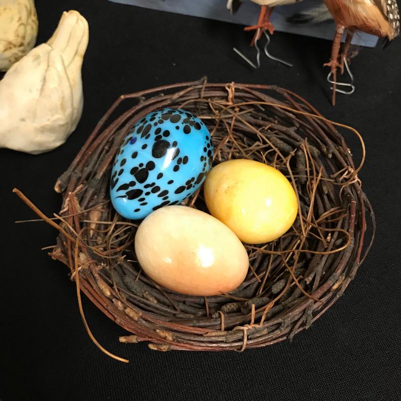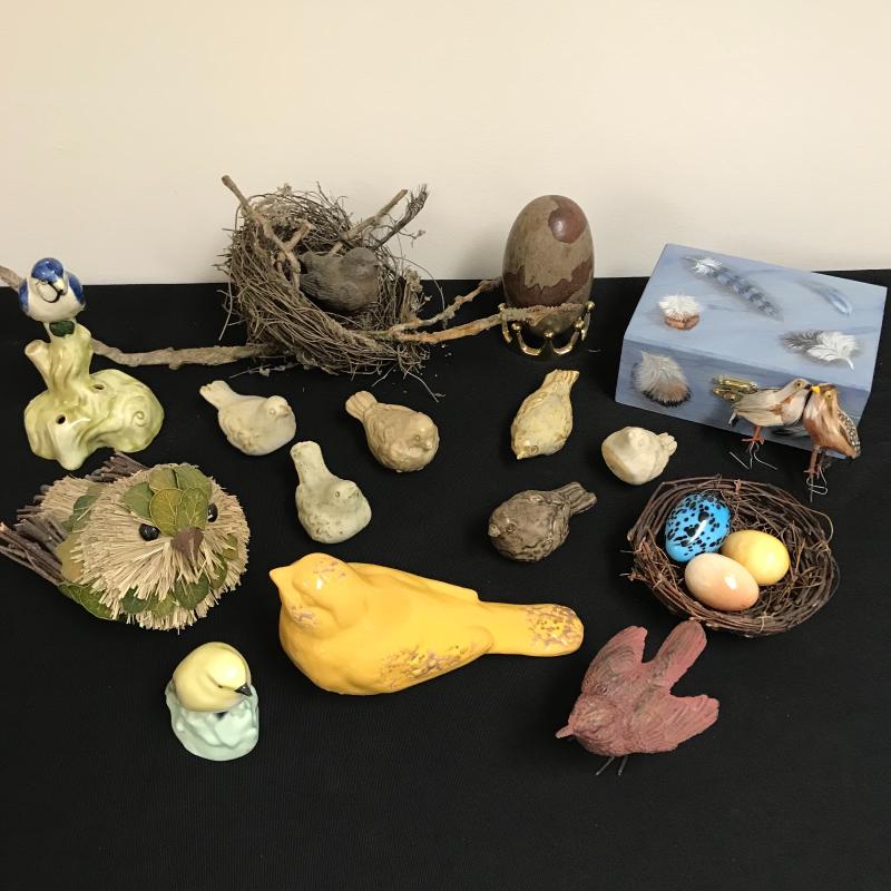 This sweet lot includes 14 birds, two nests, four eggs and a hand painted feather box. Large egg is made of beautiful unknown stone. See pics. Shipping available or local pickup in Arden, NC.