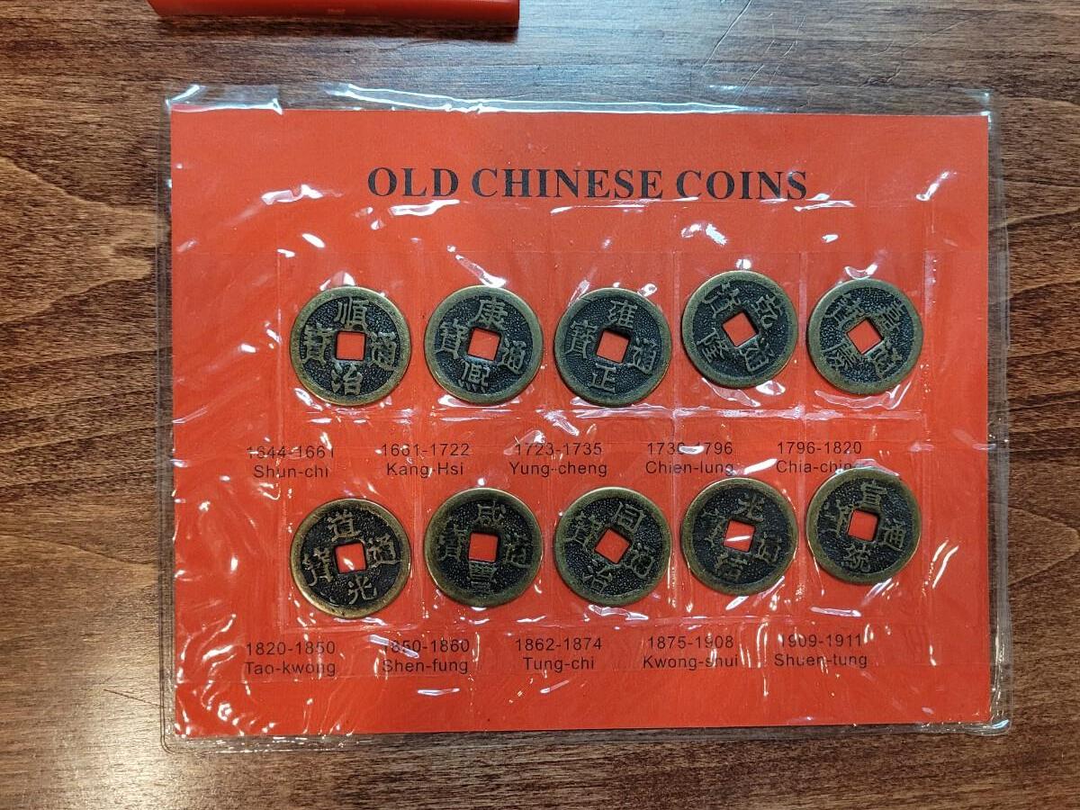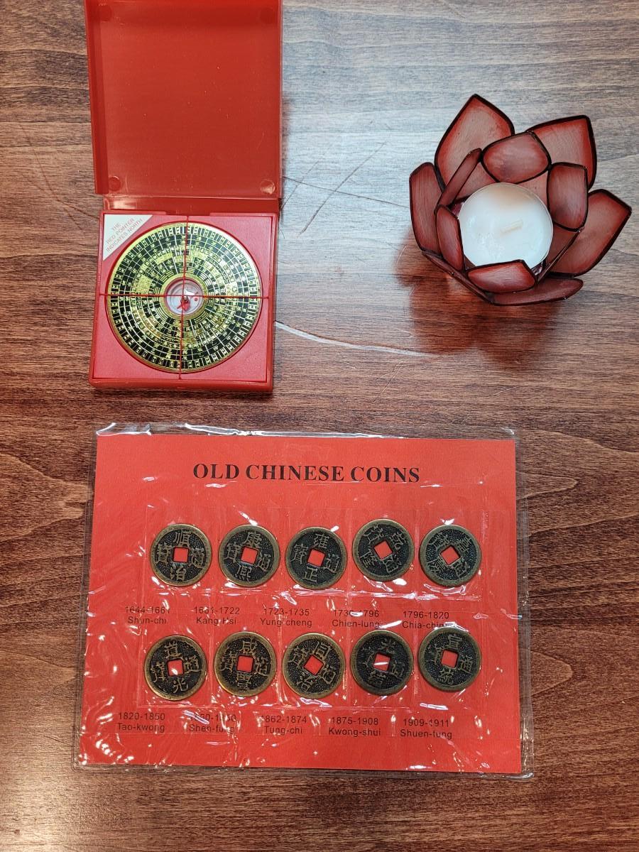 Lot 254: Lotus Candle Holder, Old Chinese Coins and Chinese Compass