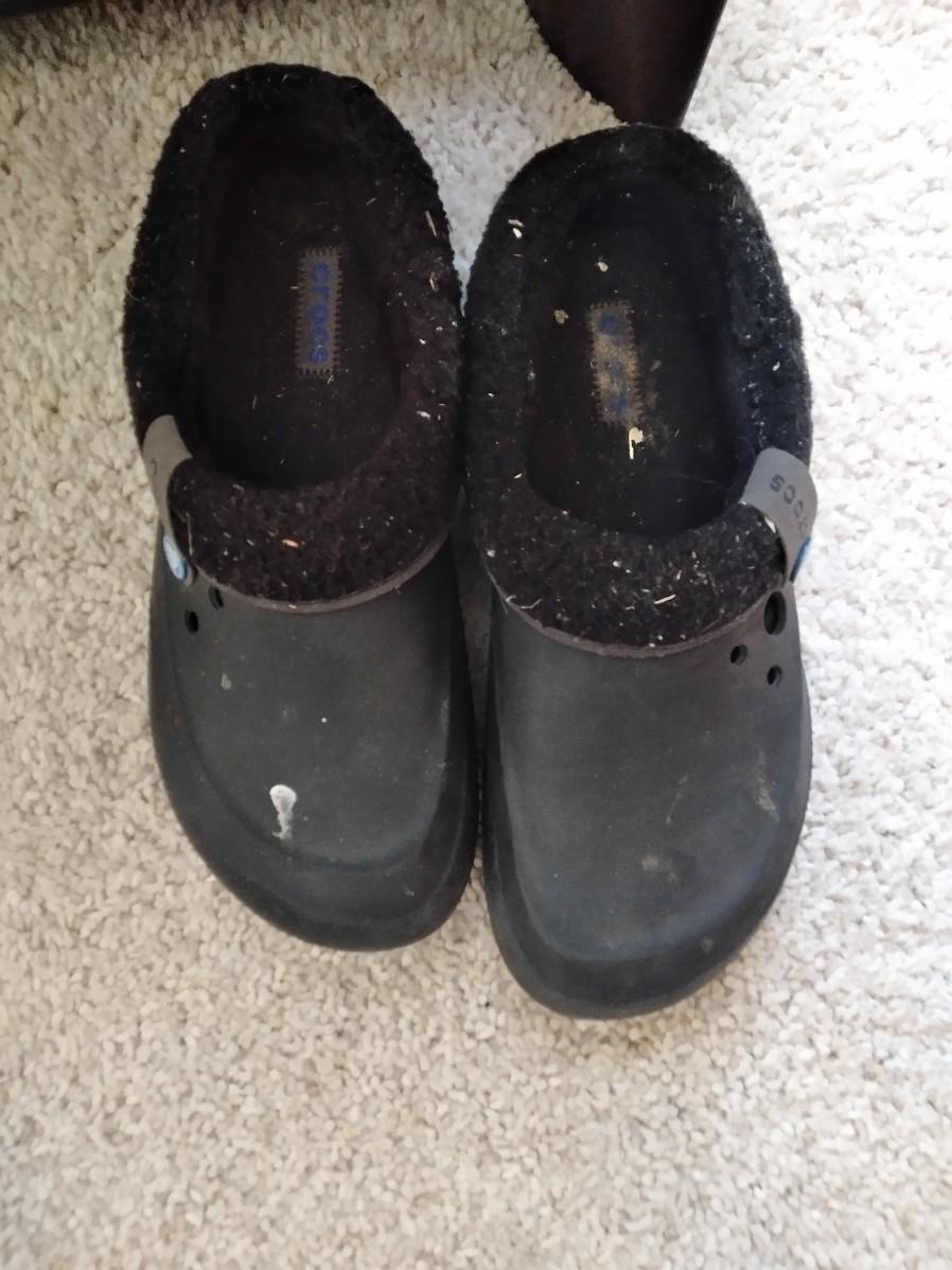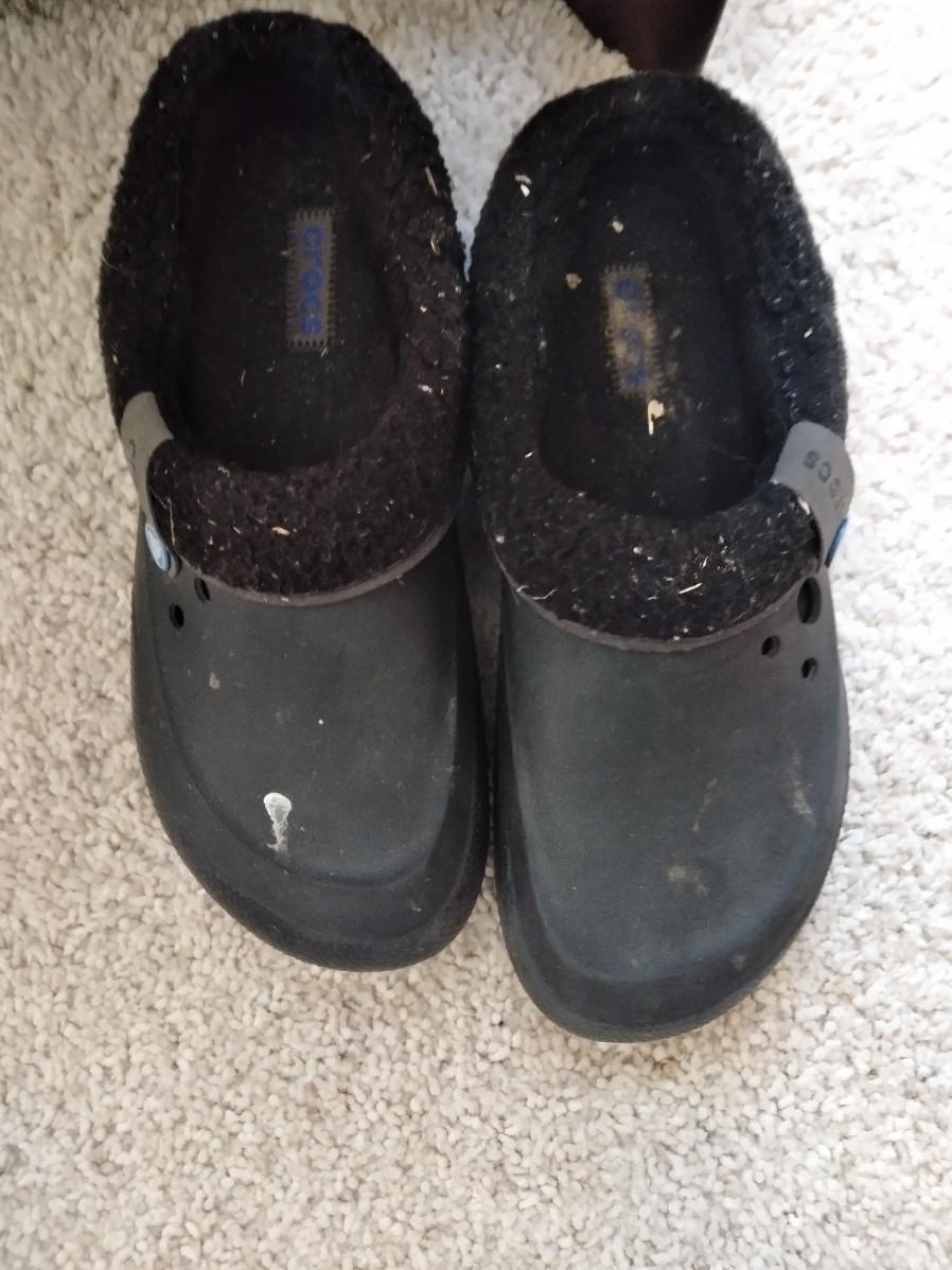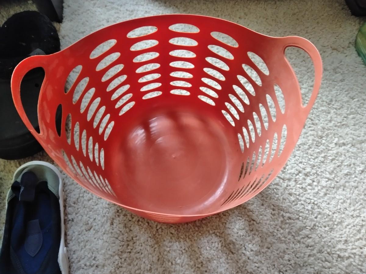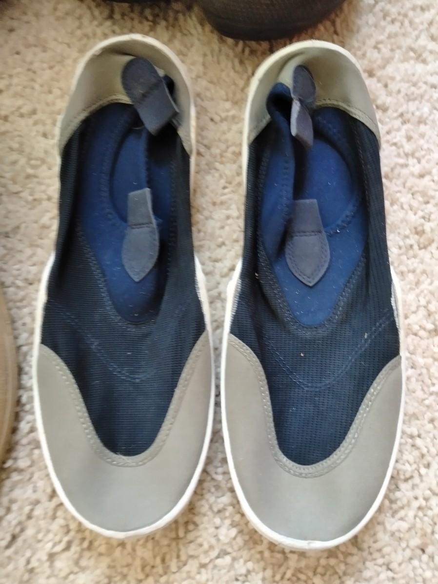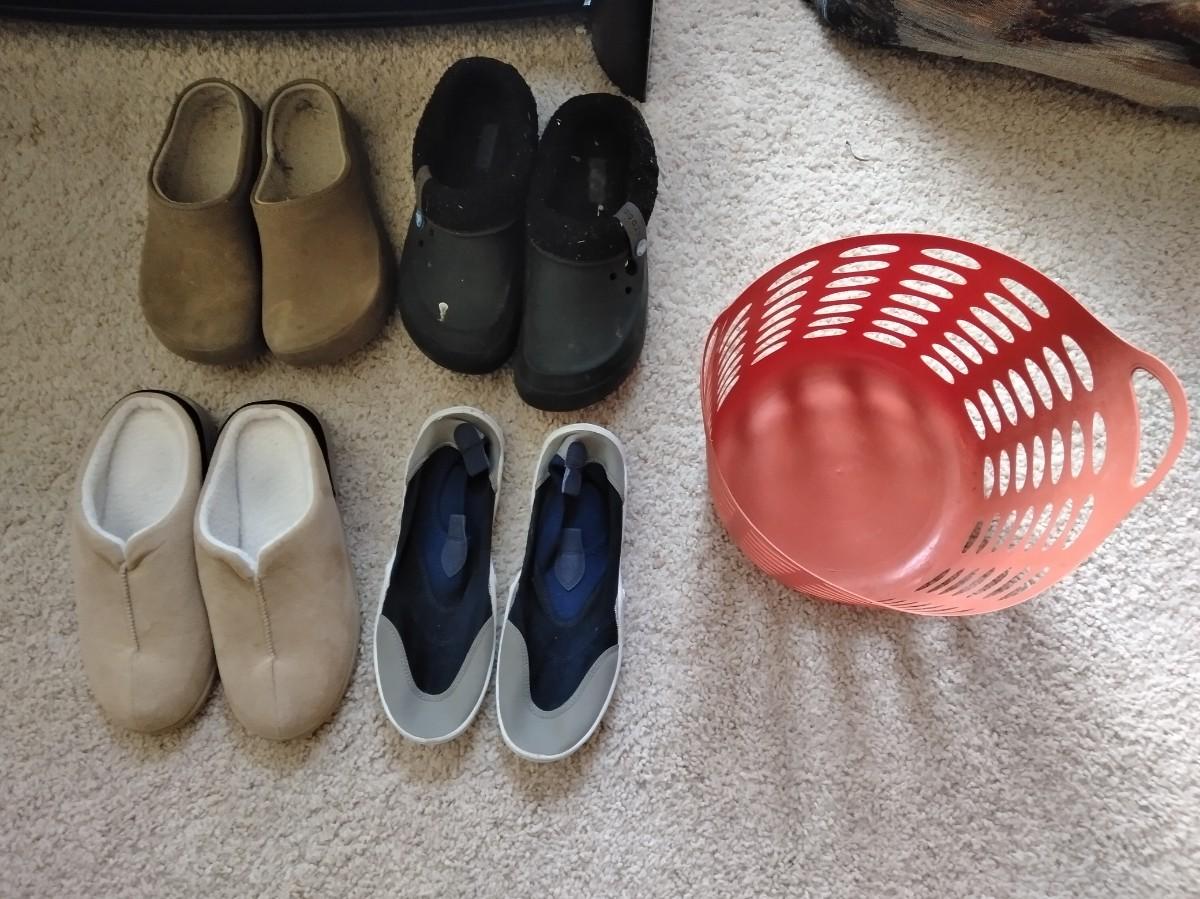 MEN'S SLIP-ON SHOES, LINED CROCKS, LINED SLIPPERS, WATER SHOES AND AN ORANGE STORAGE BASKET.