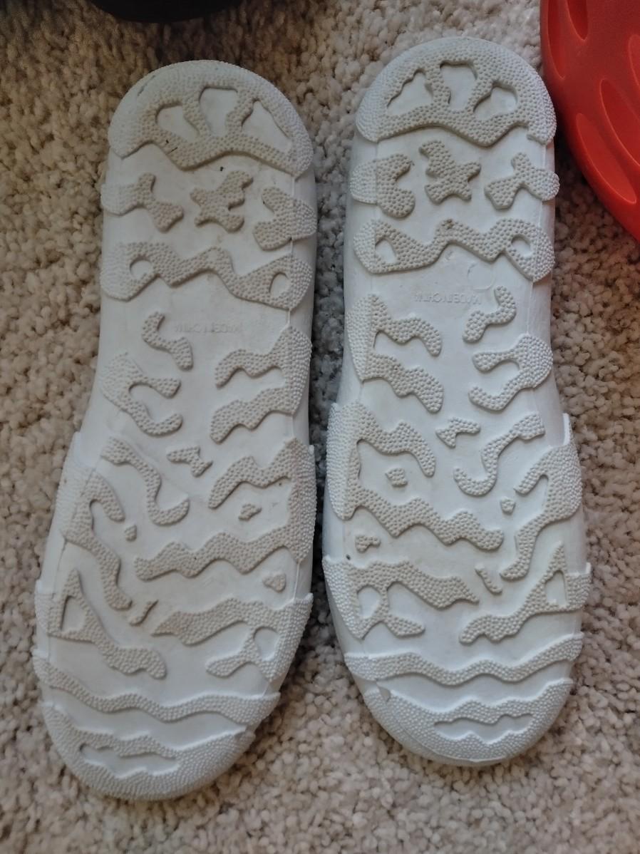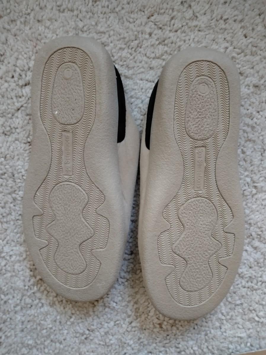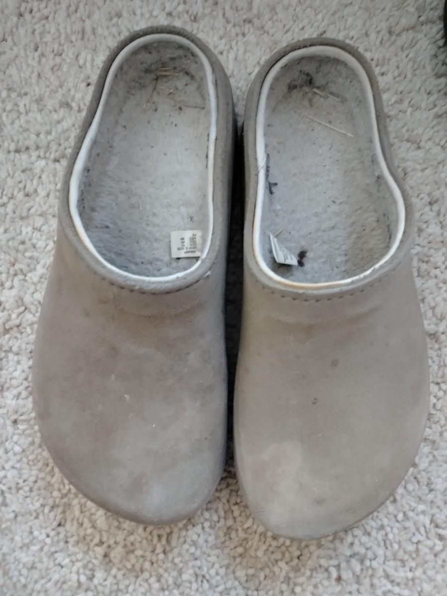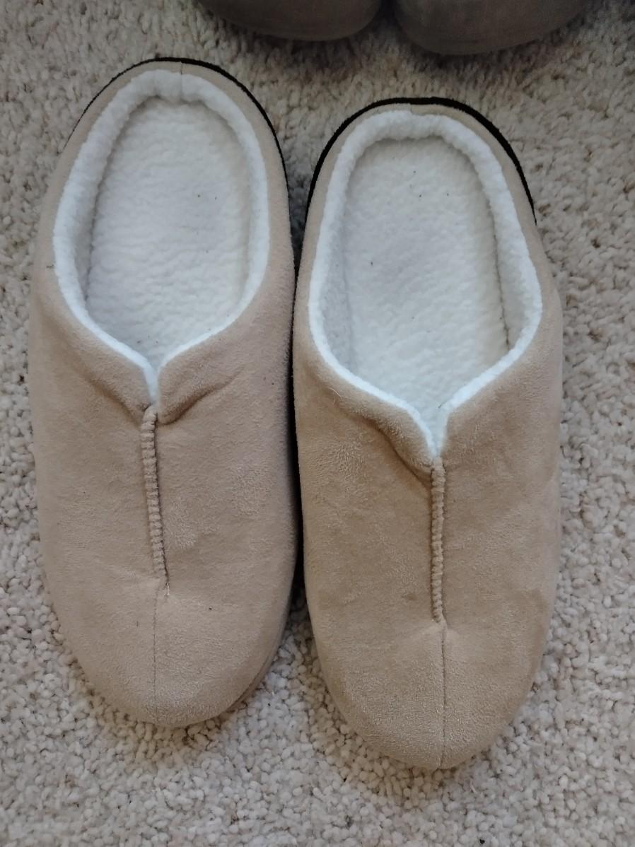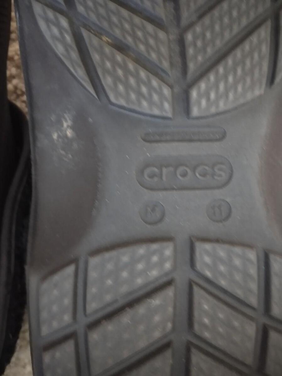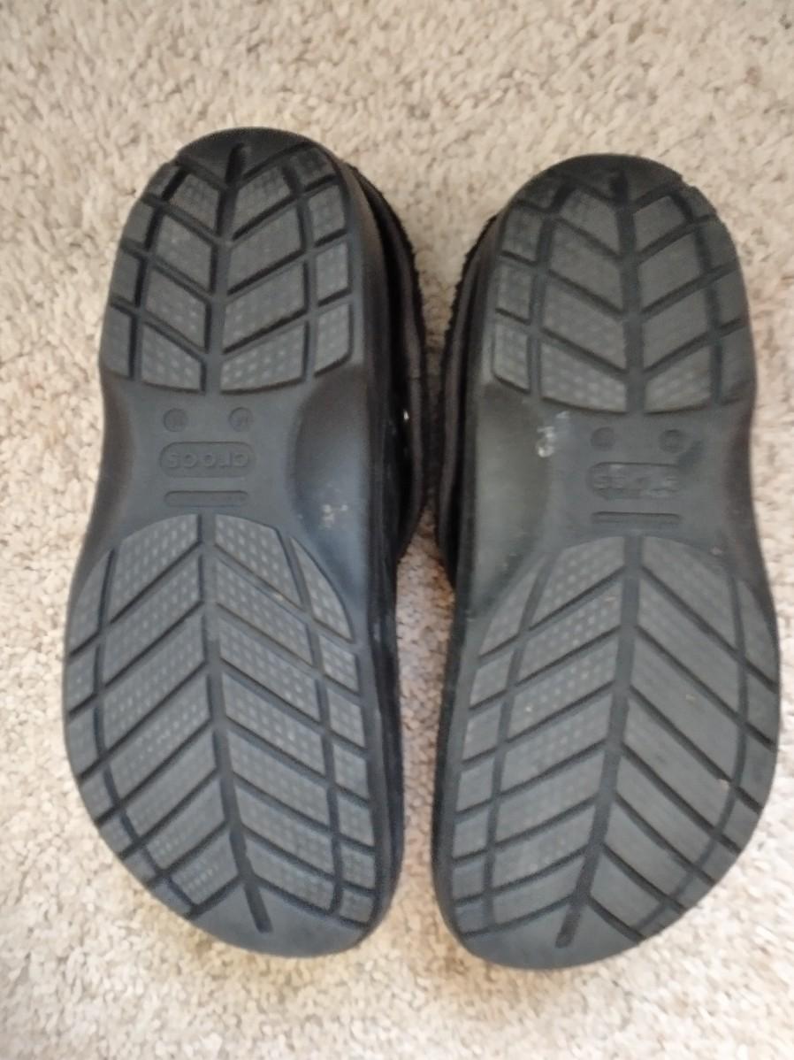 MEN'S SLIP-ON SHOES, LINED CROCKS, LINED SLIPPERS, WATER SHOES AND AN ORANGE STORAGE BASKET.