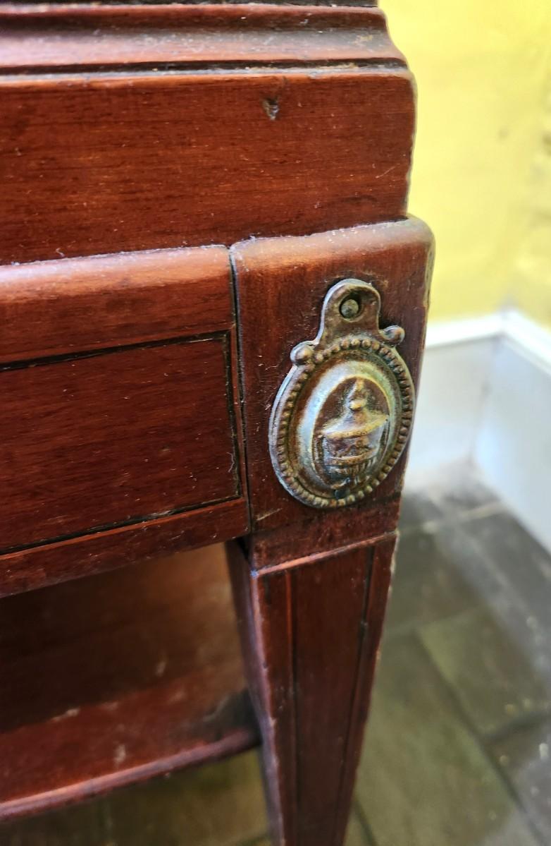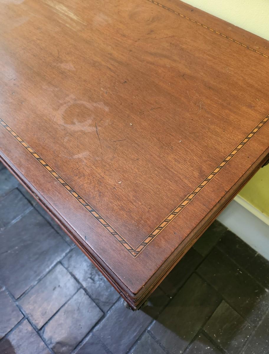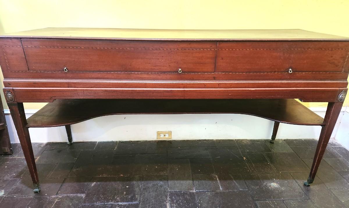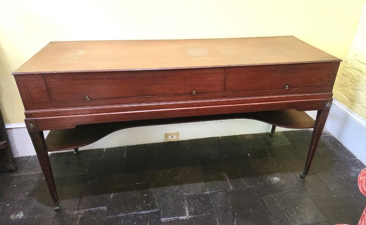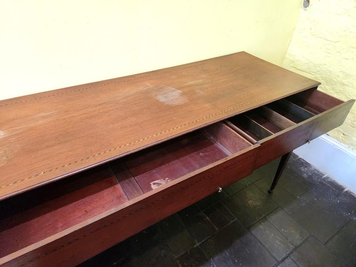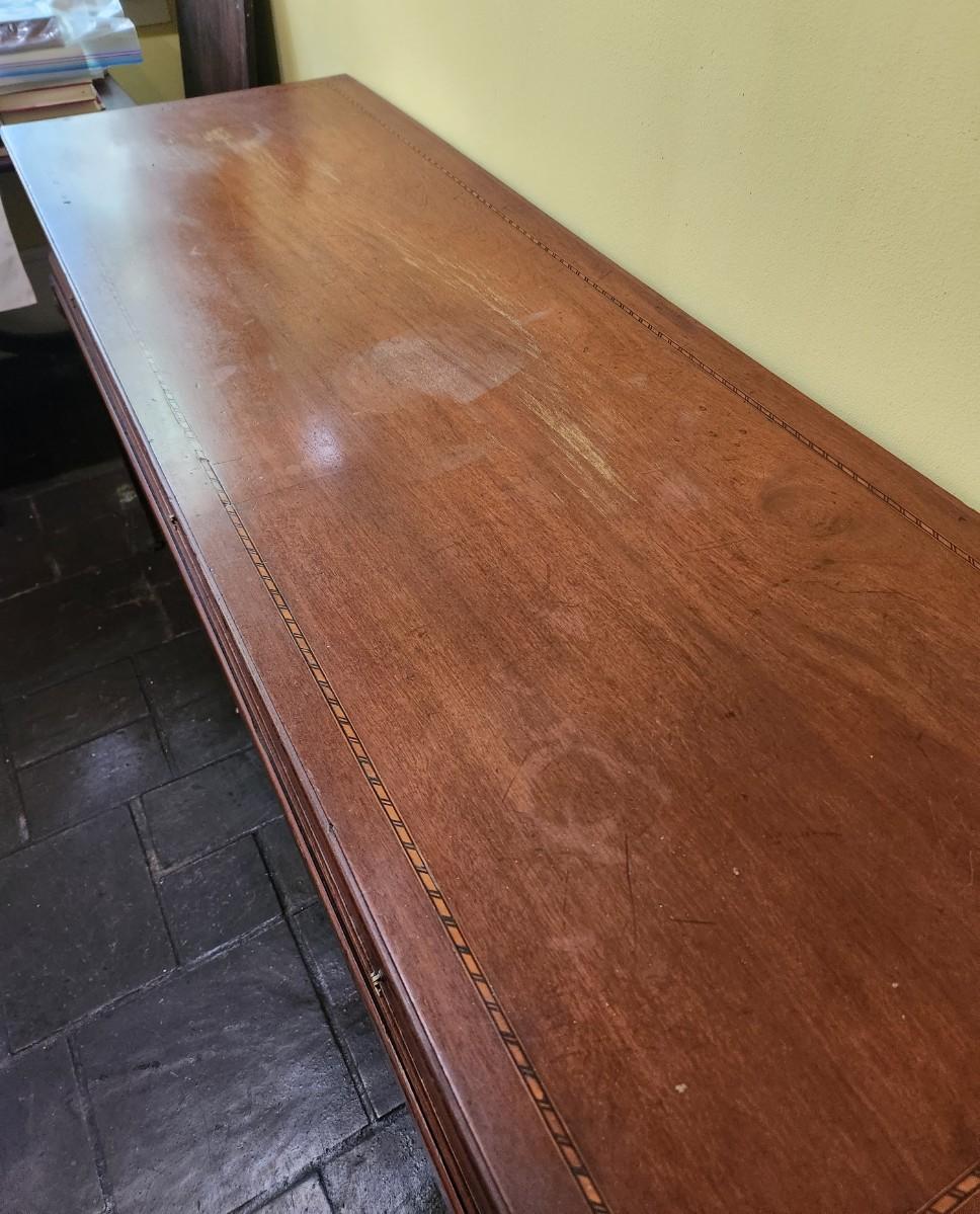 Antique sideboard with 2 drawers (one divided), original hardware. Banded inlay on top and drawers. 63" across, 21.5" deep, 32.5" tall. Top starting to lift off back right - easy fix - on castors. Shelves beneath. Antique condition.