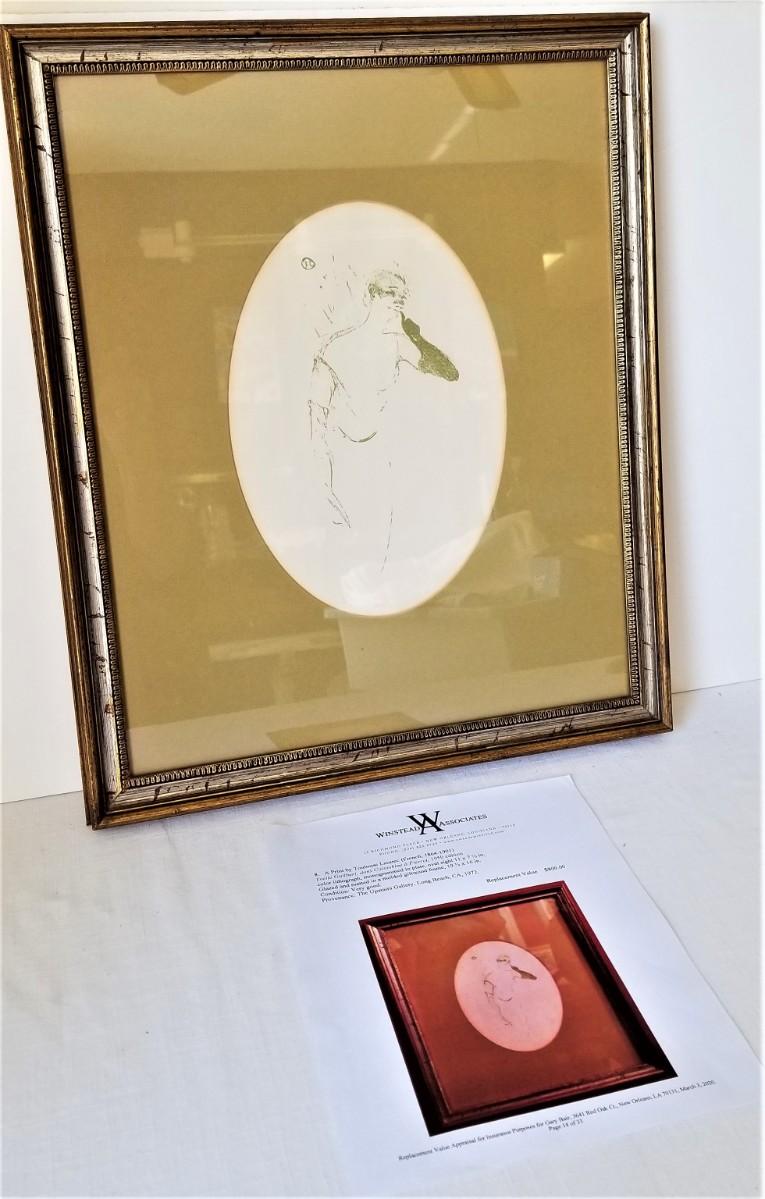 Color lithograph, monogrammed in plate, 1950 edition - glazed and matted in molded giltwood frame - originally purchased from The Upstairs Gallery in Long Beach, CA (1972). Oval sight of the plate measures 11" x 7.5" - whole thing is 19.75" x 16". Very good condition. This work was recently appraised by a certified local appraiser (buyer gets a copy) - replacement value was determined to be $800.00.