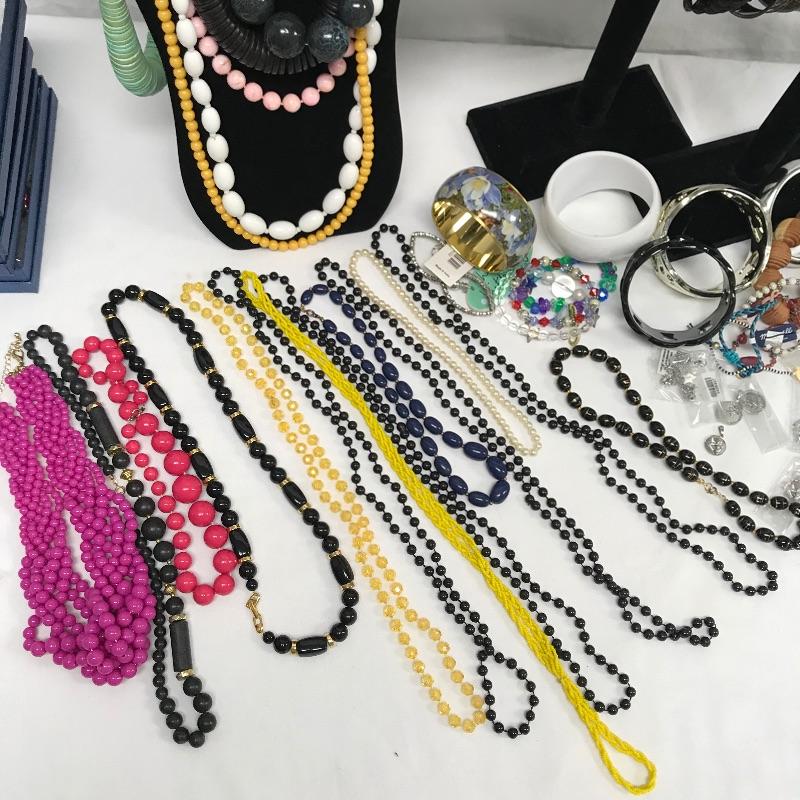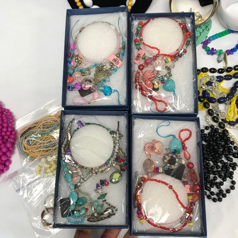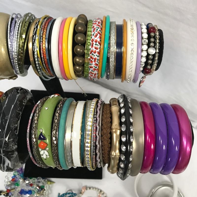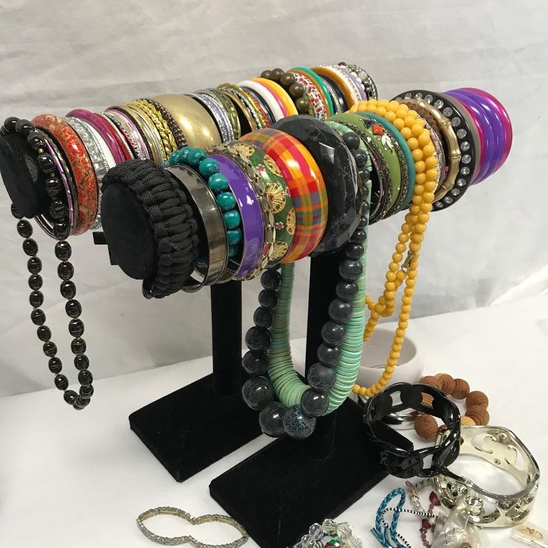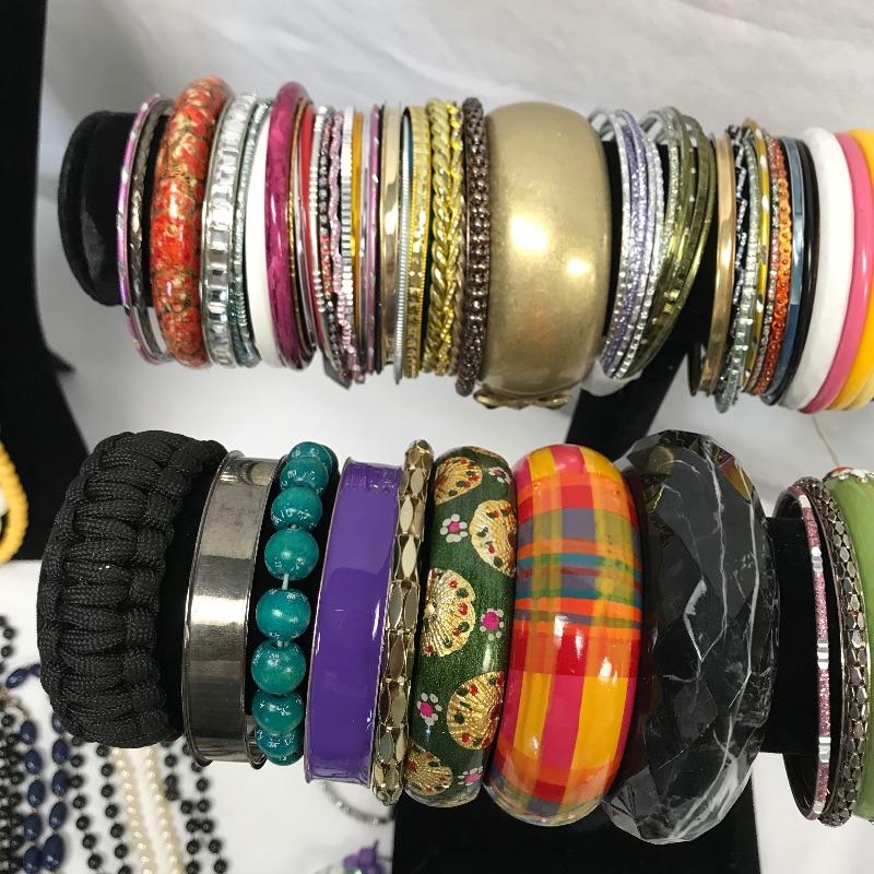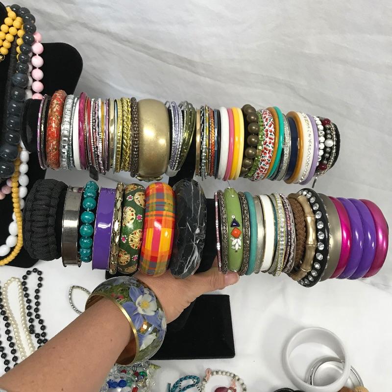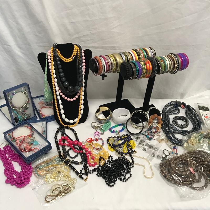 Sweet collection of bold, fun, funky pieces for all ages! Lots of bangles and some stretch bracelets made from all kinds of materials. Lot includes a huge variety of beaded necklaces, charms, four wrapped jewelry sets and more. See photos.