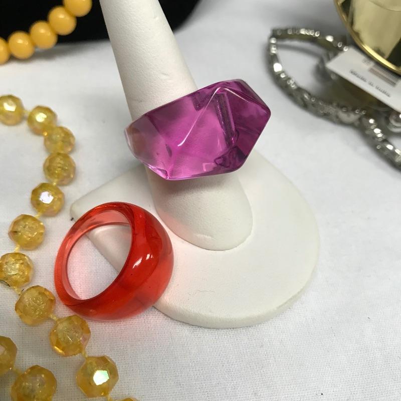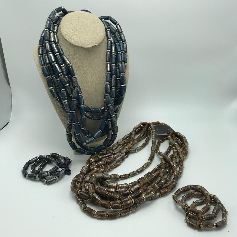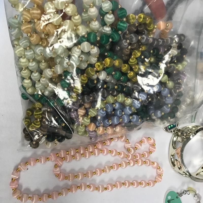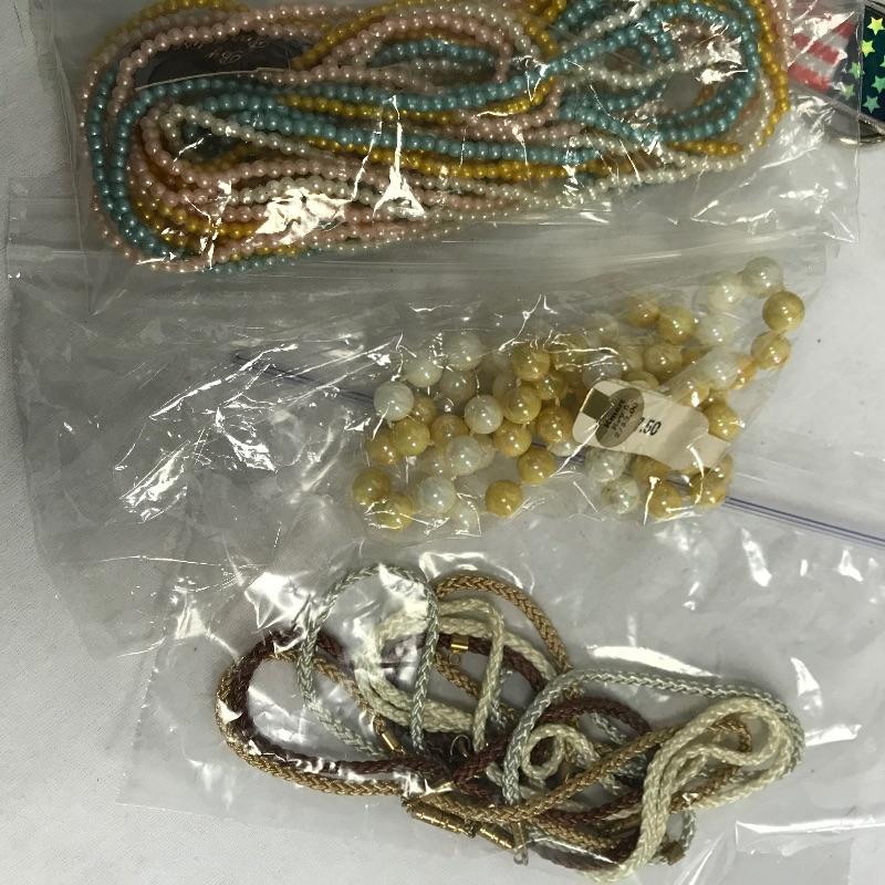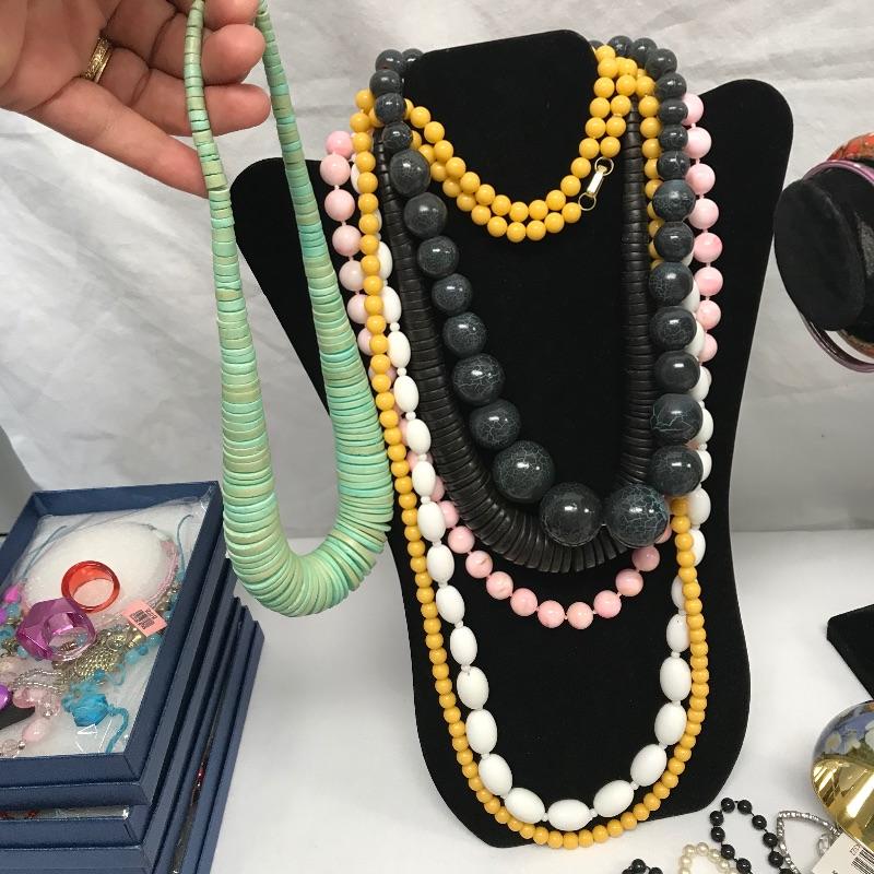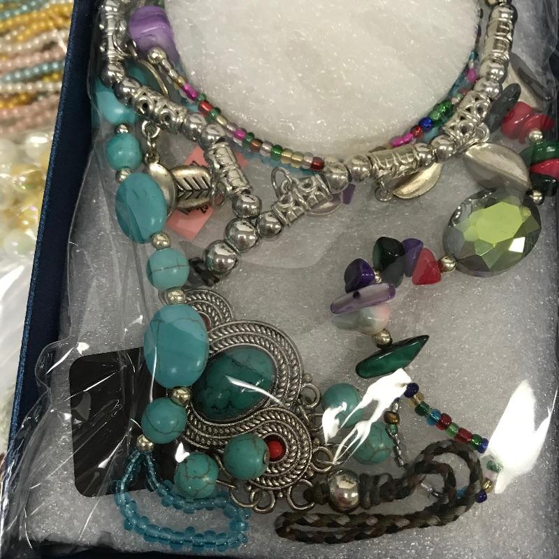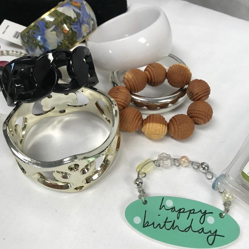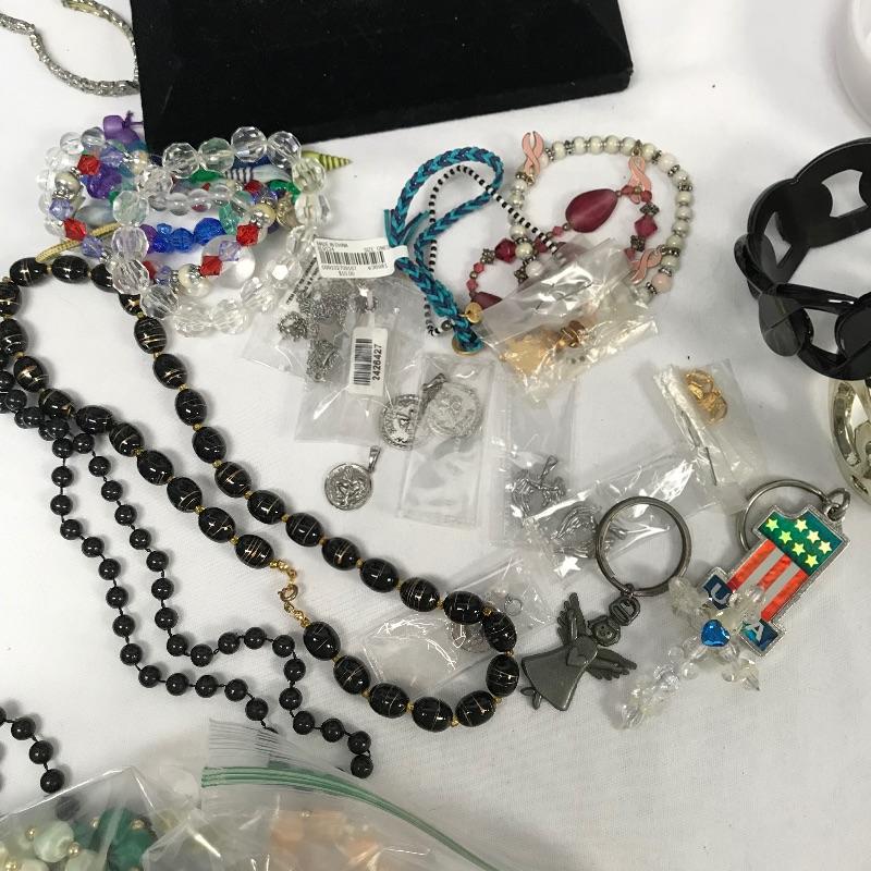 Sweet collection of bold, fun, funky pieces for all ages! Lots of bangles and some stretch bracelets made from all kinds of materials. Lot includes a huge variety of beaded necklaces, charms, four wrapped jewelry sets and more. See photos.