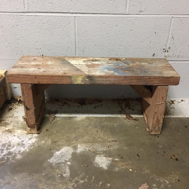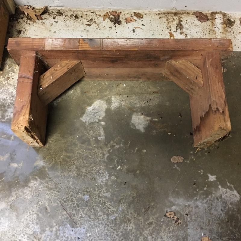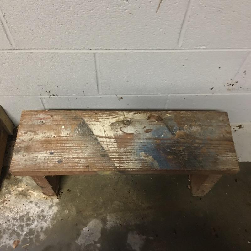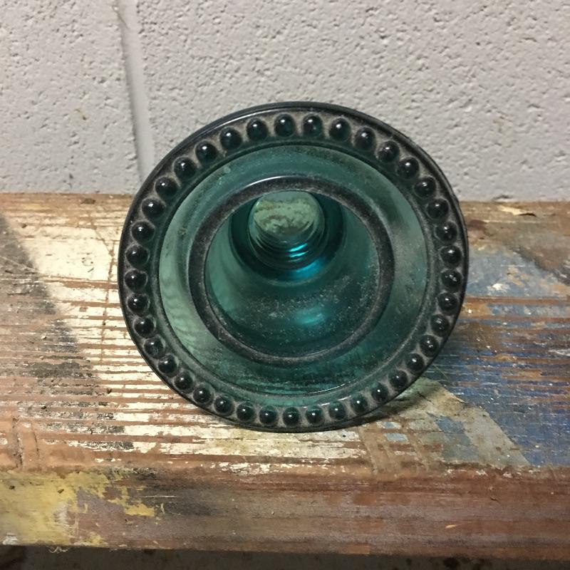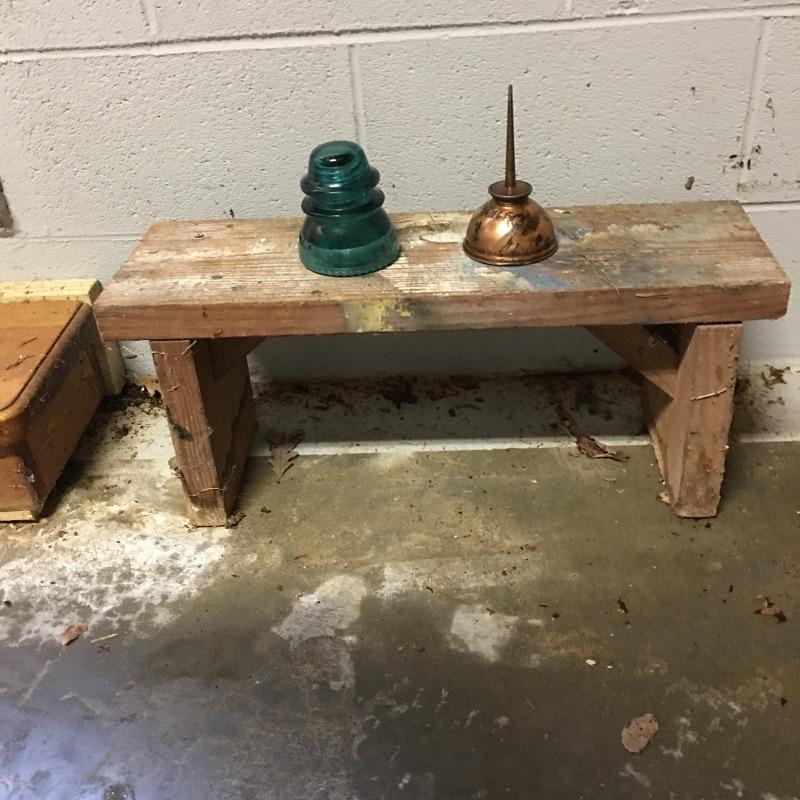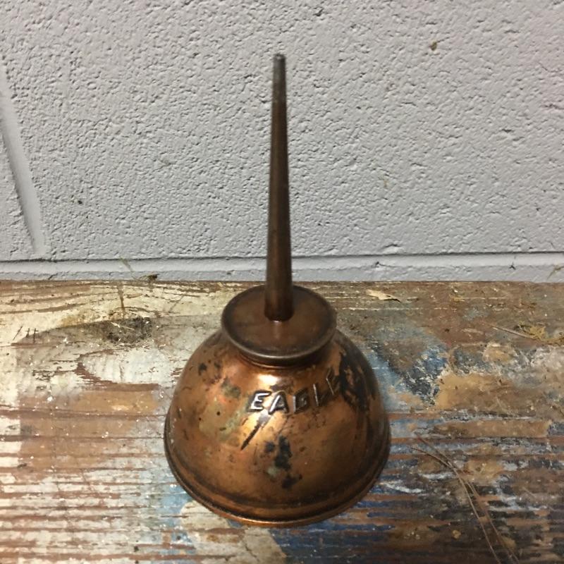 This vintage Eagle oil can is a great find. We have added a glass insulator and a small wooden bench that measures 7” x 23” x 10”.