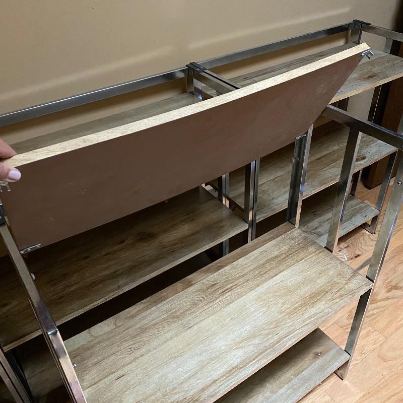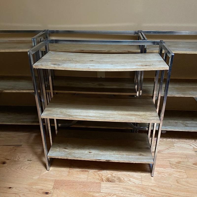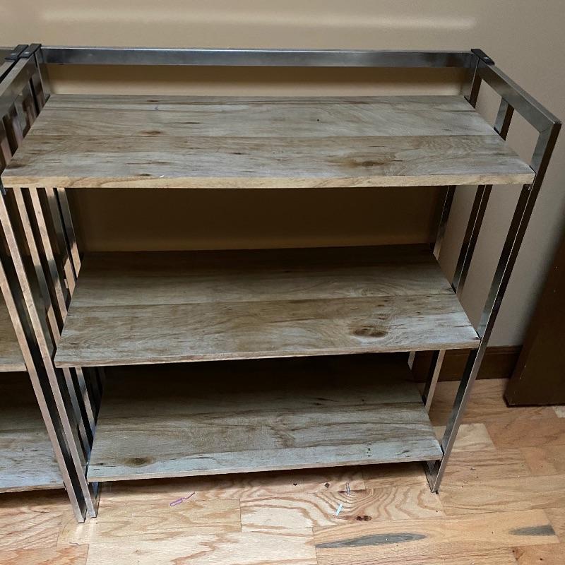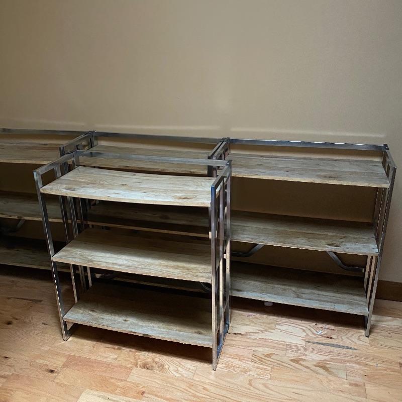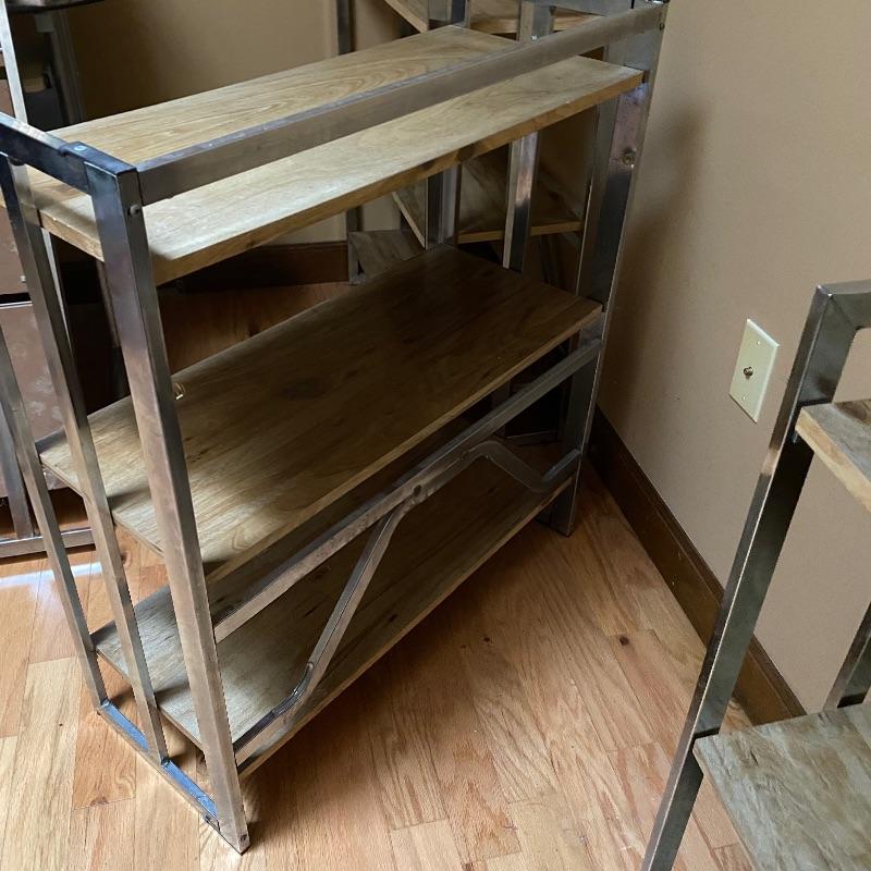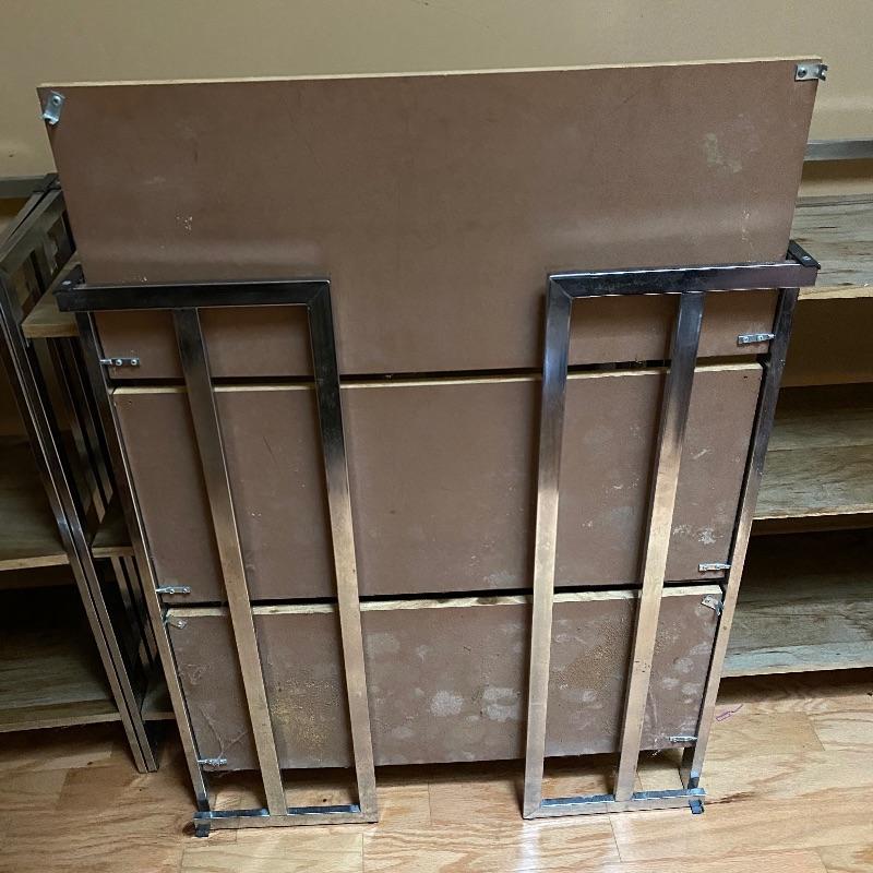 These modern looking shelving units are great for home or office. Use one or all four for lots of space. Each of these shelves folds up and sides fold in to close and store under a bed or in a closet! Nice light wood finish with silver metal sides. Pressed wood. In good condition with slight wear on metal and dirty shelves. Each one measures 29” x 12” x 33” tall. No shipping.