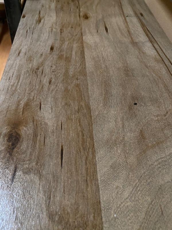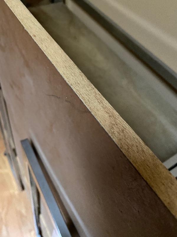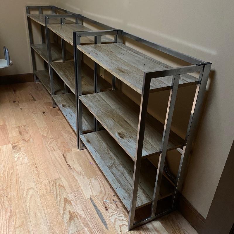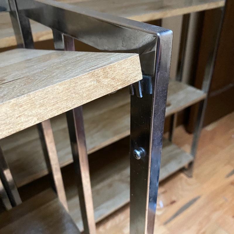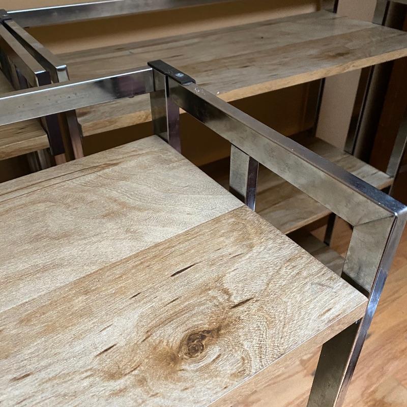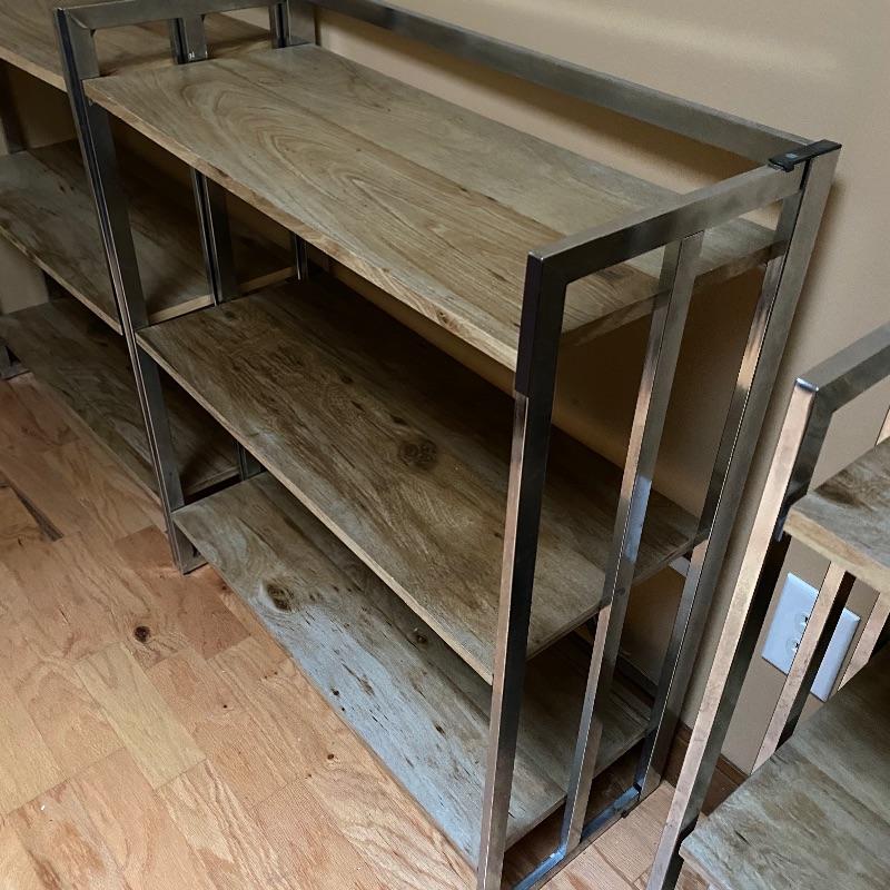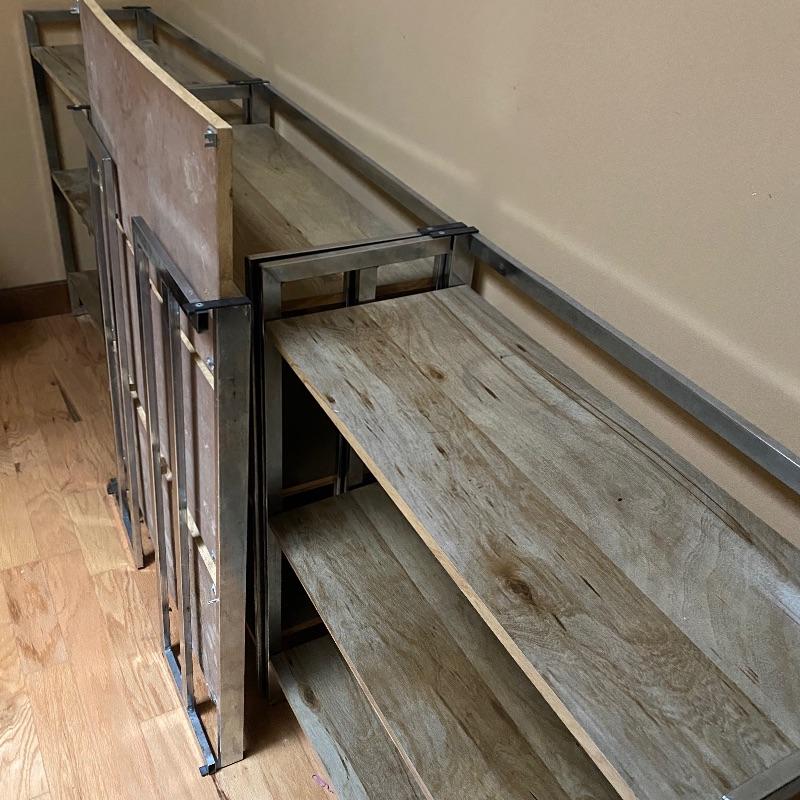 These modern looking shelving units are great for home or office. Use one or all four for lots of space. Each of these shelves folds up and sides fold in to close and store under a bed or in a closet! Nice light wood finish with silver metal sides. Pressed wood. In good condition with slight wear on metal and dirty shelves. Each one measures 29” x 12” x 33” tall. No shipping.