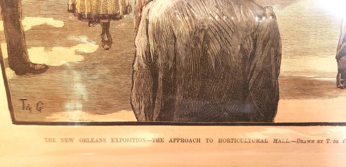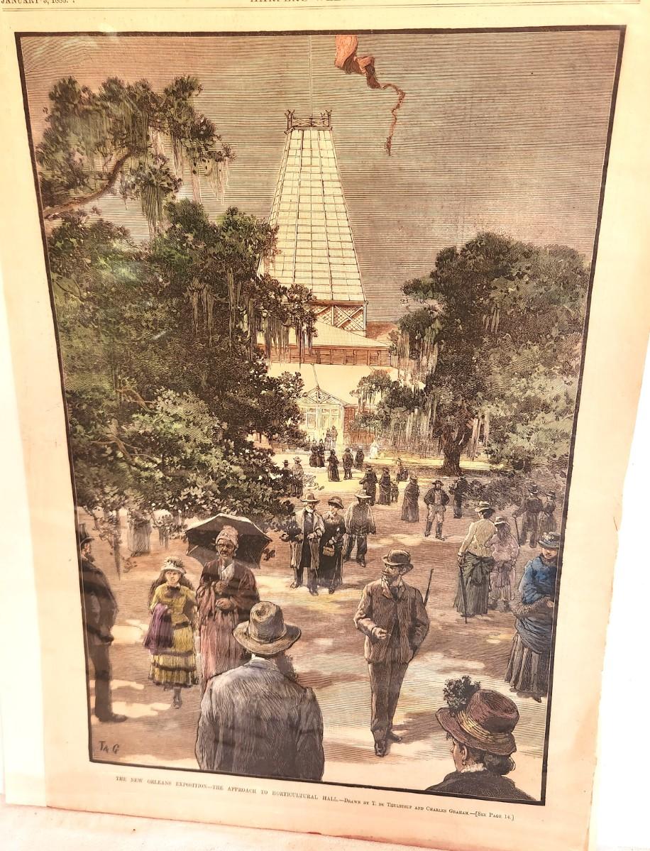 Hand colored scene from the New Orleans Worlds Fair of 1884 (Audubon Park). Like the fair in 1984, it was a colossal failure and lost a lot of money! However, it did get the city a lot of publicity in national publications of the day. 11" x 16" - hand colored.