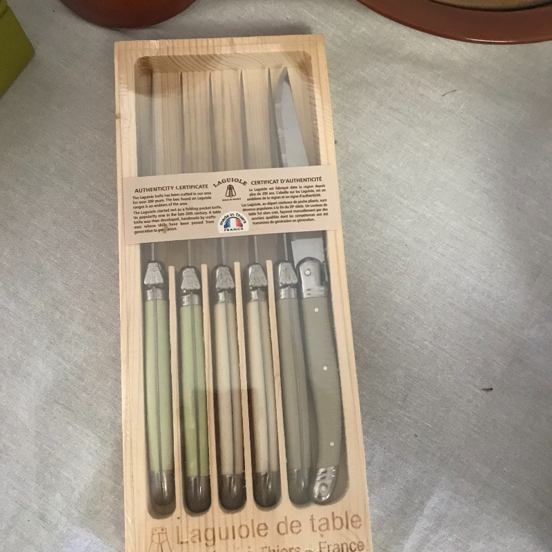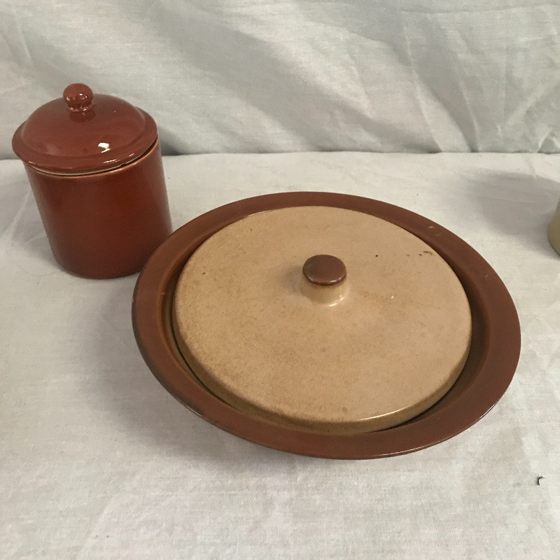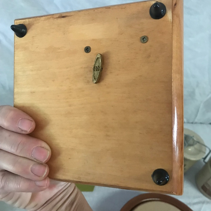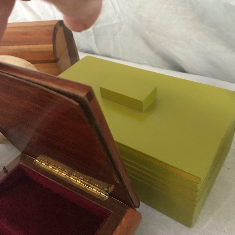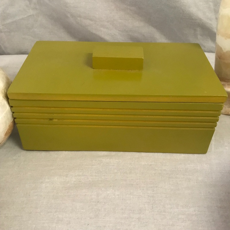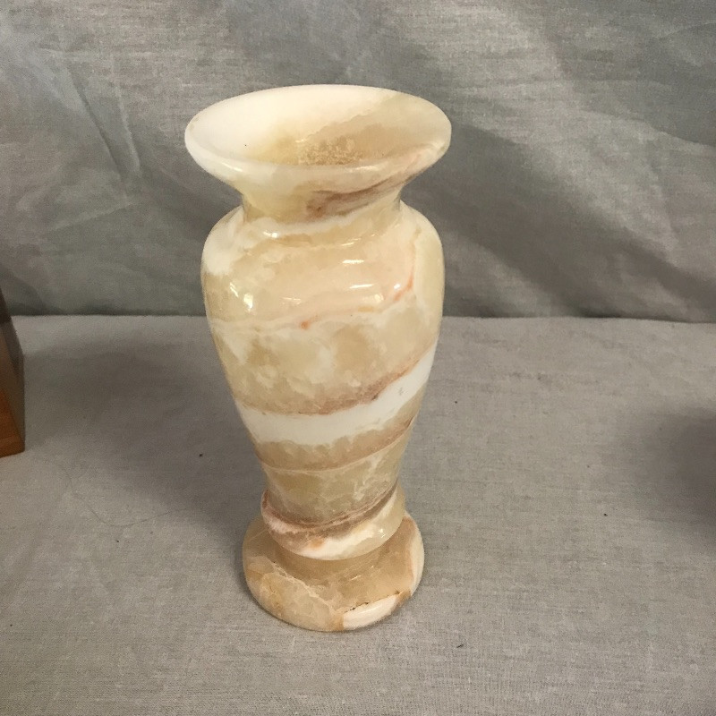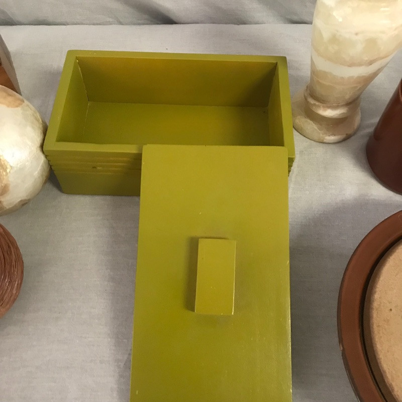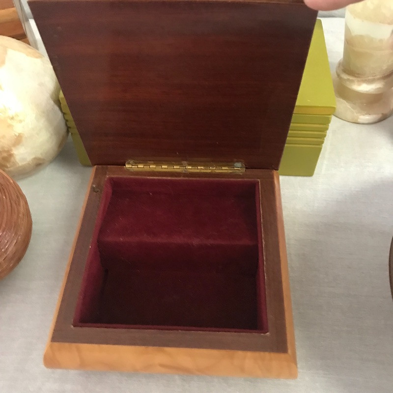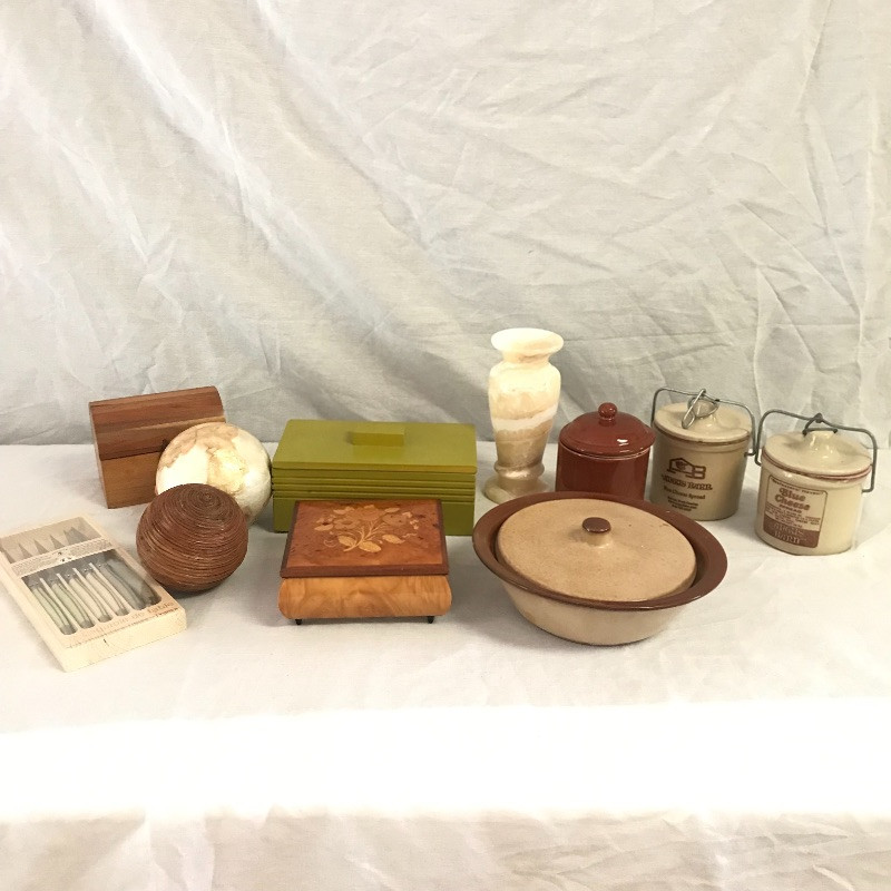 Lot includes two cheese crocks from Angus Barn in Raleigh, NC. A Brazilian bowl with lid, an Indonesian made green box with lid. A cream colored alabaster Vase, a wood trunk like box lined in red velvet, an ornate wooden music box, knife set still in packaging and a few more pieces. Local pick up only.