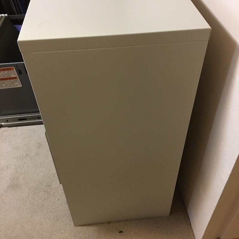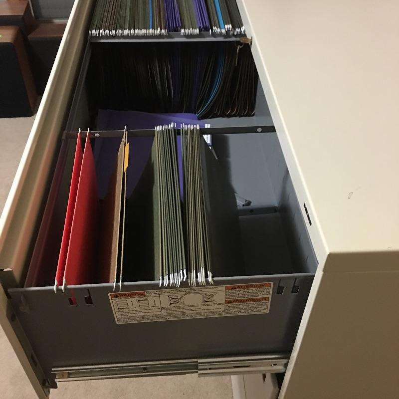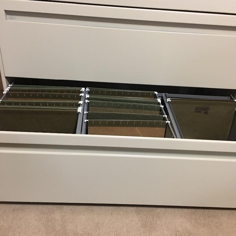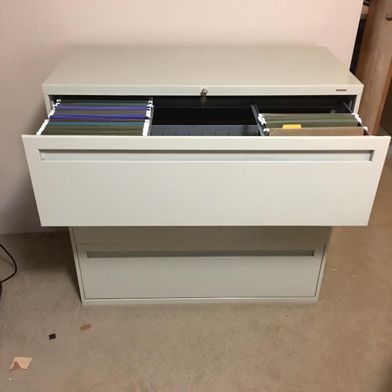 HON 3 drawer lateral metal file cabinet with keys and folders. Cabinet can accommodate three wide hanging folders in each drawer. An excellent way to safely store all your old files in this sleek file cabinet. Cabinet measures 19” x 42” x 40”.