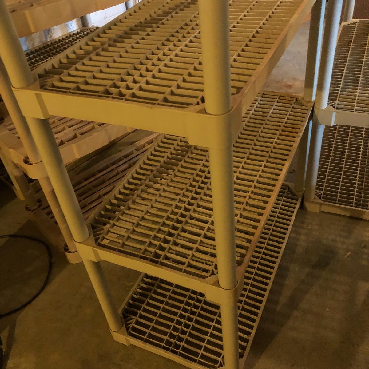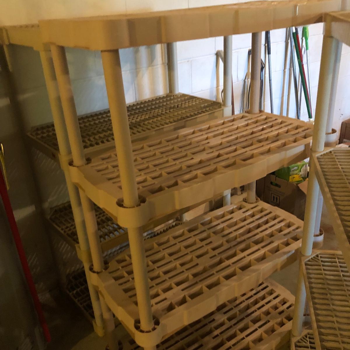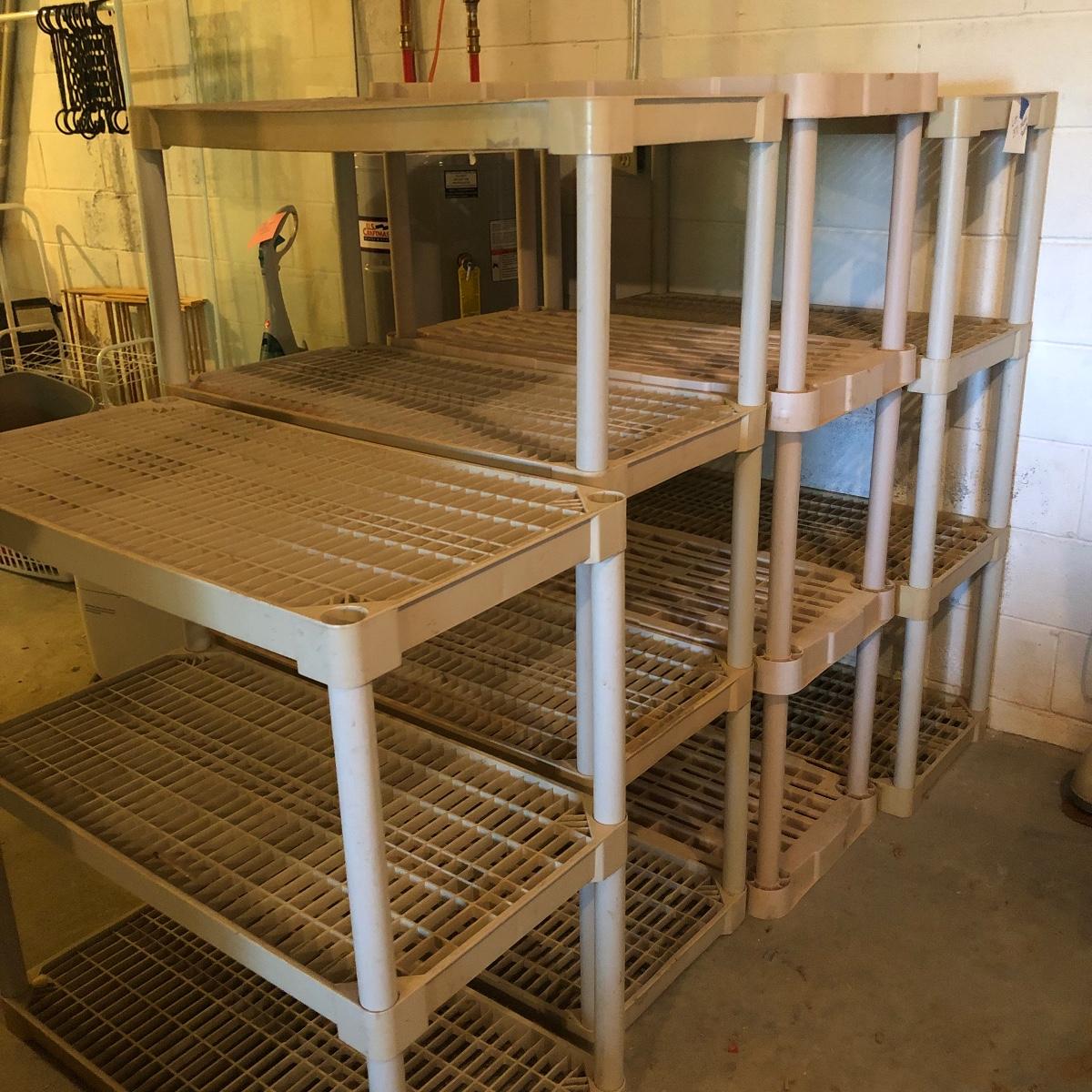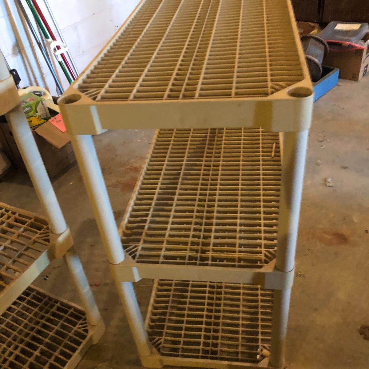 Get organized with this lot! It includes seven plastic Shelves. Four have four shelves and measure approximately 35.5” x 17.5” x 54”. The other beige shelf only has three shelves and is 37” tall. The other two white shelves have five shelves and measures 35.5” x 18” x 74”. Please note the stains on one of the white shelves and damage (looks as if it will come off with some cleaning). Local pick up only.