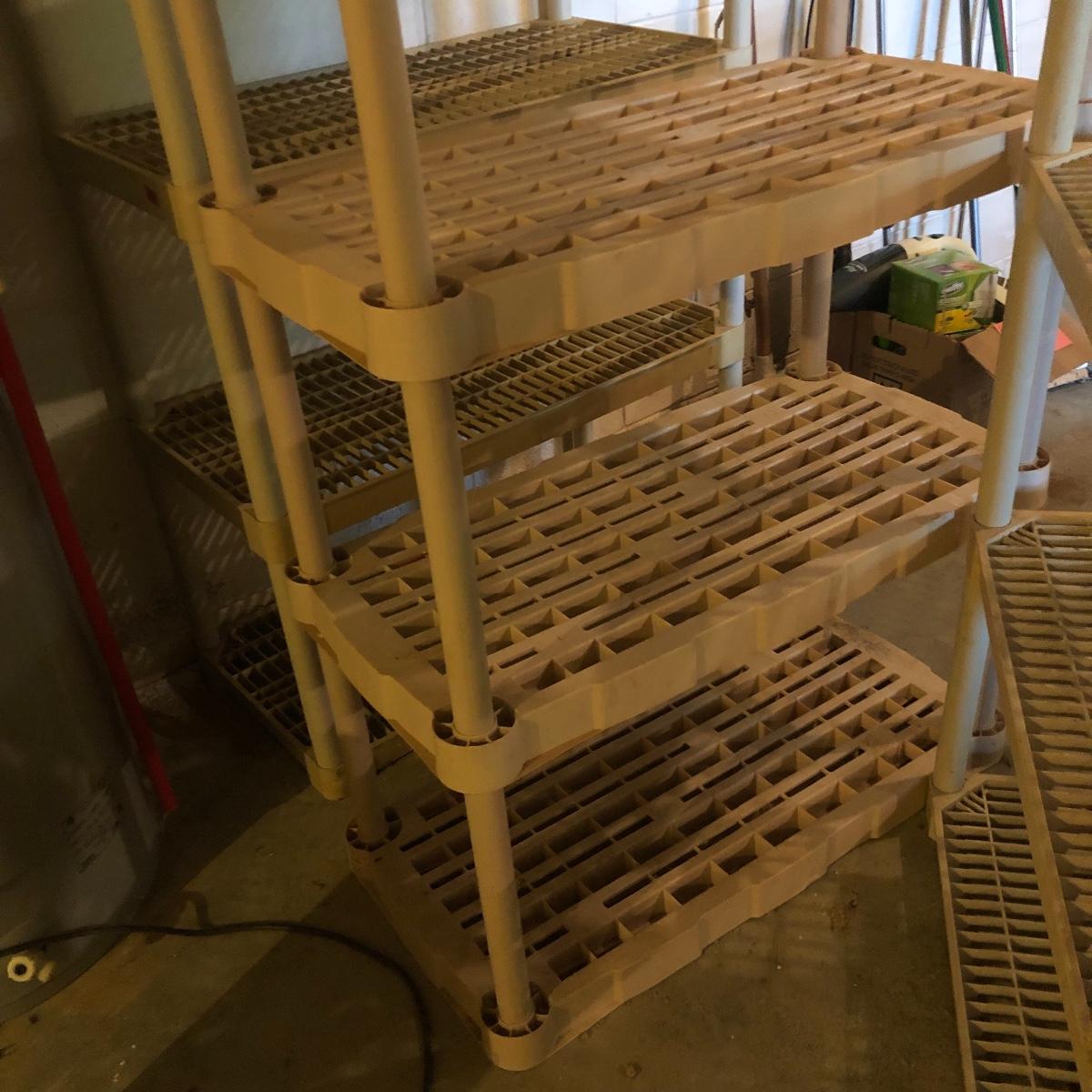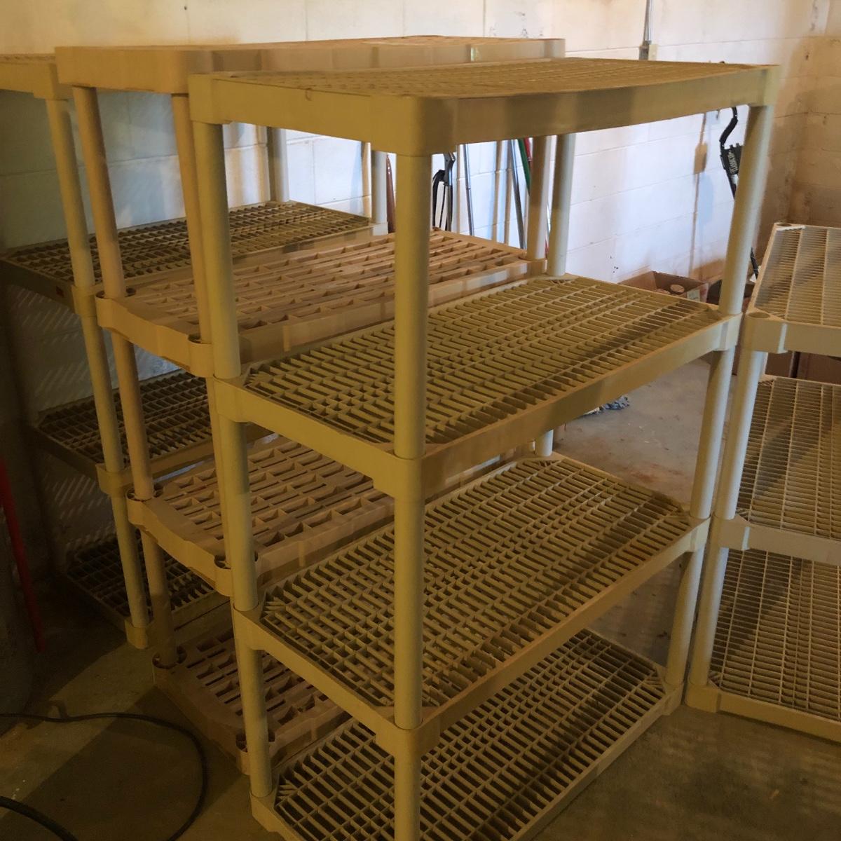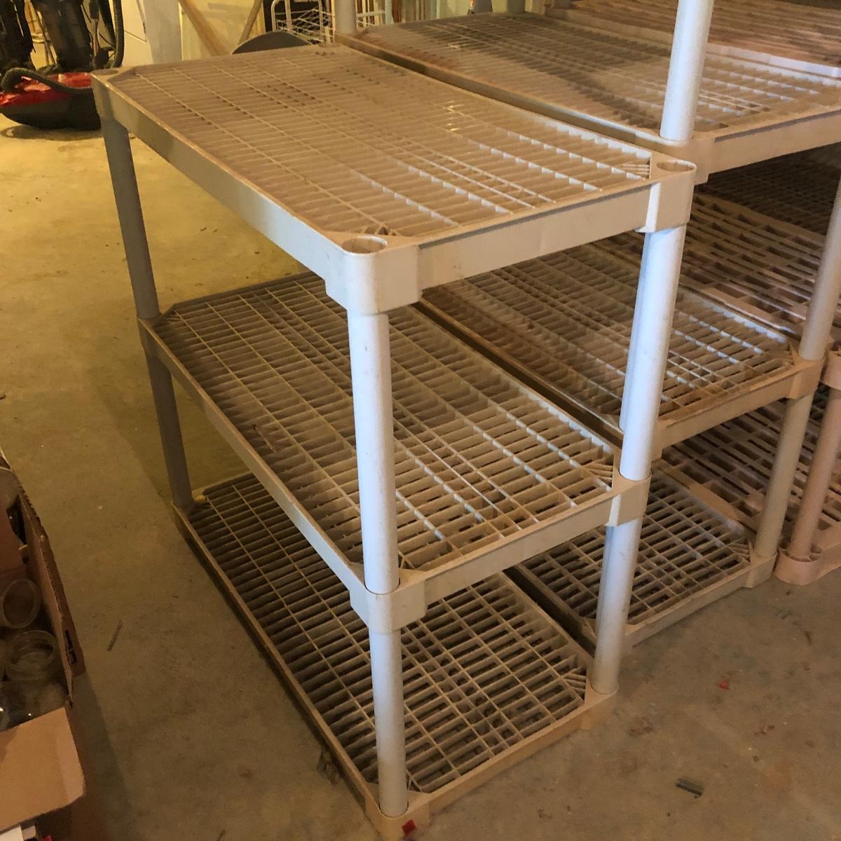 Get organized with this lot! It includes seven plastic Shelves. Four have four shelves and measure approximately 35.5” x 17.5” x 54”. The other beige shelf only has three shelves and is 37” tall. The other two white shelves have five shelves and measures 35.5” x 18” x 74”. Please note the stains on one of the white shelves and damage (looks as if it will come off with some cleaning). Local pick up only.