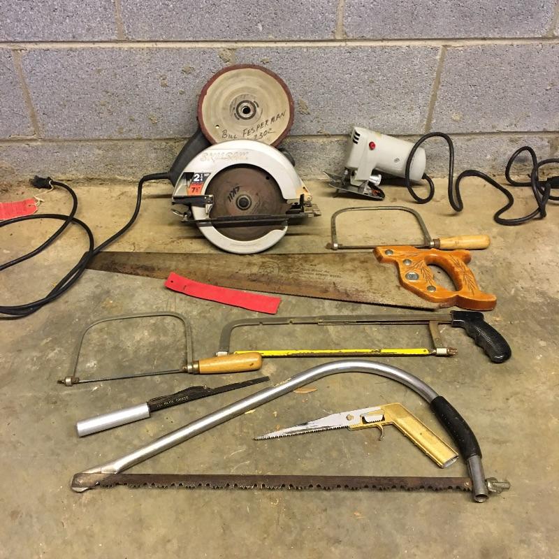 This lot is full of saws in all sizes and for a multitude of jobs. Included is a Skil Saw 7.25” circular saw, Power House Sabre saw, hacksaw, coping saw, wood saw, tree saw and more, see images.