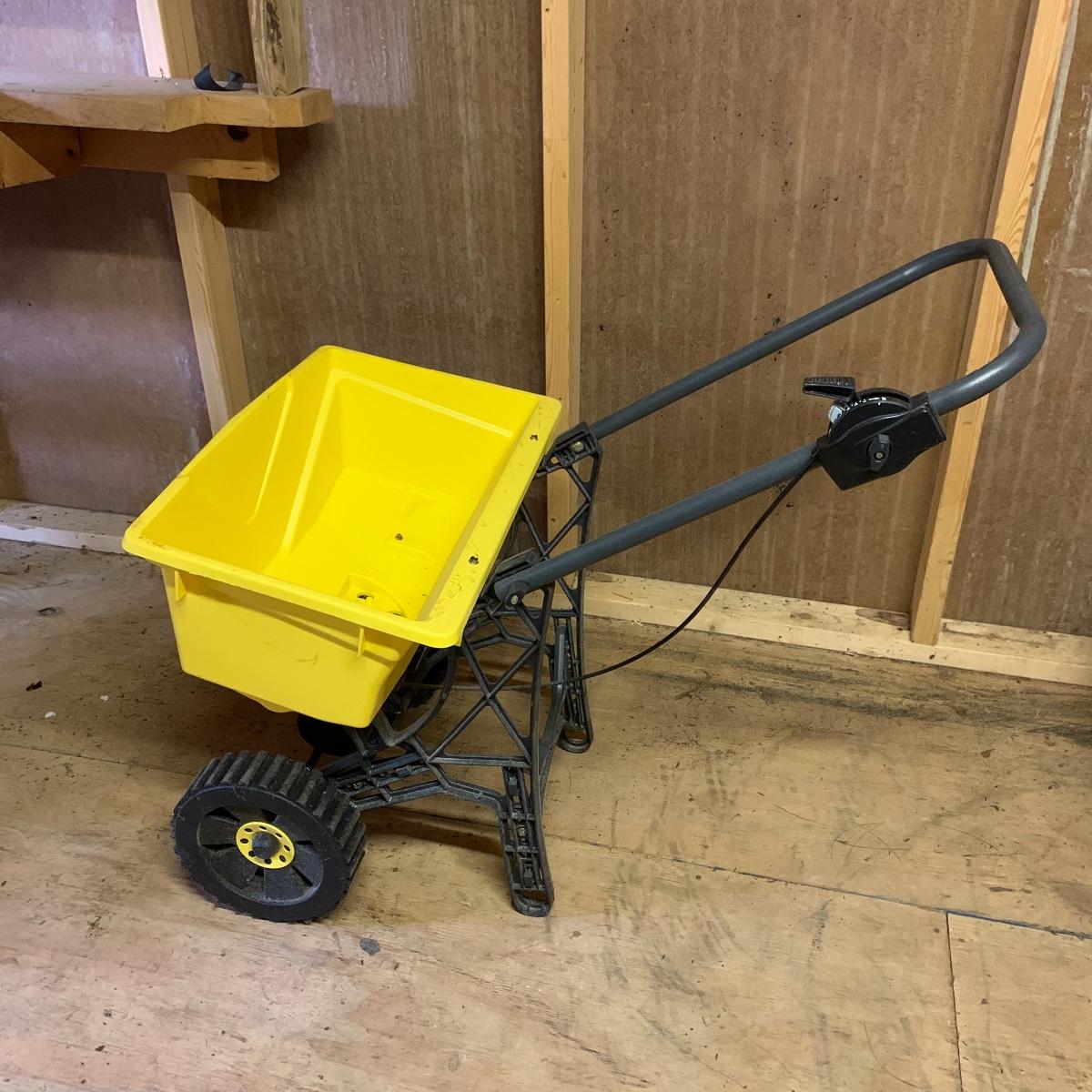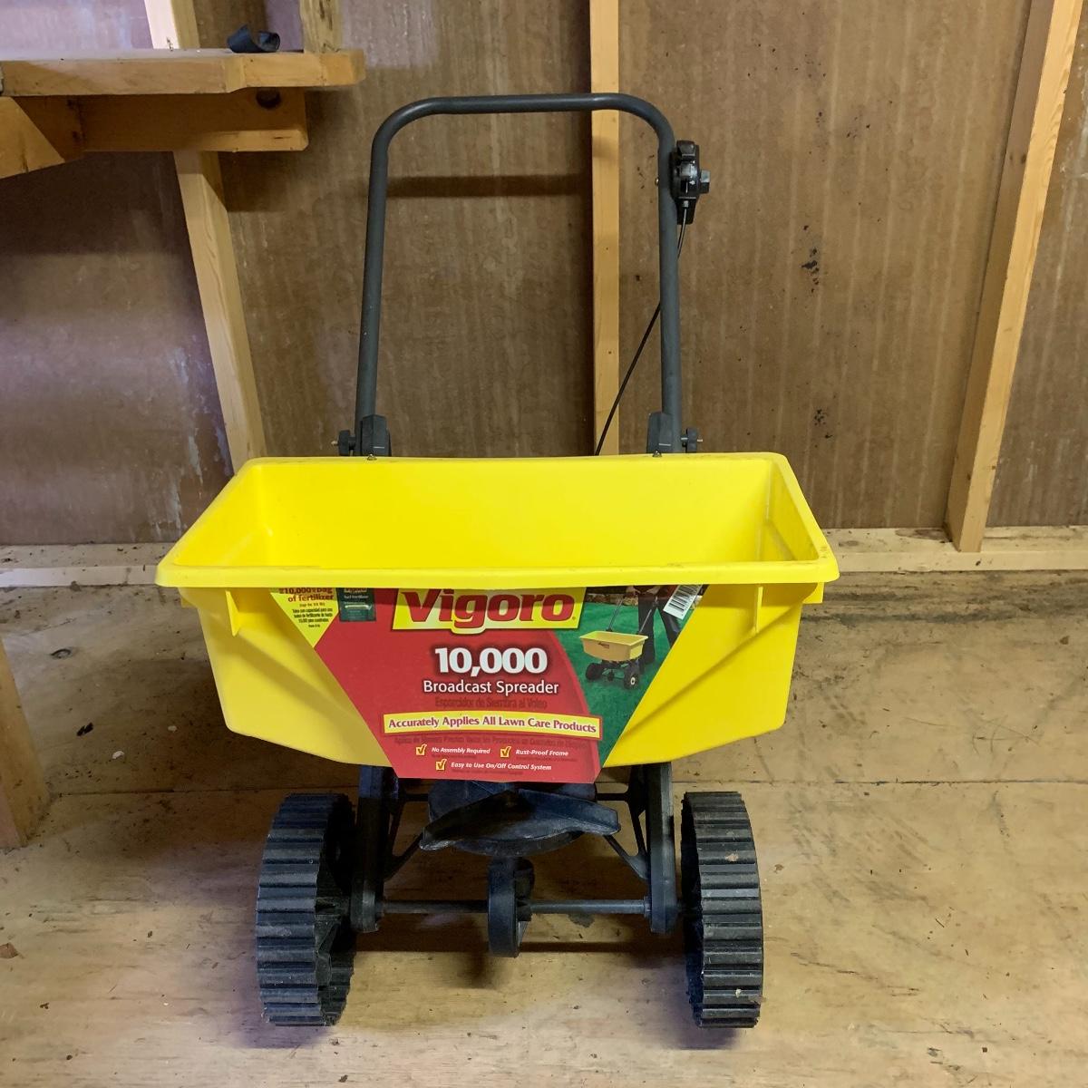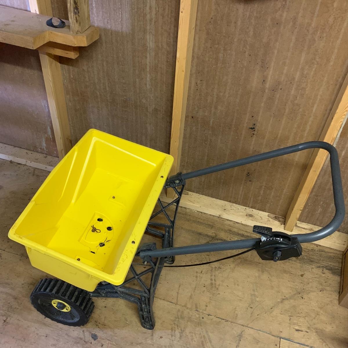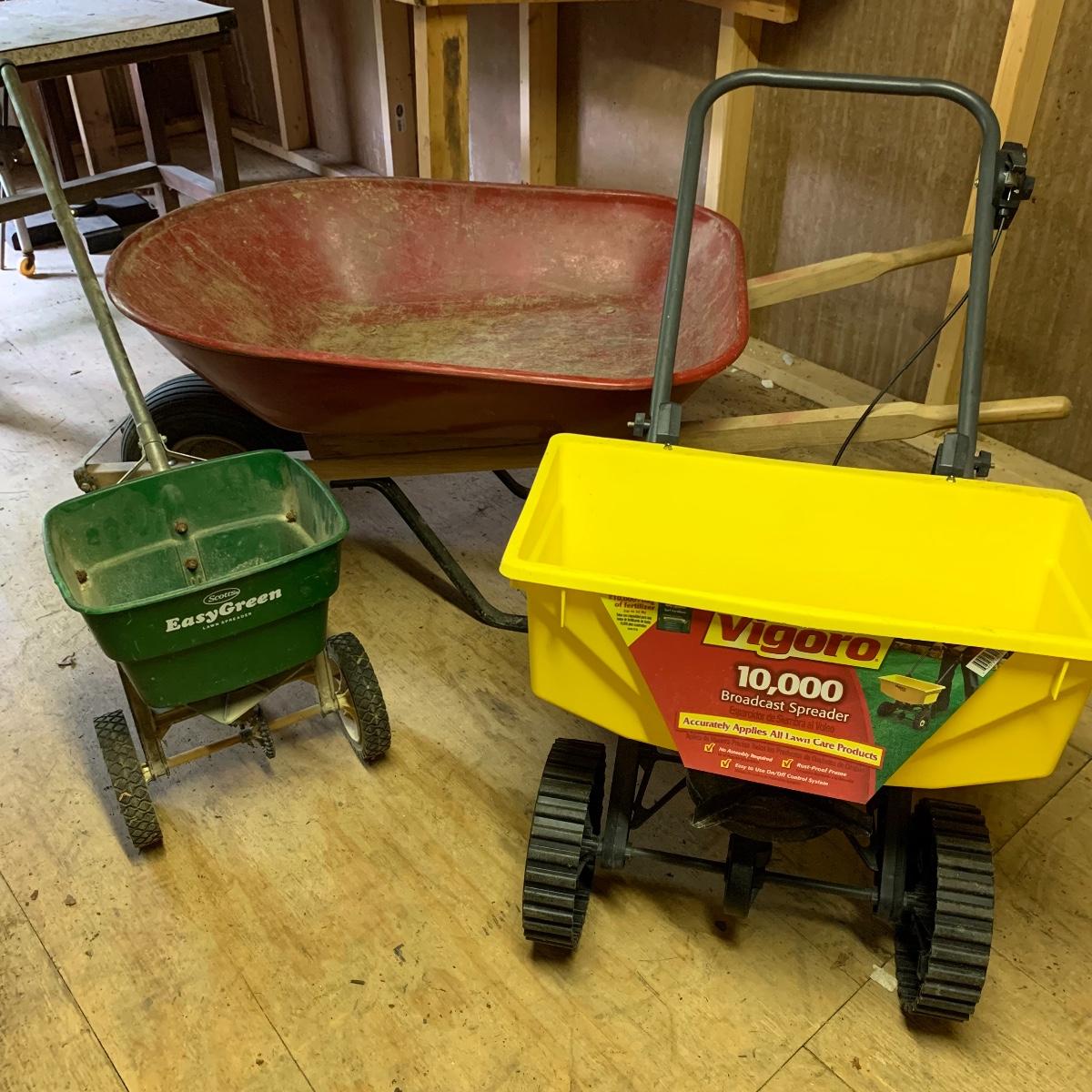 This lot contains two spreaders and and wheelbarrow. There is a yellow Vigaro 10,000 Broadcast Spreader that appears to be new or very gently used. From its longest points, it is 33” long and 32” tall. There is a smaller Scotts Easy Green Lawn Spreader that is in used but good condition. This one is 42” long from handle to front. And there is a nice big red metal wheelbarrow with wooden handles that appear to be in used but excellent condition. It measures 59” along the wooden handles to the longest point at the front. Local pickup only.