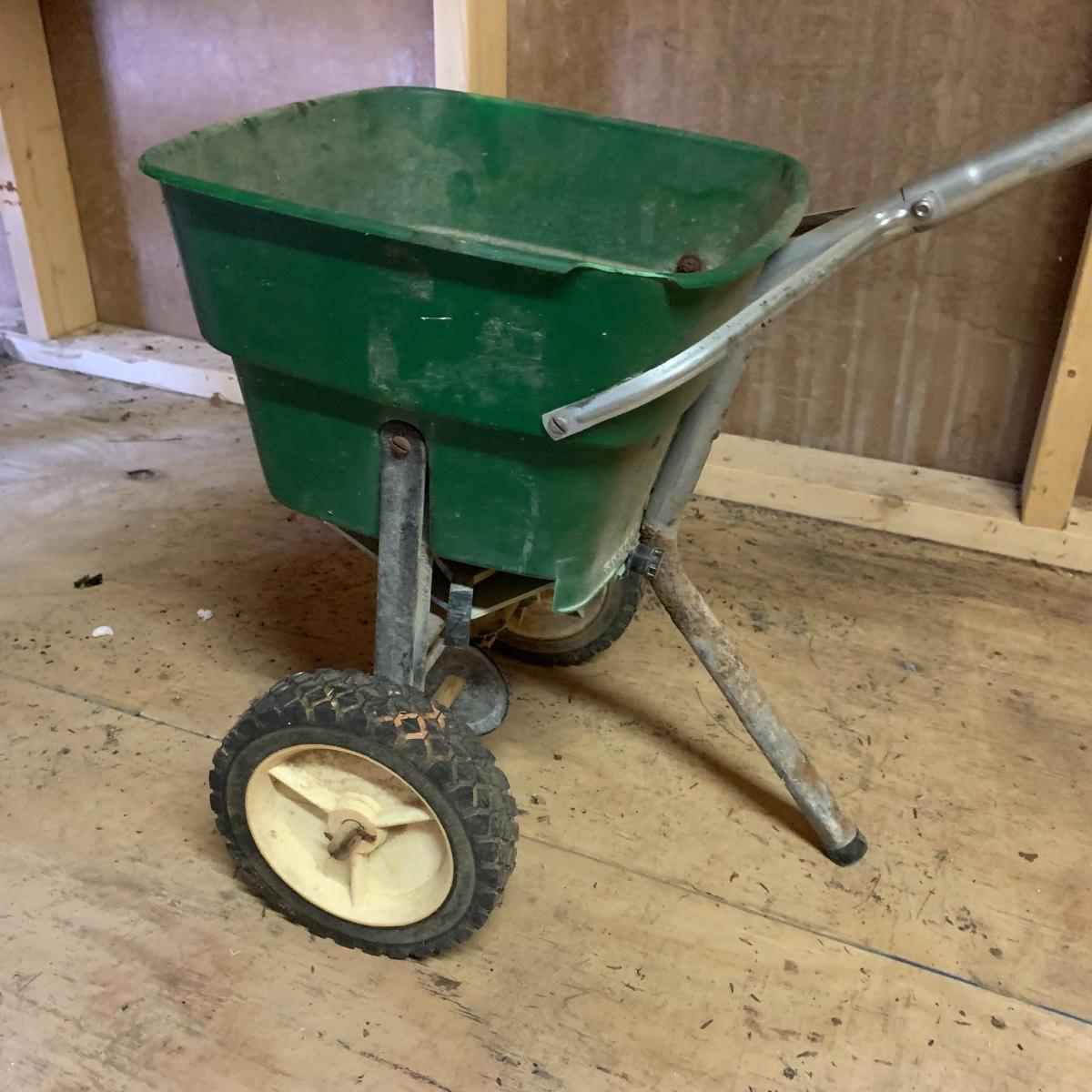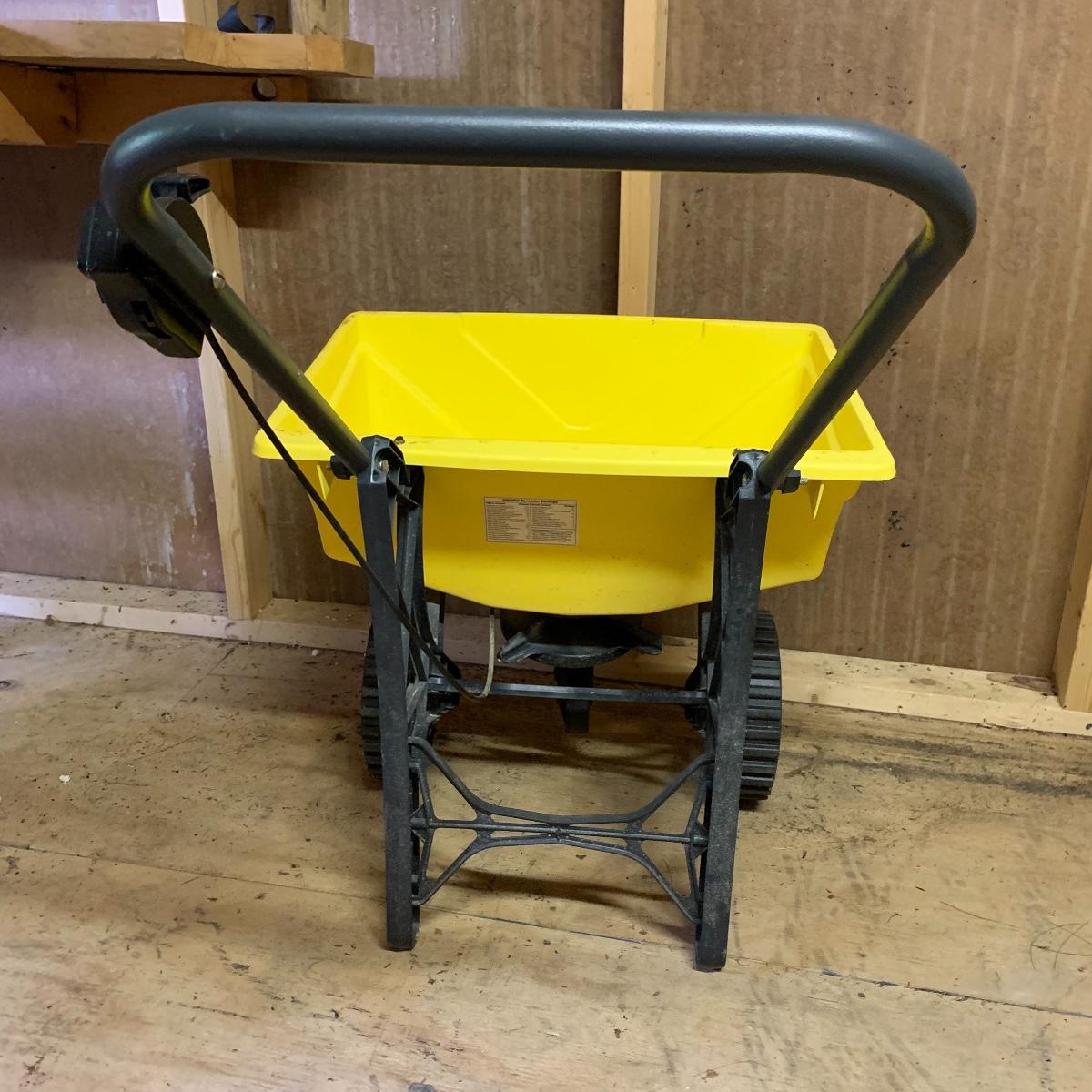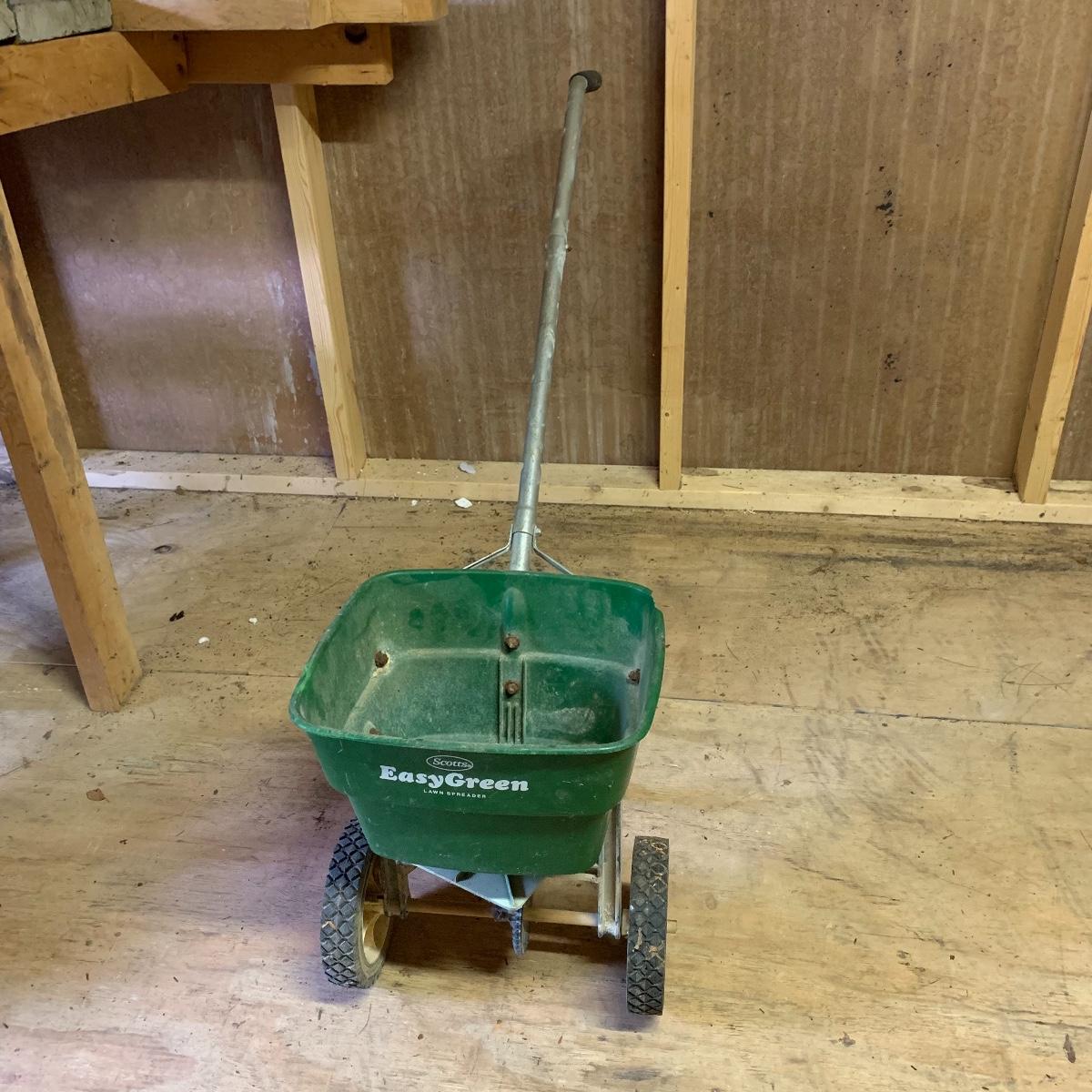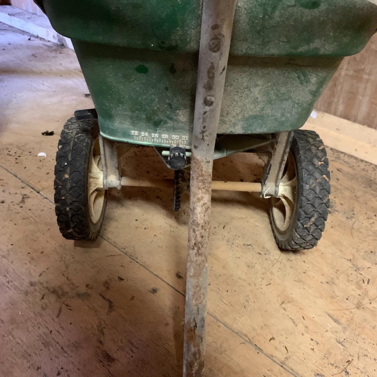 This lot contains two spreaders and and wheelbarrow. There is a yellow Vigaro 10,000 Broadcast Spreader that appears to be new or very gently used. From its longest points, it is 33” long and 32” tall. There is a smaller Scotts Easy Green Lawn Spreader that is in used but good condition. This one is 42” long from handle to front. And there is a nice big red metal wheelbarrow with wooden handles that appear to be in used but excellent condition. It measures 59” along the wooden handles to the longest point at the front. Local pickup only.