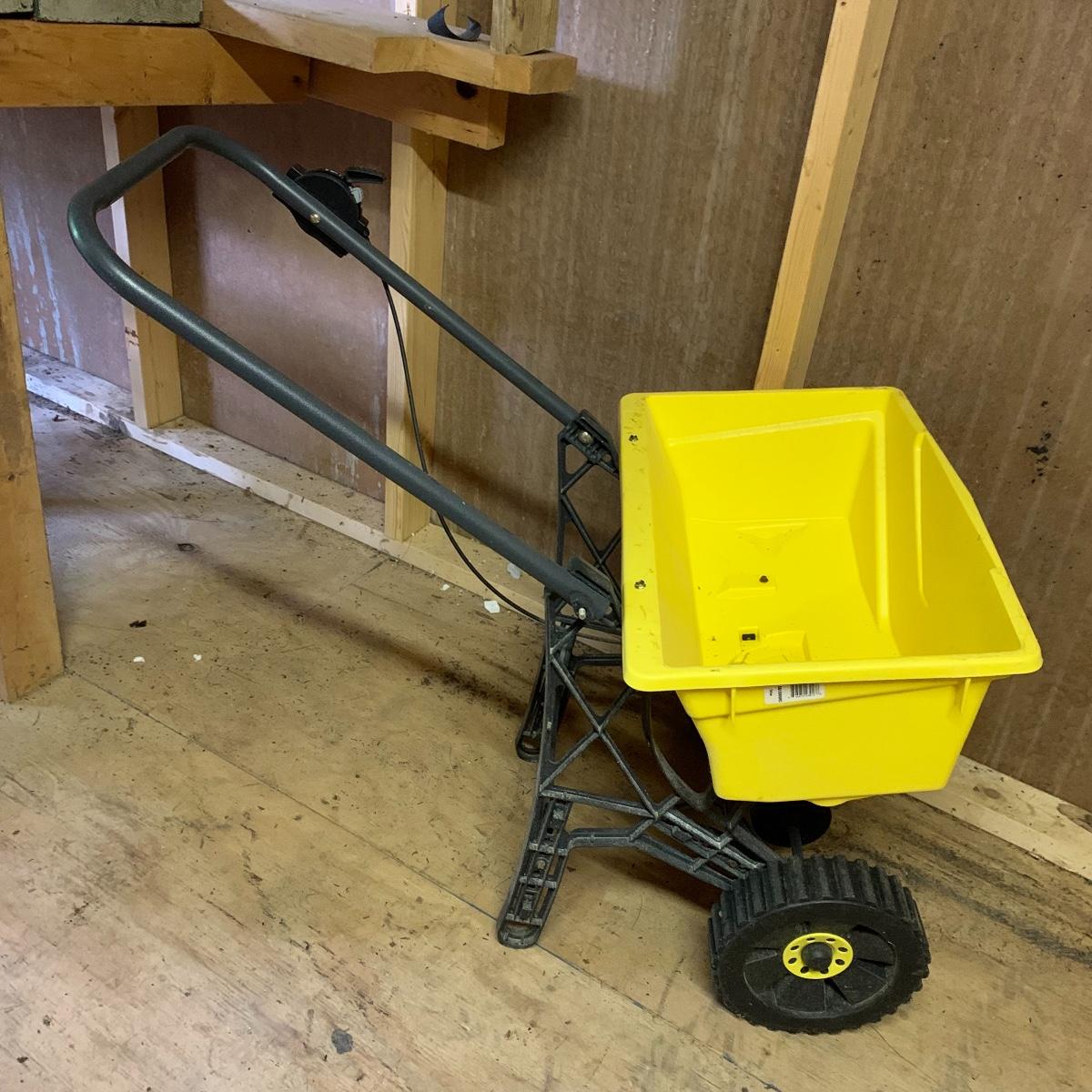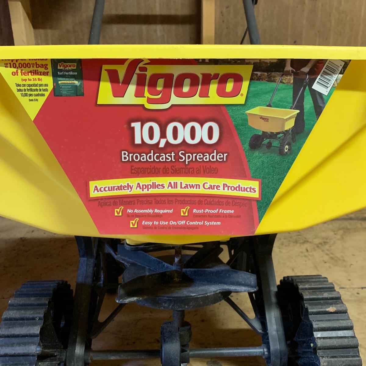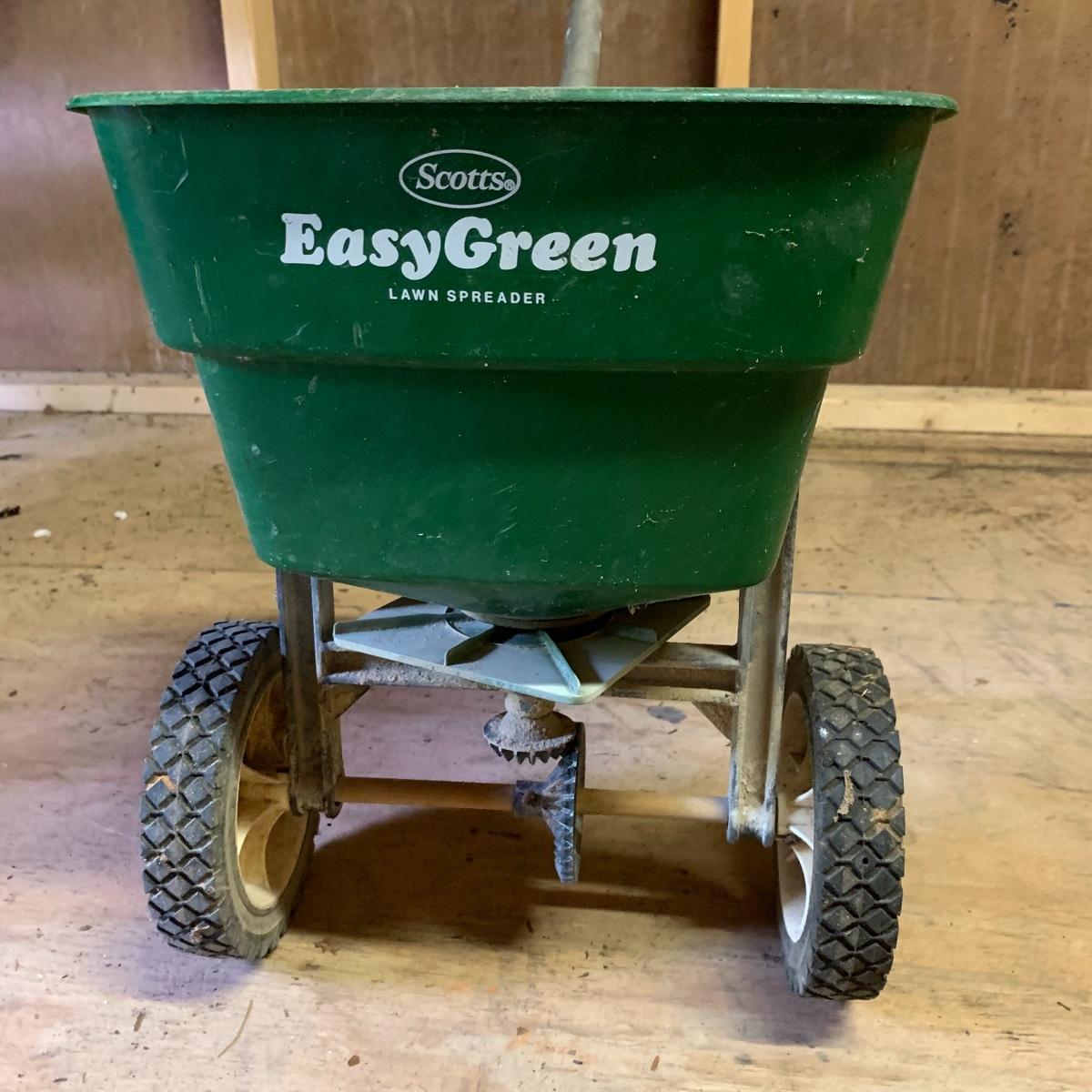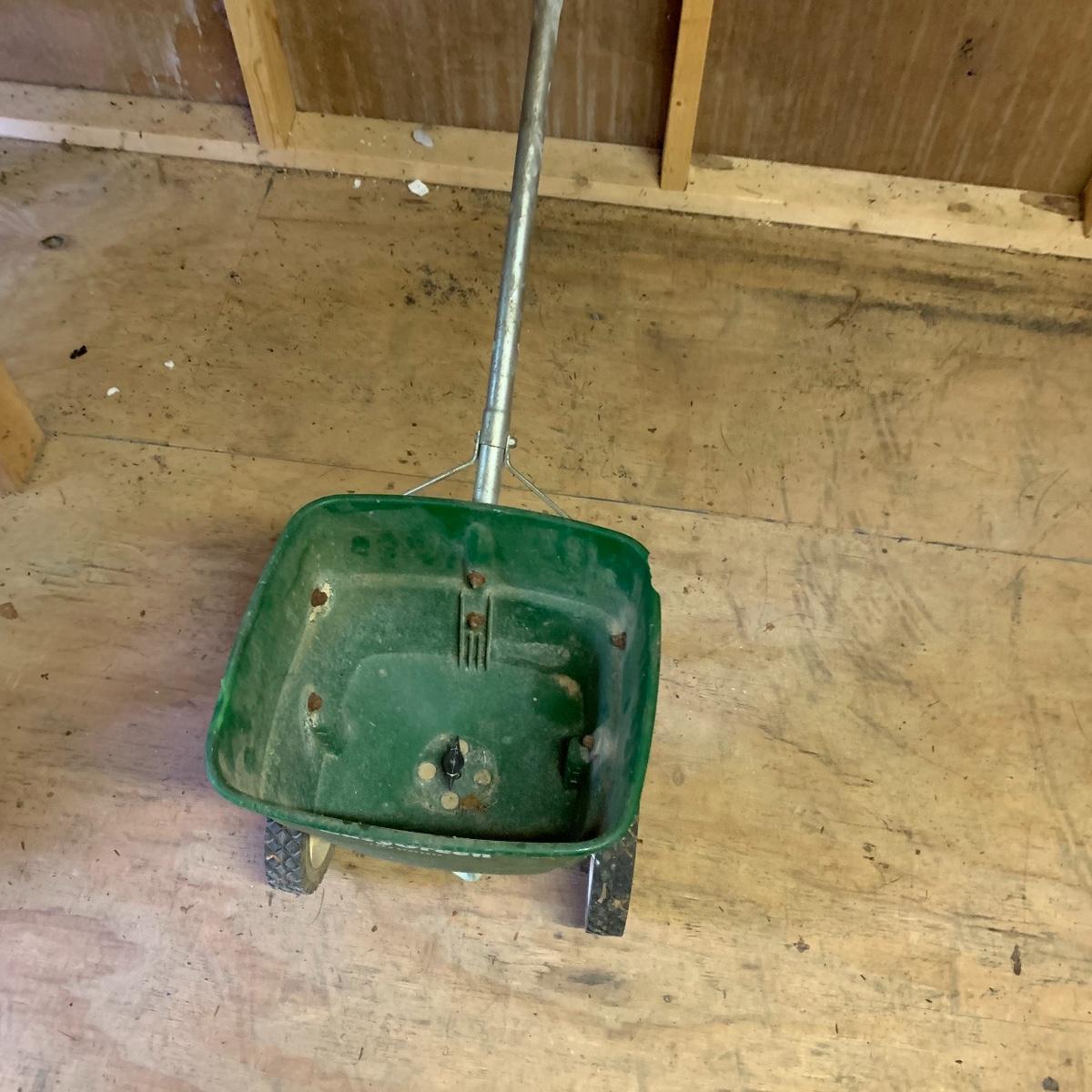 This lot contains two spreaders and and wheelbarrow. There is a yellow Vigaro 10,000 Broadcast Spreader that appears to be new or very gently used. From its longest points, it is 33” long and 32” tall. There is a smaller Scotts Easy Green Lawn Spreader that is in used but good condition. This one is 42” long from handle to front. And there is a nice big red metal wheelbarrow with wooden handles that appear to be in used but excellent condition. It measures 59” along the wooden handles to the longest point at the front. Local pickup only.