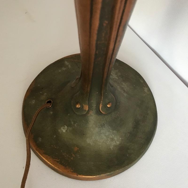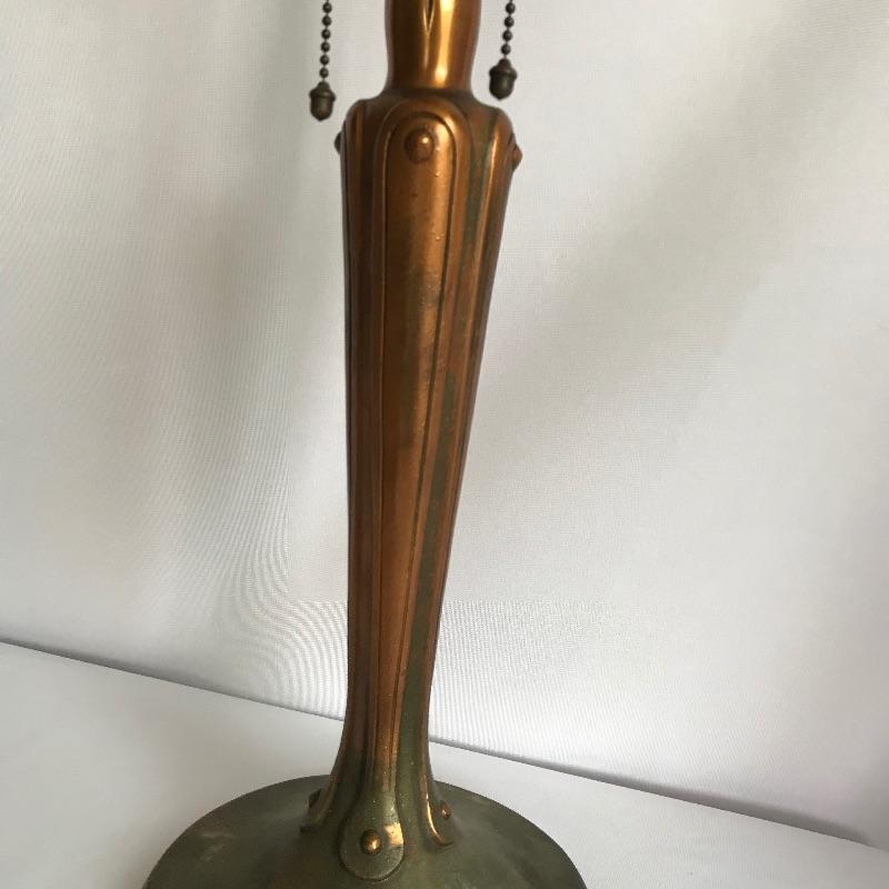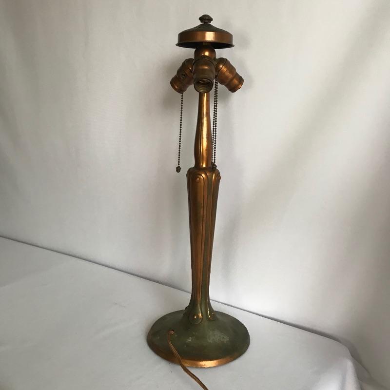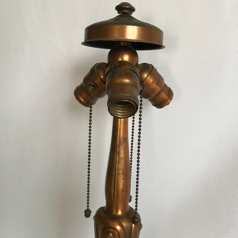 Handel Lamps Lamp perfect for a leaded glass slag shade with a beautiful copper color on its Art Nouveau style body. The color on the base is worn, but copper colors can be seen from the base to the top, including the sockets. The plug appears unsafe, but the cord is in great shape and all the pull strings operated the lights when tested. Top piece is easily removable for shade. Piece is in terrific shape over all and measures approximately 8”d x 24”.
