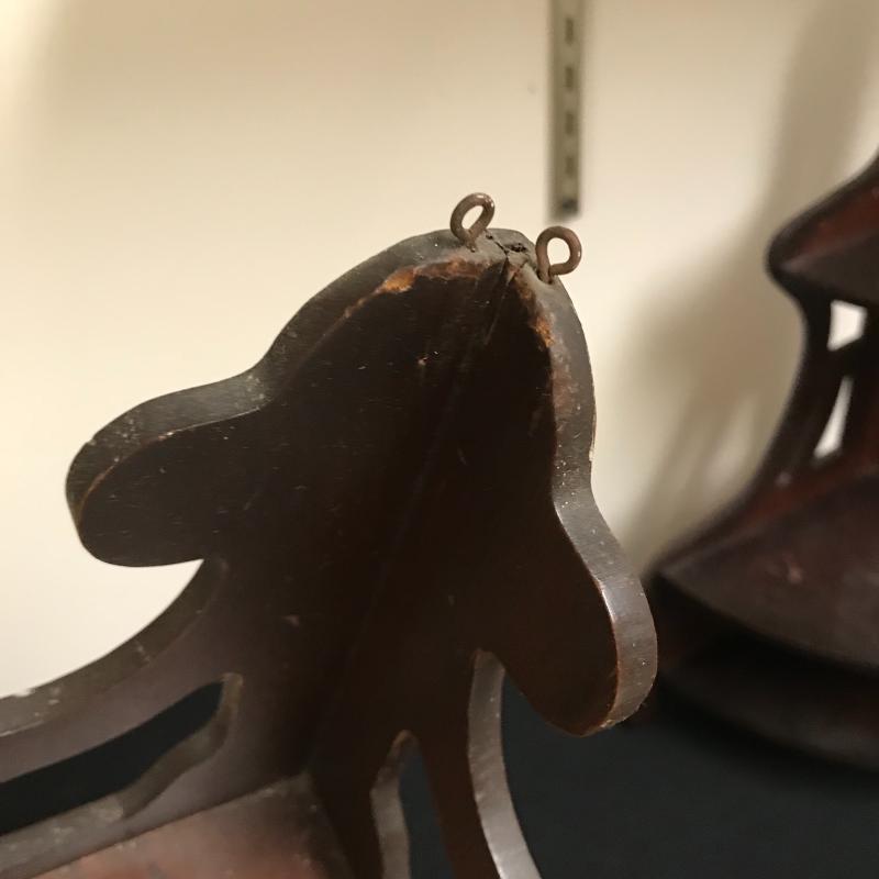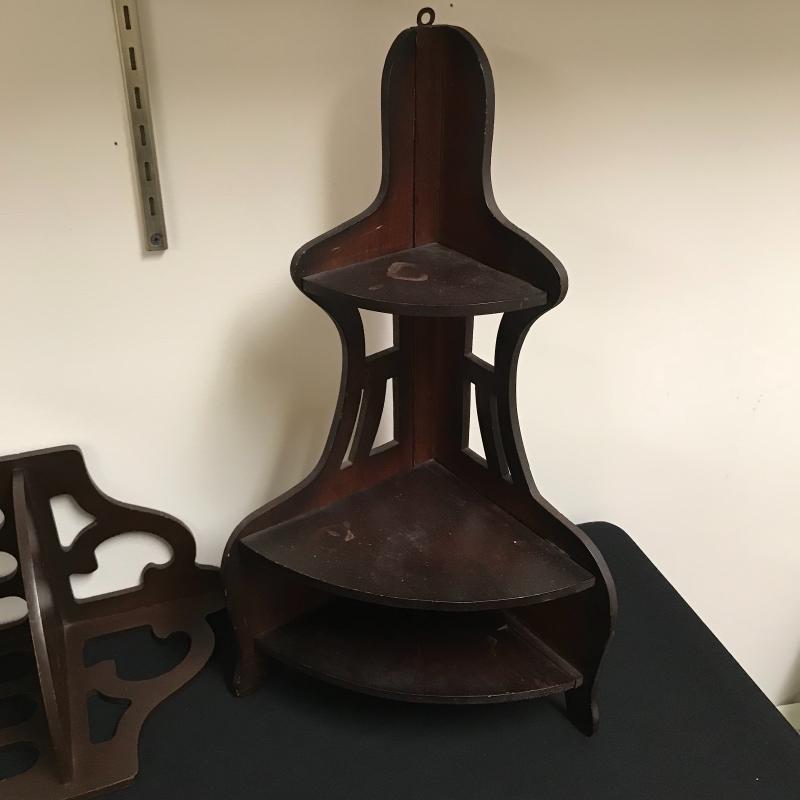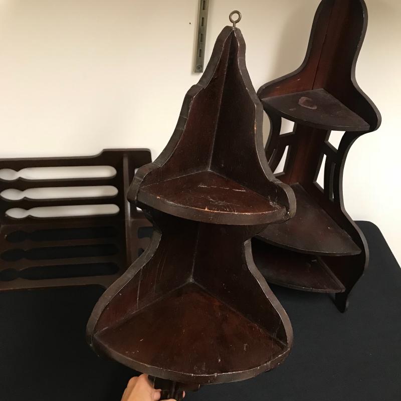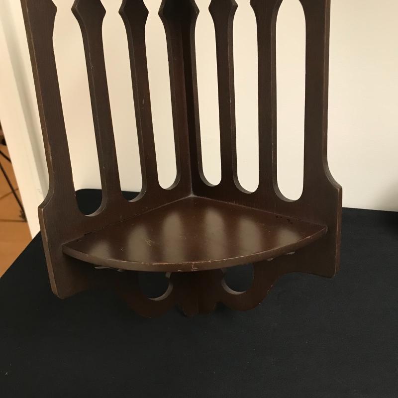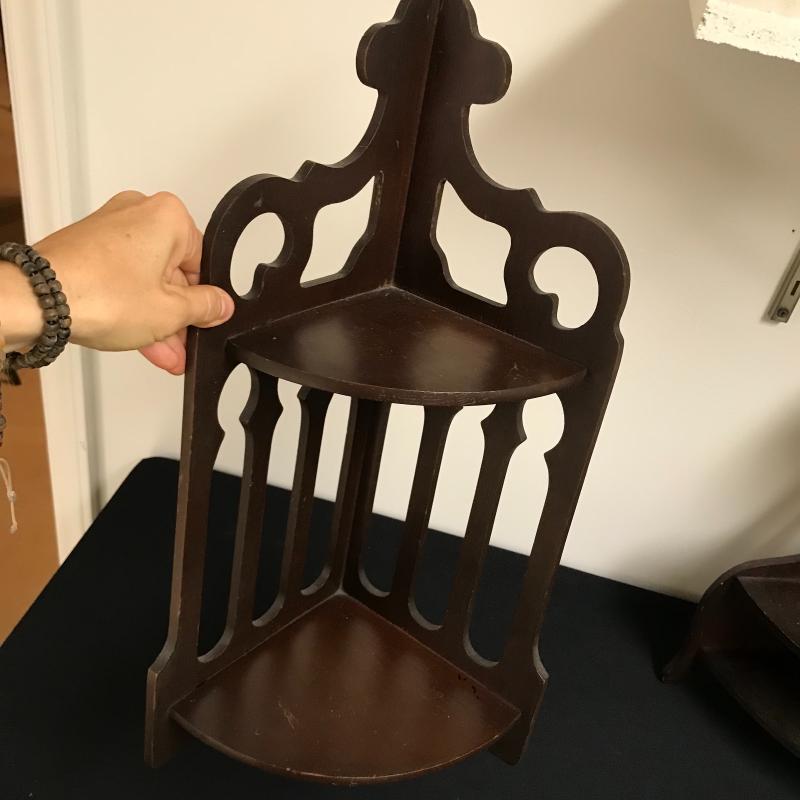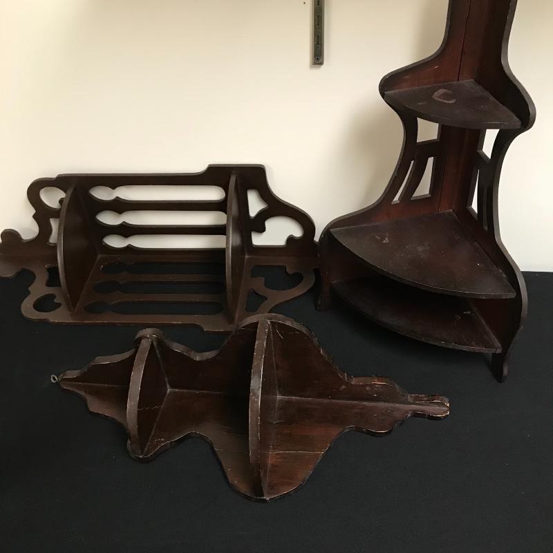 Lot includes three corner shelves with dark wood stain. Tallest is approx. 24”. See pics. Shipping available or local pickup in Arden, NC.